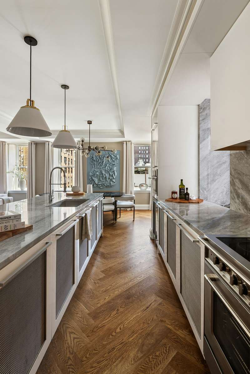Servicing the square 25-Foot Wide "Great Room", with regal beamed ceilings and paneling, is the open eat-in-kitchen that would inspire the most discerning chef. ; ;Barstools line up along the expansive overhang of the quartzite island, while custom-built, lacquered kitchen cabinets provide an abundance of storage. The Verona induction range vents externally, and an added Miele Convection/Microwave wall oven provides additional high-speed cooking/heating options. The Miele Dishwasher is disguised with beautiful cabinet paneling, and a side-by-side Gaggenau Refrigerator/Freezer offers very spacious storage, and there is also a separate wine fridge. This luxurious kitchen is part of an open, loft-like space (nearly 600 sq. feet) that includes the formal dining area and living room. ; Additional bells and whistles of the residence include: ; Solid 5" white oak hardwood floors laid in a handsome herringbone pattern, central air conditioning, and a separate windowed laundry/"Mud" room with a Bosch washer and dryer (a welcome and rare bonus!)