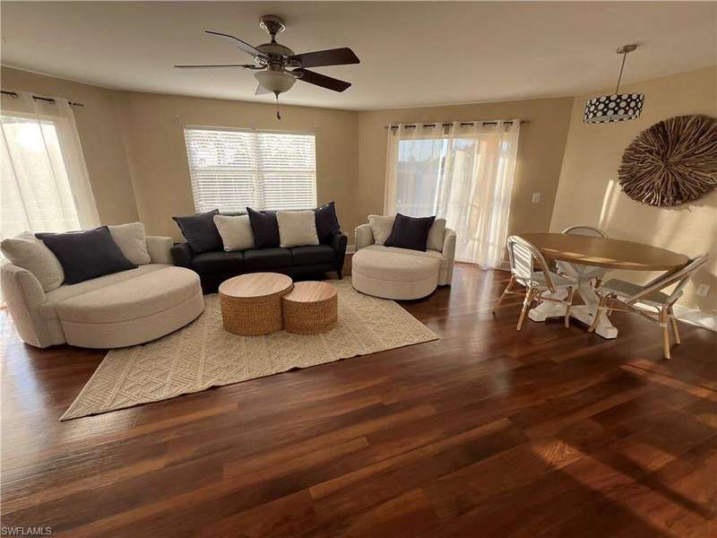LOCATION LOCATION - Experience the charm of this beautifully appointed 2-bedroom, 2-bathroom luxury condo apartment In Ideally situated just a short stroll from RUM RUNNER Marina/ Cape Harbour w 2 private lanais facing a pool backyard Oasis! Easy walking access to vibrant nightlife, exquisite , scenic waterfront dining opportunities in cape harbour The modern interior boasts granite countertops a thoughtfully designed split floor plan, and (2) private screened patios accessible from each bedroom. All Bedrooms and living room have ceiling fans. The patios offer stunning views of the expansive inground pool area below, which features comfortable (2) half moon semi circular sofas with firepit and tiki umbrella, outdoor shower, a dedicated golf Putting area, and a convenient barbecue grill for outdoor enthusiasts. A TRUE PARADISE and walking distance to SW Cape Harbour Cape Coral!! Off street parking plus BONUS garage space! Washer dryer in unit! Unique Benefits - -Cape Harbour Marina and Rumrunner. Short Walking distance (next door) -Airport 16 miles -Fort Myers Beach 13 miles -Cape Coral beach 4 miles -Sanibel Lighthouse beach 17miles -Jaycee park steps away Close to many bars and restaurants in downtown Cape Coral Tier 1, credit with proof of income