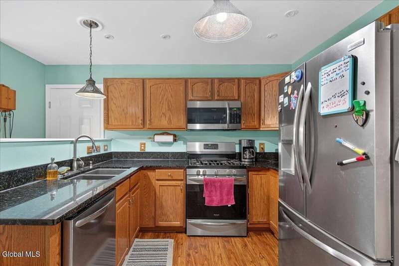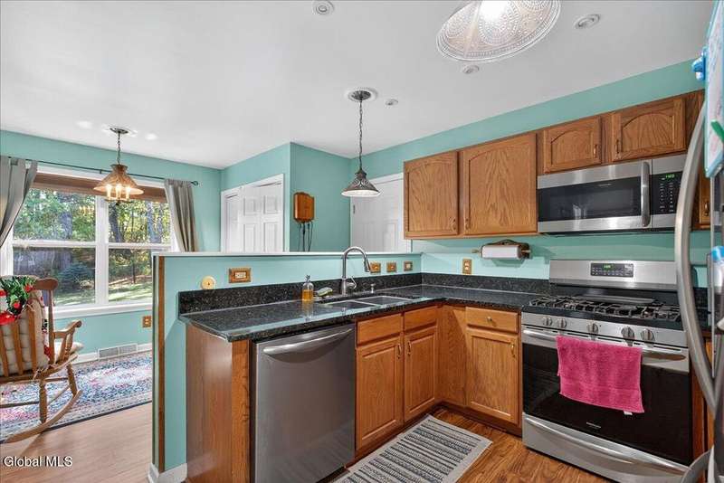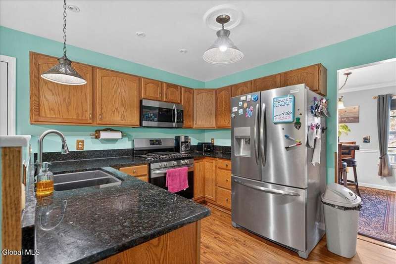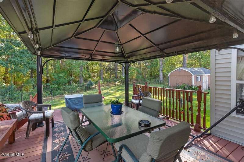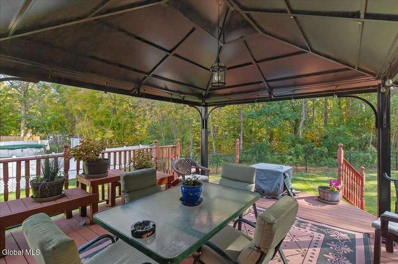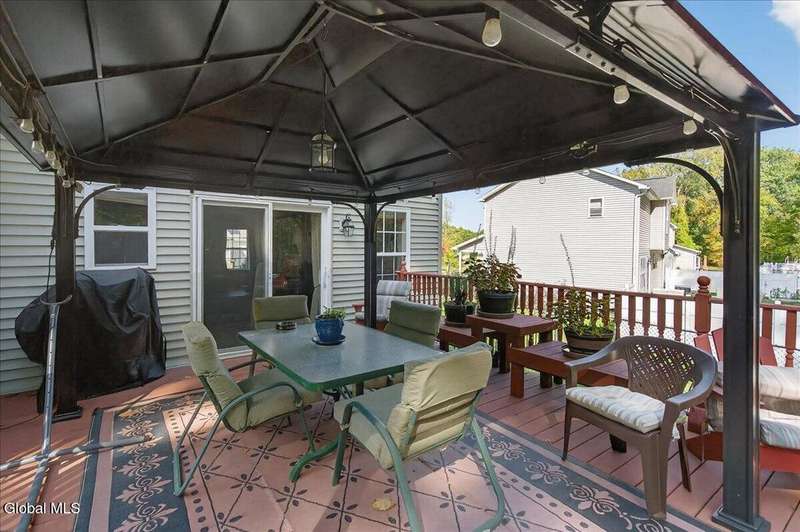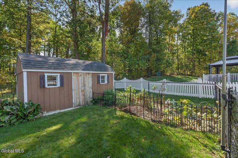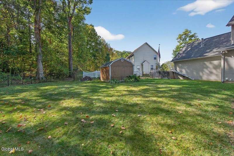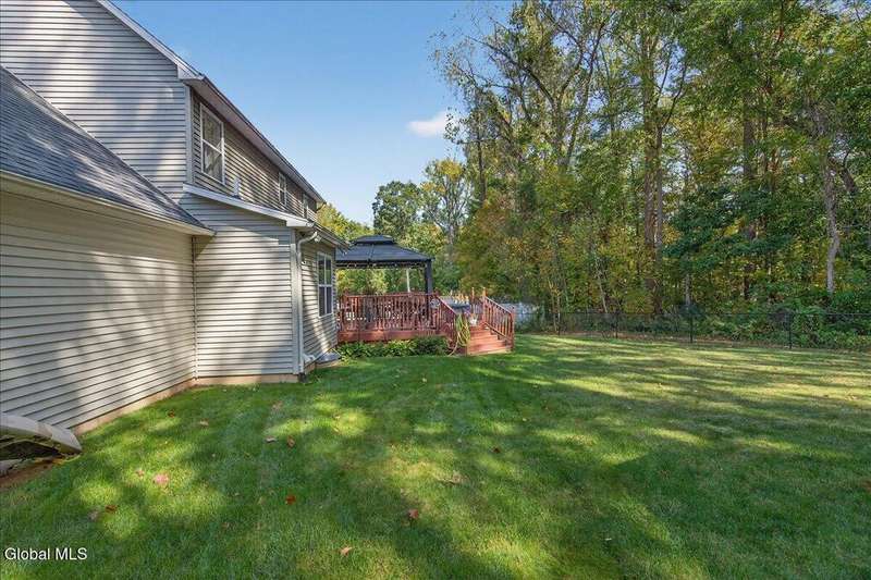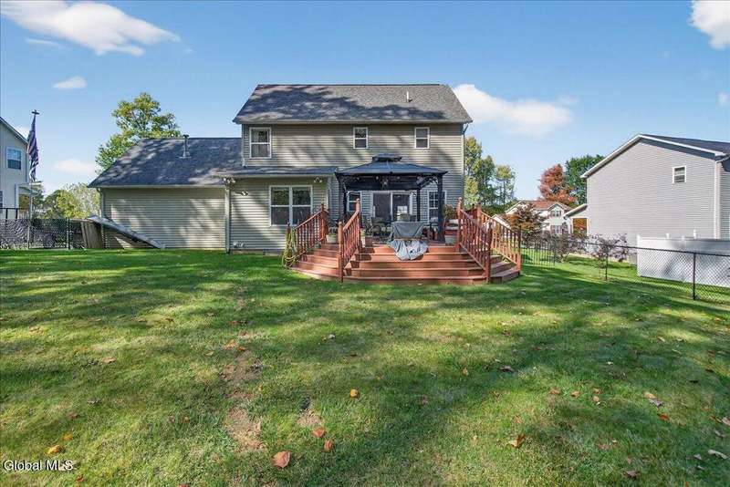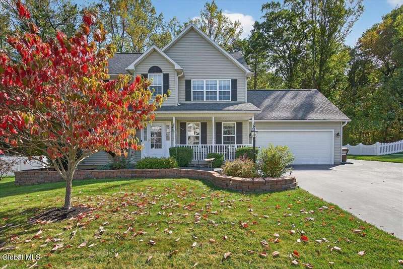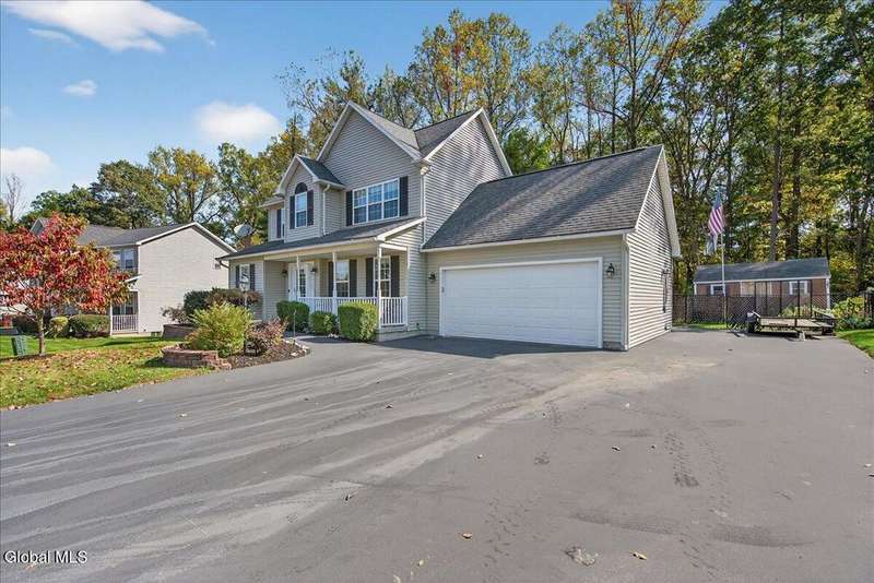 Welcome to this stylish Colonial, beautifully maintained and move-in-ready. Interior highlights include a spacious living room w/cozy gas stove and built-in surround sound?ideal for movie nights or relaxing evenings. The inviting kitchen features granite countertops, peninsula w/sink and stainless steel appliances including gas range, dishwasher, microwave and French door refrigerator. Enjoy breakfast in the sunny nook or intimate evening meals. The formal dining room is perfect for larger gatherings. A guest half bath and laundry round out the main floor. Upstairs offers a primary bedroom retreat with two walk-in closets. There's two additional bedrooms and main bath with plenty of closet space. Full basement provides ample storage or potential for additional living space. There's a 2-car garage w/opener and an extra paved area for RV parking, basketball, or additional vehicles. Enjoy all the amenities this home has to offer plus gas hot air heat, central a/c, public water and sewer. Set on .58 acres with a lot measuring approx. 77.9' x 220.2'. Entertain in style on the oversized 16' x 20' custom-built deck complete with pergola. The fully fenced, grassy backyard backs to a wooded area?ideal for pets or play. Use your green thumb and grow your own veggies in the fenced garden area with a 10' x 16' storage shed. Located just minutes from Thruway Exit 22, shopping, and schools?including the highly regarded Ravena-Coeymans-Selkirk School District. Schedule your showing today and start planning your holidays in your new home!