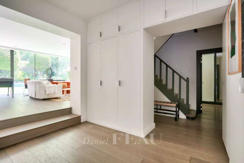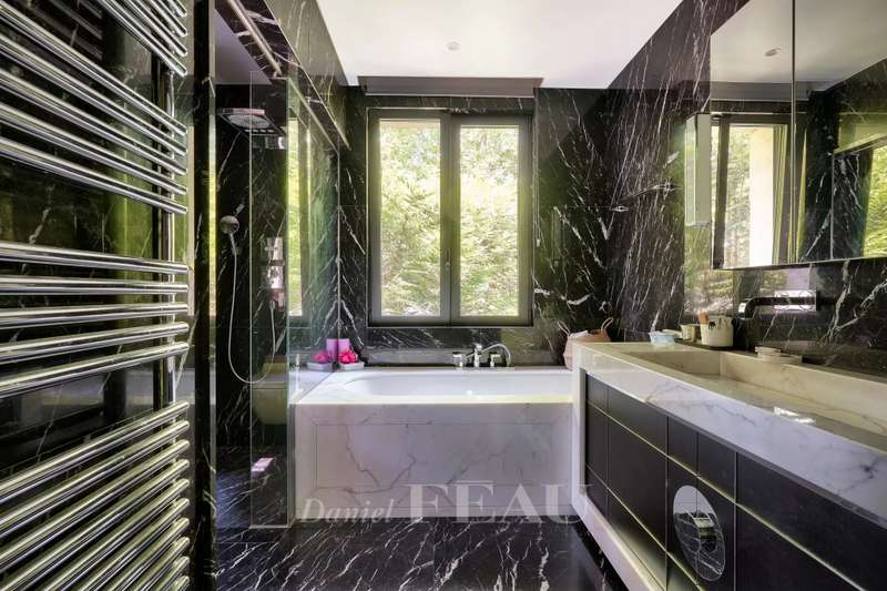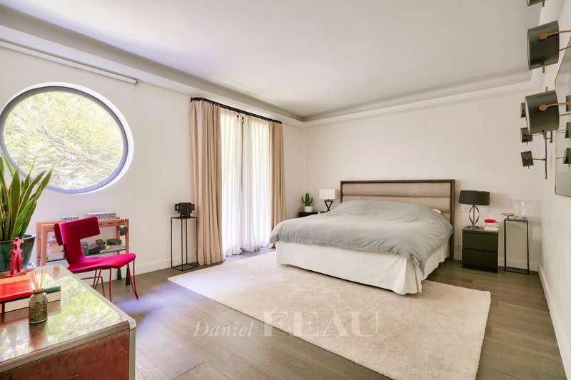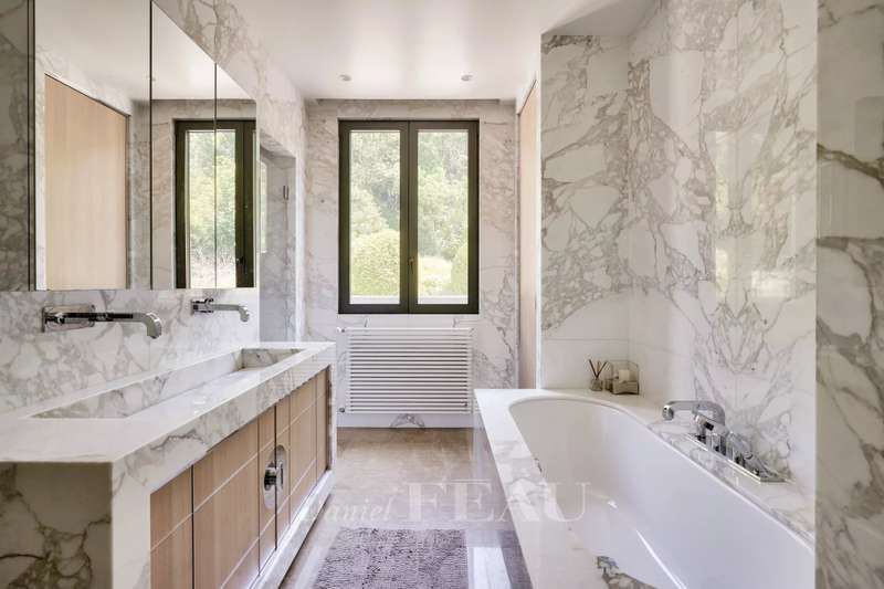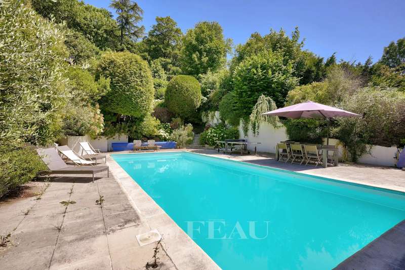 This architect-designed property set in 1700 sqm of leafy grounds with a heated swimming pool was renovated throughout in 2018. It includes an entrance hall with fitted storage space, a living/reception room bathed in sunshine, an equipped kitchen and dining room opening onto a terrace, a master suite with a bathroom and dressing room, a shower room and a utility room. The upper floor comprises three bedrooms (two opening onto balconies), a shower room and a separate wc. A spacious top floor room could create a study. With a maisonette and a studio apartment. Floor heating, alarm.