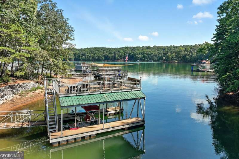 This rare Lake Lanier find offers 4 bedrooms, 4 full baths and 2 oversized bonus rooms making it the perfect retreat for entertaining, relaxing, and enjoying the lake lifestyle. To top it off, the owners are happy to include all the furnishings in the sale price! From the level driveway and inviting front porch, you'll step into a thoughtfully designed home with a graceful flow from the foyer and staircase into the family room, currently enjoyed as a recreation space, and then on to the great room with a cozy fireplace. A wall of windows frames sparkling lake views and draws you into the large, open kitchen with stainless steel appliances, granite countertops, and a bright breakfast area, while the separate dining room provides plenty of space for gathering with family and friends. The main level also includes a spacious suite with an oversized full, along with a convenient half bath and another full bath just off the kitchen for easy access after a day on the water. A large laundry room with sinks makes it simple to handle wet towels and lake gear. Upstairs, five generously sized bedrooms and a full bath provide comfortable accommodations for all your guests. The outdoor living is just as inviting, with an expansive screened-in porch overlooking the water, a side deck with connections for a hot tub in place and a separate grilling deck with ample space for outdoor seating. From there, it's just an easy walk to your private single slip dock with party deck and electricity, where you'll enjoy year-round deep water and wide, open views of the lake. Practical touches add even more appeal, including plenty parking space, two fenced-in yard areas, and a storage shed for all of your lake toys. Nestled on a quiet street, the property is just minutes from War Hill Park boat ramp, Athens Boat Club for gas and fireworks, quick access to Ga 400, Dawsonville shopping, restaurants, hiking, Dahlonega, and North Georgia's favorite wineries. With its blend of comfort, convenience, and its proven success as a short-term rental, this is a rare opportunity on Lake Lanier that you won't want to miss!