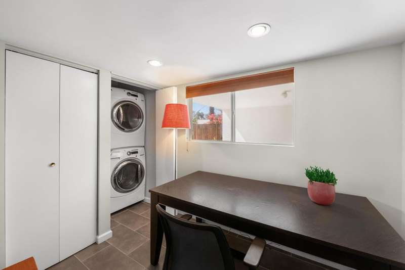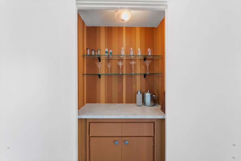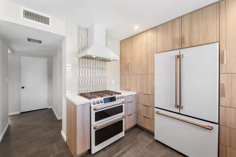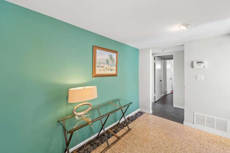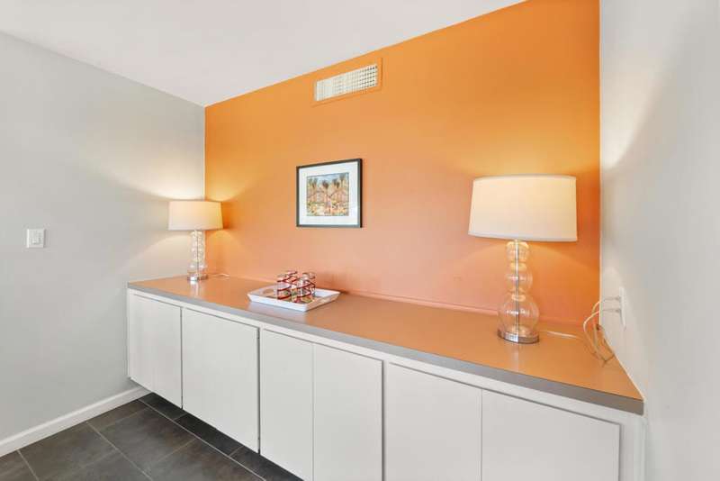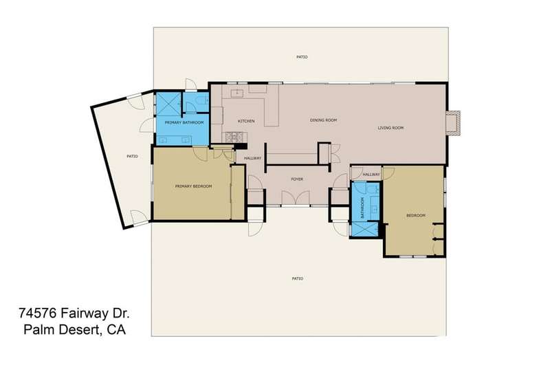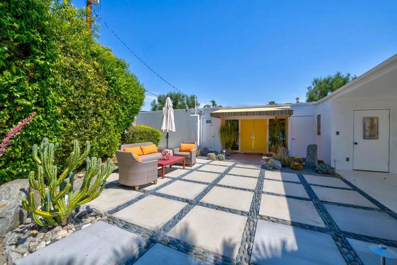 Classic 1960's Mid Century Gem in South Palm Desert. A welcoming courtyard opens to a double door entry foyer with original Terrazzo floor. Wall-to-wall sliding glass patio doors open to views of the sparkling pool and beautifully landscaped grounds. The open floor plan features a remodeled kitchen with sleek cabinetry, Quartz Countertops, Newport Brass fixtures and GE Cafe Appliances. The living/dining area has a Vintage Dry Bar and built-in buffet cabinet. 2BR/2BA Porcelain Tile floors throughout. The Primary BR, with en suite, has access to a private side patio. The 2nd BR has an office alcove. Both bathrooms were remodeled with tile showers and Quartz countertops. This is one of four Mid-Century Homes sharing the serenity of lush greenspace and mature landscaping. A beautiful swimming pool beckons fun and relaxation for those within this private enclave. This Mid Century Gem is offered furnished and ready for full-time or seasonal enjoyment.