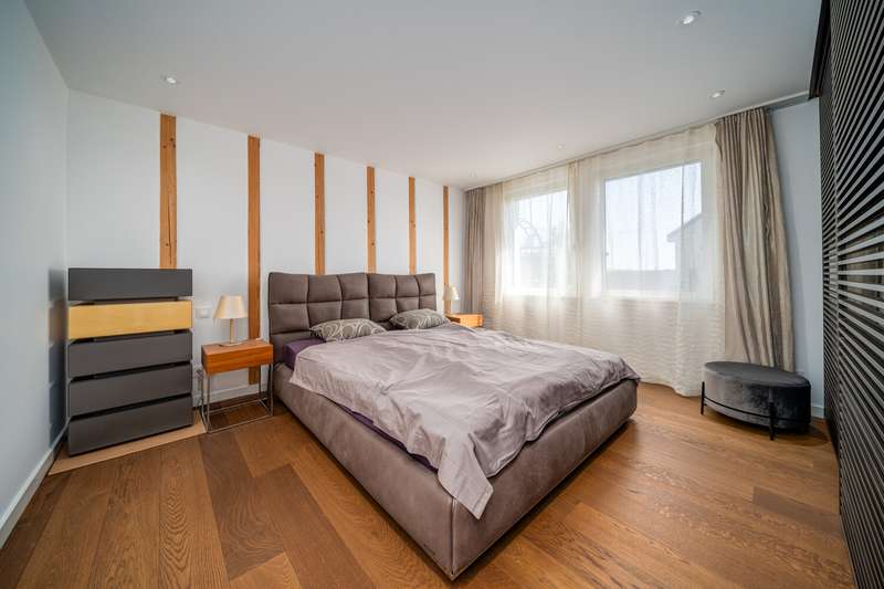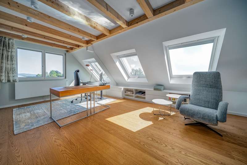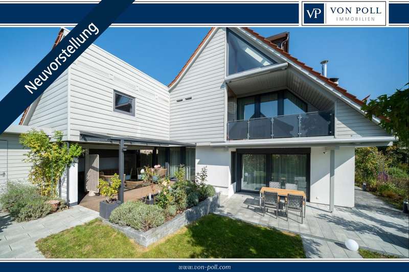 This exceptional detached house was extensively renovated in 2018 and is in mint condition. The property is situated on a plot of approx. 561 m² and offers a generous living space of approx. 307.21 m² spread over two floors. The property impresses with its open-plan living concept in split-level construction and thus combines two architectural principles: the openness and flexibility of an open floor plan and the interesting, often slightly offset structure of a split-level design. There are 8 rooms throughout the house, 4 of which are bedrooms, consisting of a master suite, guest room and 2 bedrooms or studies on the ground floor and first floor. The high-quality kitchen with cooking island is cleverly connected to the living and dining area by the open floor plan. On the ground floor there is underfloor heating that can be controlled room by room. There are radiators on the upper and lower floors. A new dormer window was built on the top floor and the gallery was extended, from where you can enjoy a fantastic view over Lake Constance. Custom-made carpentry can be found throughout the house, including bookshelves, shoe cupboards, wardrobe and shelving in the fireplace room. Following this extensive renovation, this beautiful property meets sophisticated standards of living comfort, functionality and design. The house has two balconies, one of which is covered and offers a beautiful view of the garden and the lake. The garden has two spacious terraces that can be used in a variety of ways. The water feature and outdoor lighting are particularly noteworthy. Additional living comfort is provided by electric shutters and a modern alarm system, which ensure a high level of security. There are also two wall boxes outside for safe and convenient charging of your electric car. The exquisite location in a developed residential area combines a pleasant neighborhood with optimal infrastructure. Shopping facilities, public transport and leisure activities are just a few minutes away, ensuring a high quality of life. Here you are purchasing a detached house that harmoniously combines a sophisticated living ambience, modern technology and high-quality fittings. The property is perfect for a family who value quality living with efficiency and comfort and are looking for a home that meets the demands of modern everyday life. For further information or to arrange a viewing appointment, please do not hesitate to contact us. Take the opportunity to see the benefits of this home for yourself.