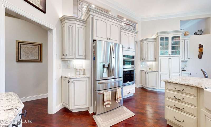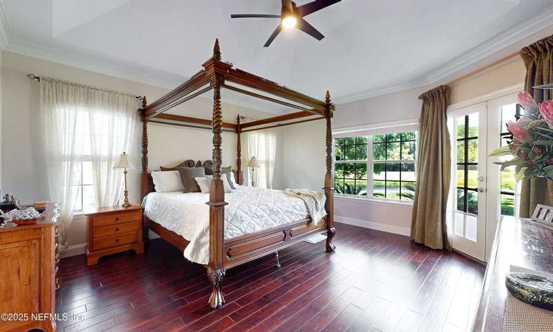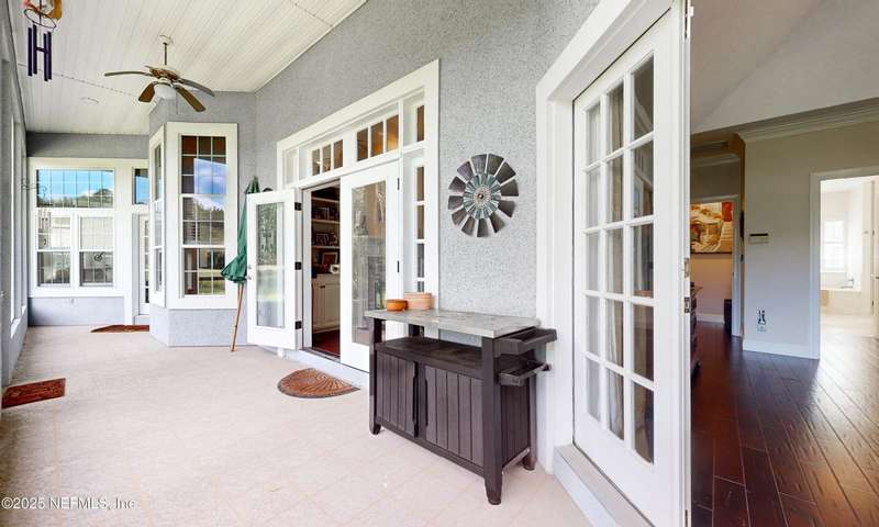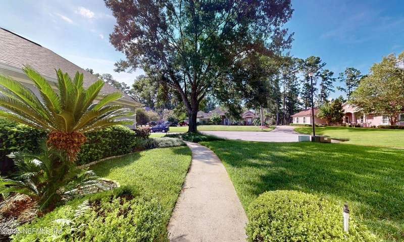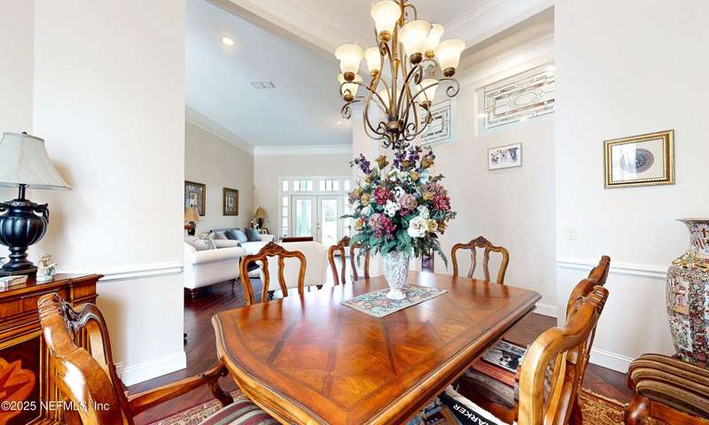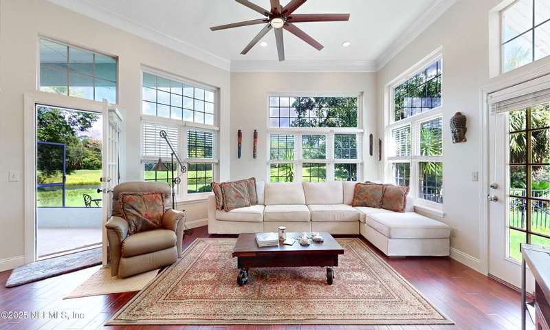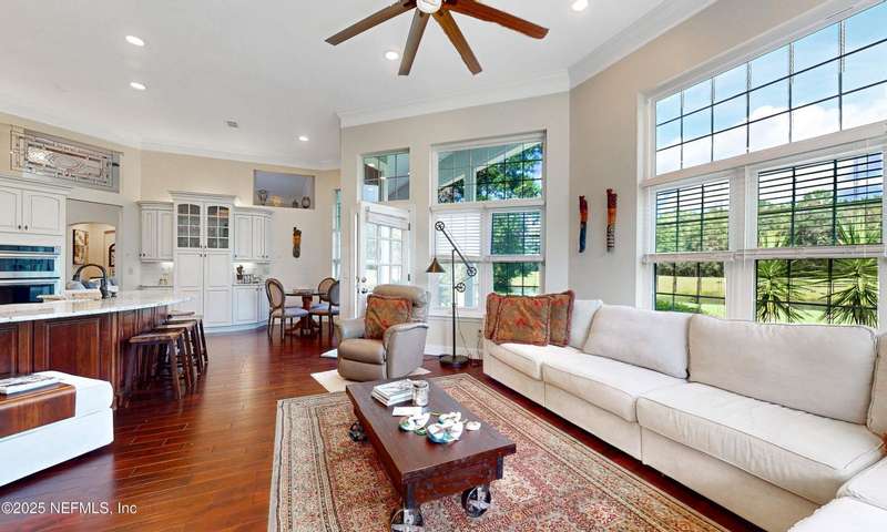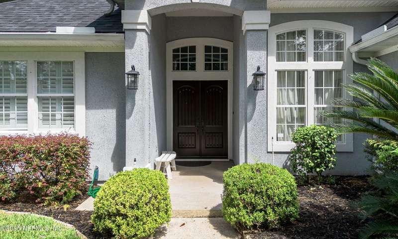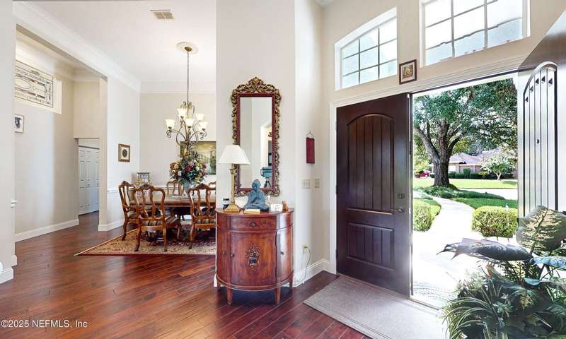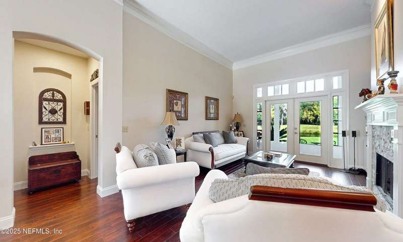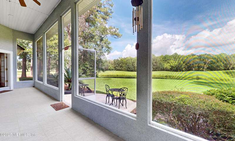 GATED COMMUNITY Truly a one of a kind, well maintained, beautiful home w/ a magnificent waterfront view. The eye-catching details start at the new double front doors then you are awed by the 12-foot ceilings, wood floors & that view! The living room has a gas fireplace w/ access to the screened lanai & views of the water & course. The spacious dining room is ready for all your holiday gatherings. The kitchen is sure to delight any chef with Kraftmaid cabinets, eat-in nook, gas stove, farmhouse sink & built-in oven & microwave. The family room has panoramic views of the water & course w/ access to the screened lanai. The bedrooms are a 3-way split floor plan. The primary suite is like a private oasis w/ a jetted tub, walk-in closets, custom double vanity, tray ceiling, access to the lanai & a peaceful view. Bedroom 2 located off of the family room & has its own dedicated bath. Bedrooms 3 & 4 are down a separate hallway w/ 3rd bathroom. Bedroom 4 is used as an office (no closet) You will love the huge laundry room with extra cabinets and mud sink. There is also a 2-car garage and a fenced side yard for your little ones or your furry friends. Amenities include frisbee golf, pools, tennis courts, pickle ball, 24hr guarded gate and playground. RV parking and stables are offered nearby with easy access at Spencer Farms. Make sure you check out the website for Orange Park Country Club for more info. Roof was replaced in September 2024. This is not your average home- come see for yourself!