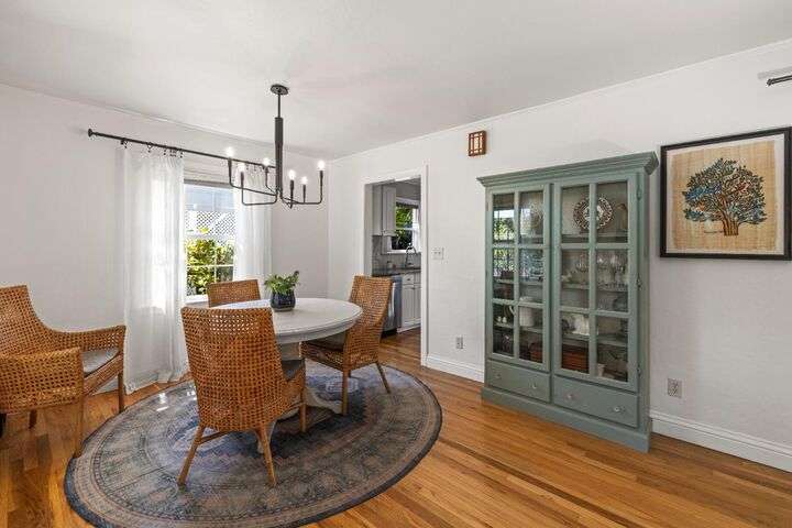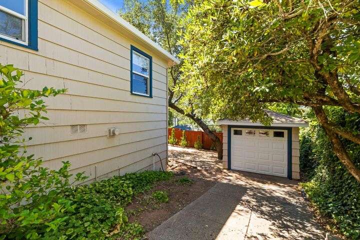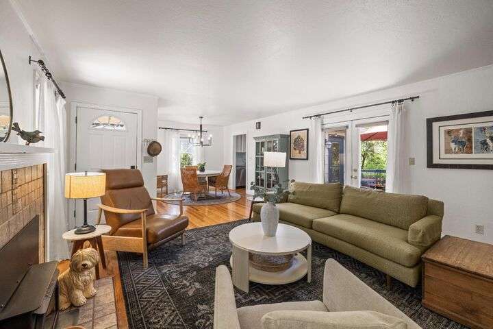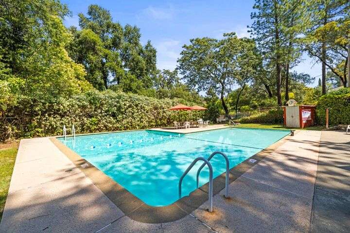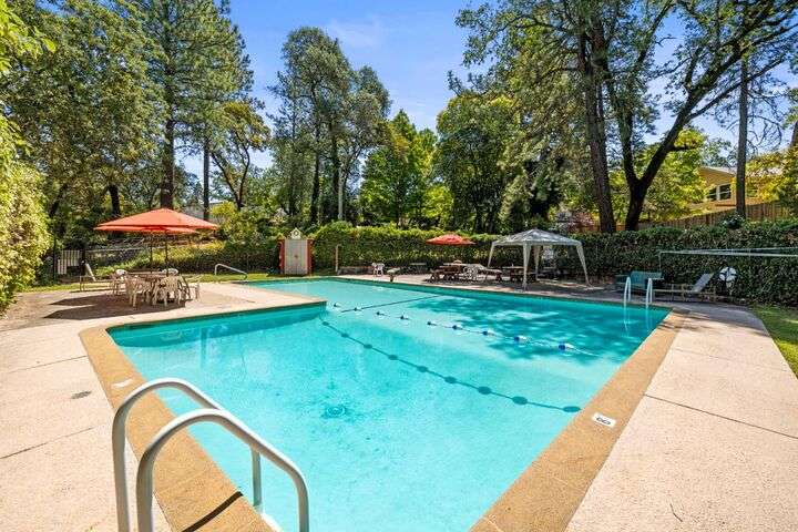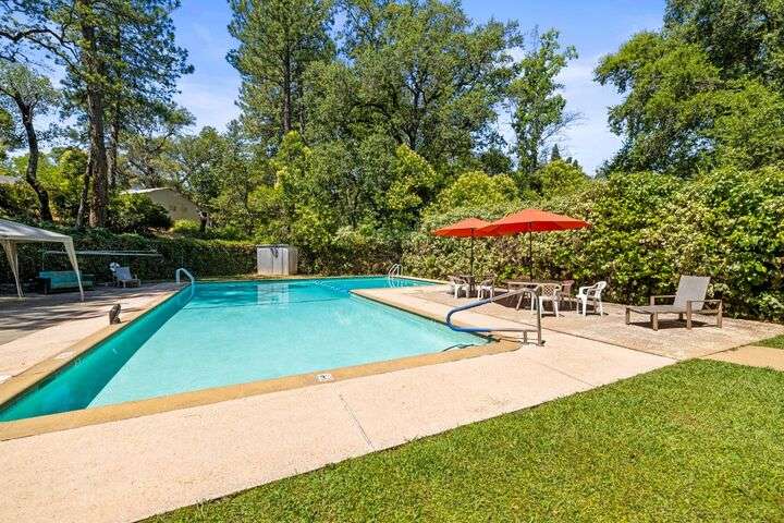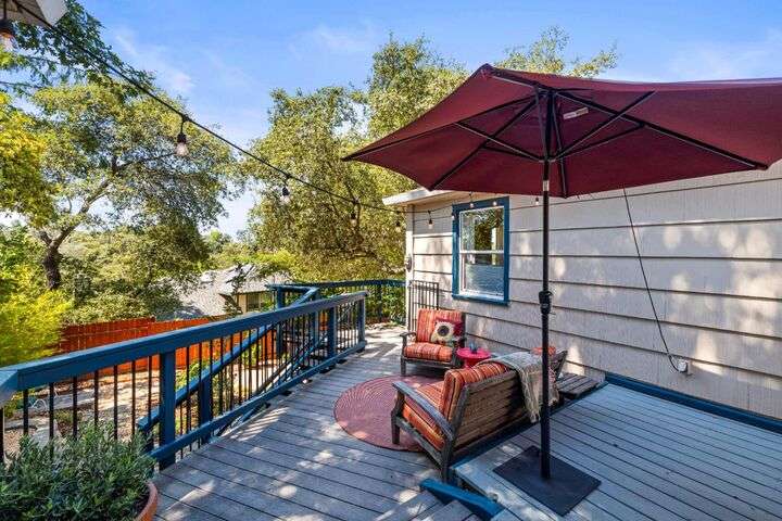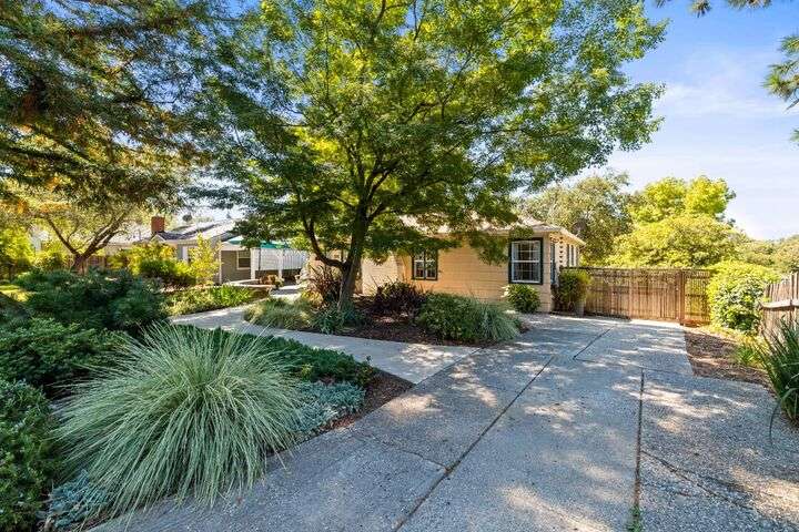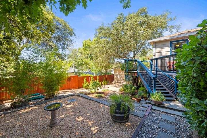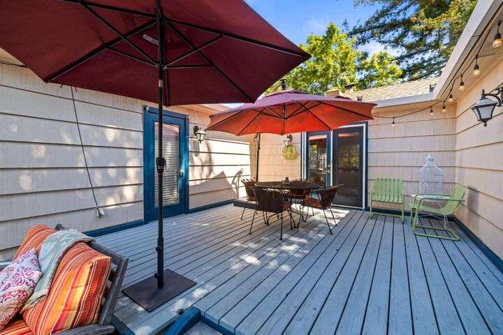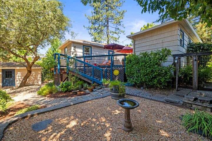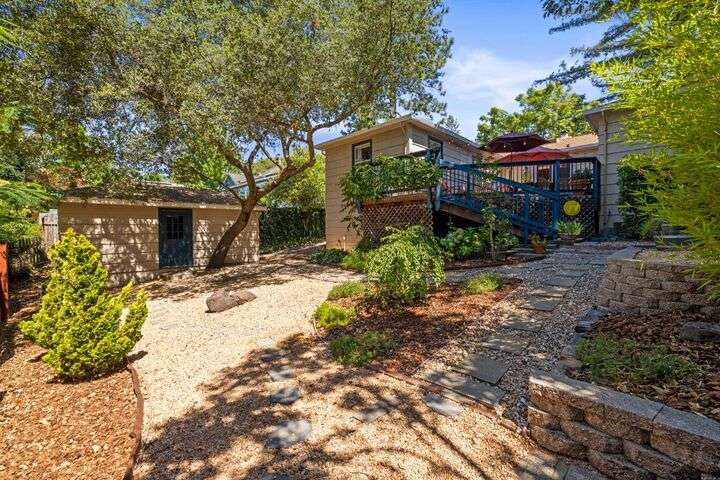 Terrace Street is back on the market! Magic location per the local genre-and you will agree as you approach the tidy front yard and carefully chosen plantings guarded by a towering Redwood tree offering shade and history. Step into this one level home onto genuine wood flooring revealing the spacious living/dining area, adjacent to the kitchen and access through french doors to generously sized deck. It welcomes you to the lower back yard of trees and plantings. The bedroom wing - think U shaped plan - is accessible from the deck also and on the opposite side is the kitchen where you could enjoy breakfast. Upgraded counters & sink are valued additions. The long gated driveway could store an RV, boat or? The garage may have a new life as an ADU? Under house storage a plus. The community pool is a definite asset and just steps away as well is a walking trail. This is a setting that you will want to call home.