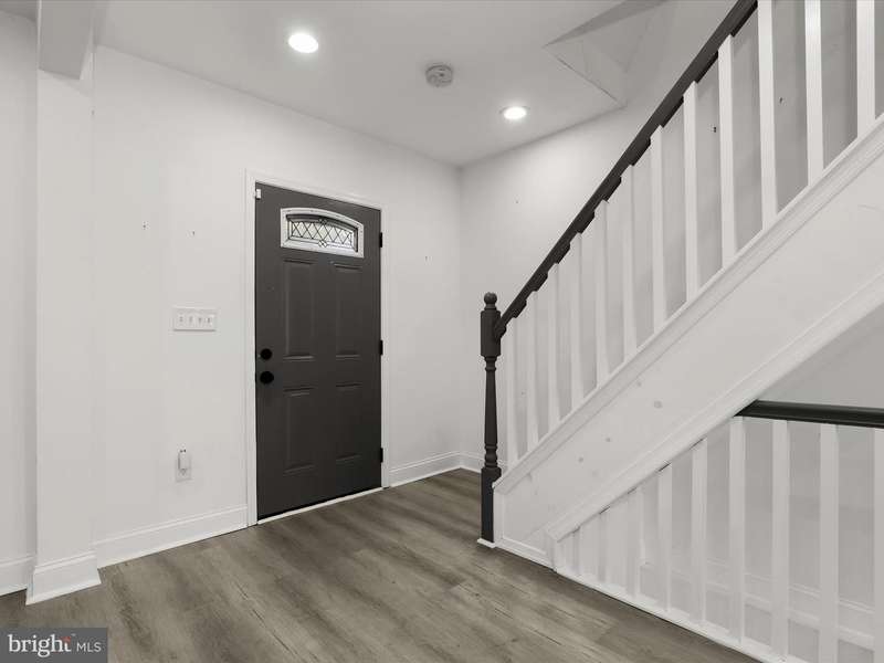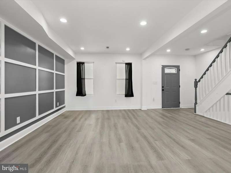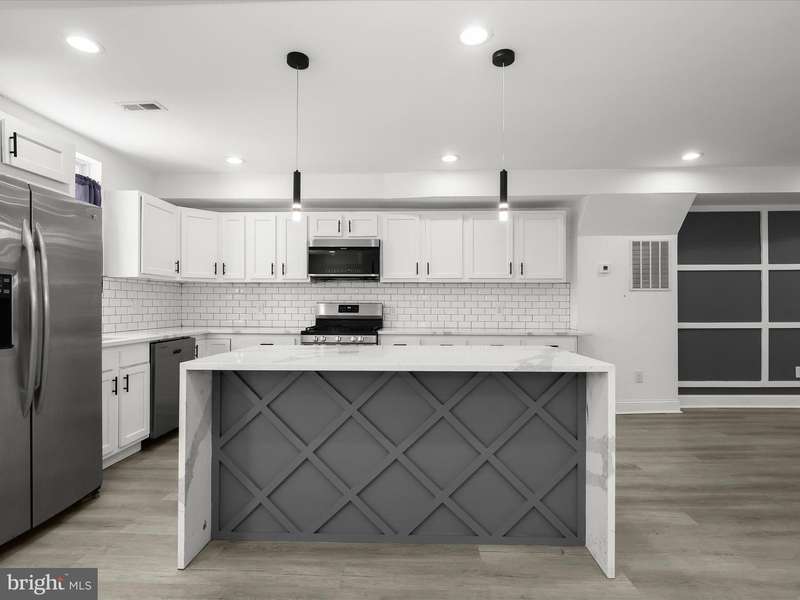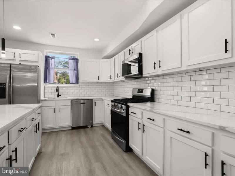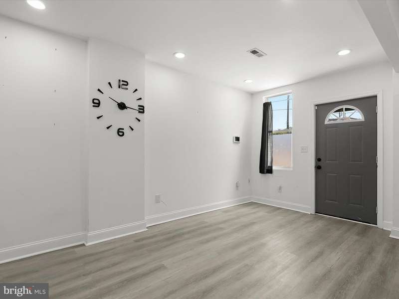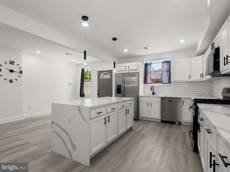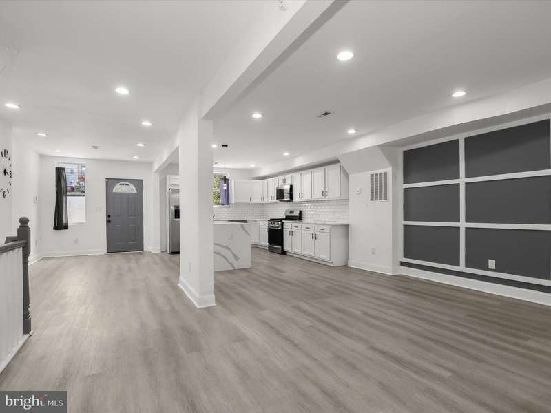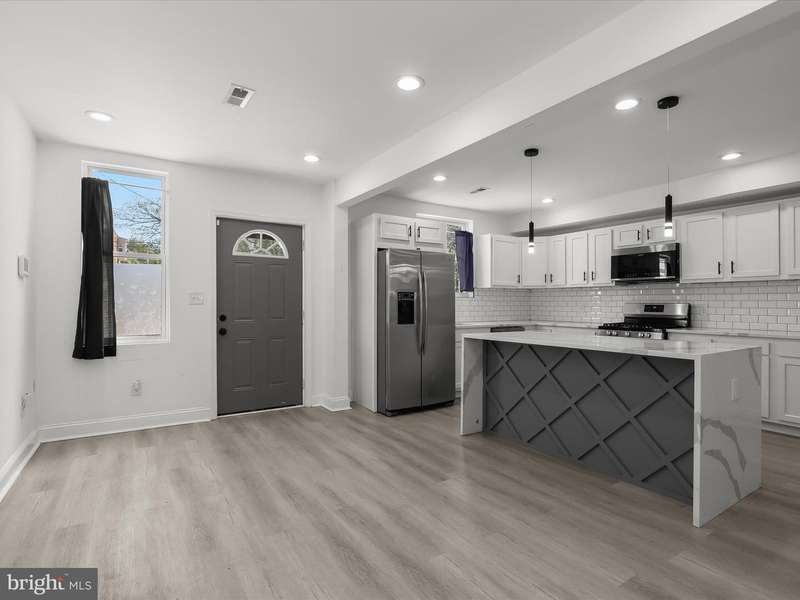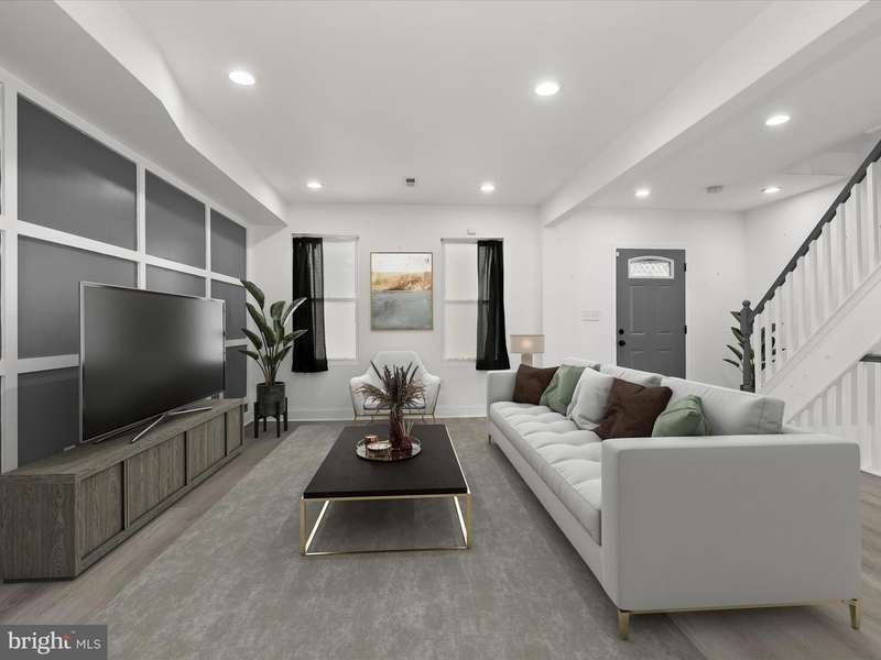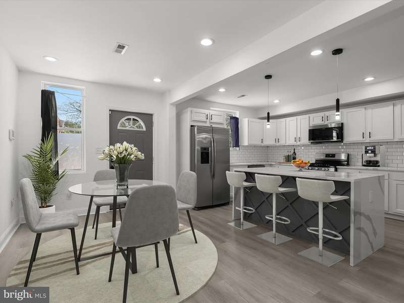 This beautifully renovated 4-bedroom, 3-bath rowhome blends modern style with everyday comfort. A covered front porch welcomes you into a thoughtfully updated interior featuring an open floor plan, luxury vinyl plank flooring, and a fresh neutral color palette. The main level offers a spacious living room with recessed lighting and a decorative grid-panel accent wall, flowing seamlessly into the dining area. From here, step out to a private rear courtyard-ideal for outdoor dining or relaxing in warmer months. The updated eat-in kitchen stands out with white cabinetry, stainless steel appliances, quartz countertops, and a classic subway tile backsplash. A center island with waterfall-edge countertop and seating adds both function and style. Upstairs, the primary suite includes a full bath with a tiled tub/shower combo and a separate walk-in shower. Two additional bedrooms, a second full bath, and a laundry hookup add convenience. The finished lower level offers a versatile recreation room, a fourth bedroom, and a third full bath-perfect for guests or extra living space. With easy access to public transportation, I-95, and I-695, this move-in ready home offers excellent value with its quality upgrades and ideal location. Note: Select interior photos have been virtually staged