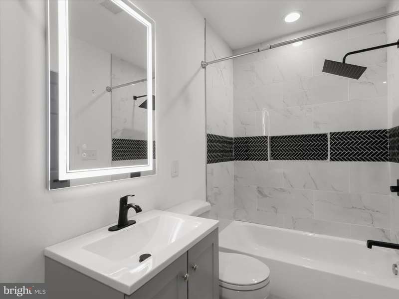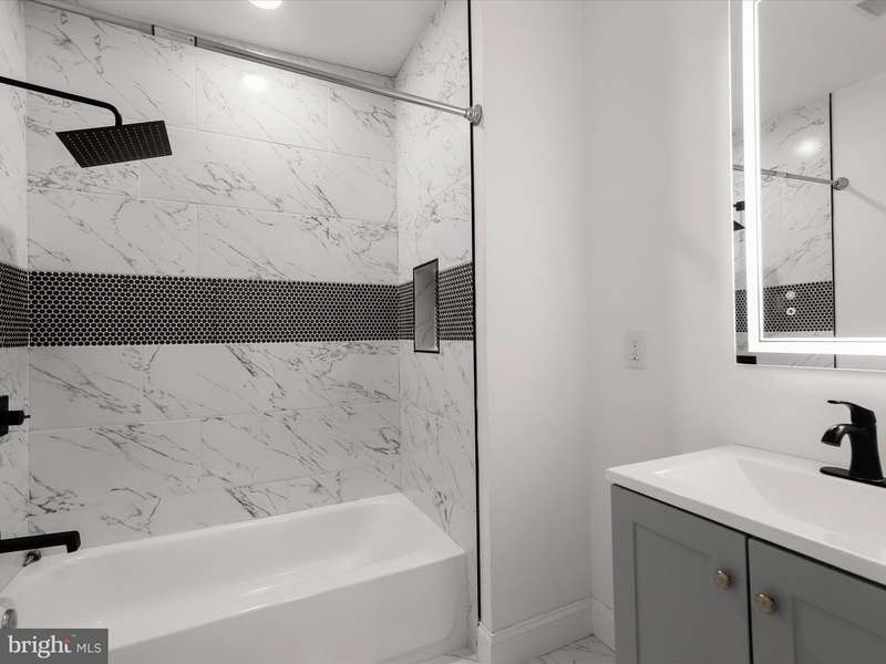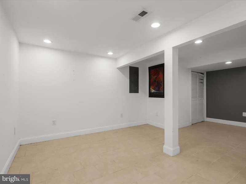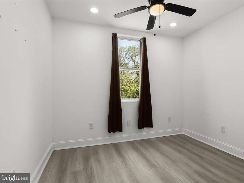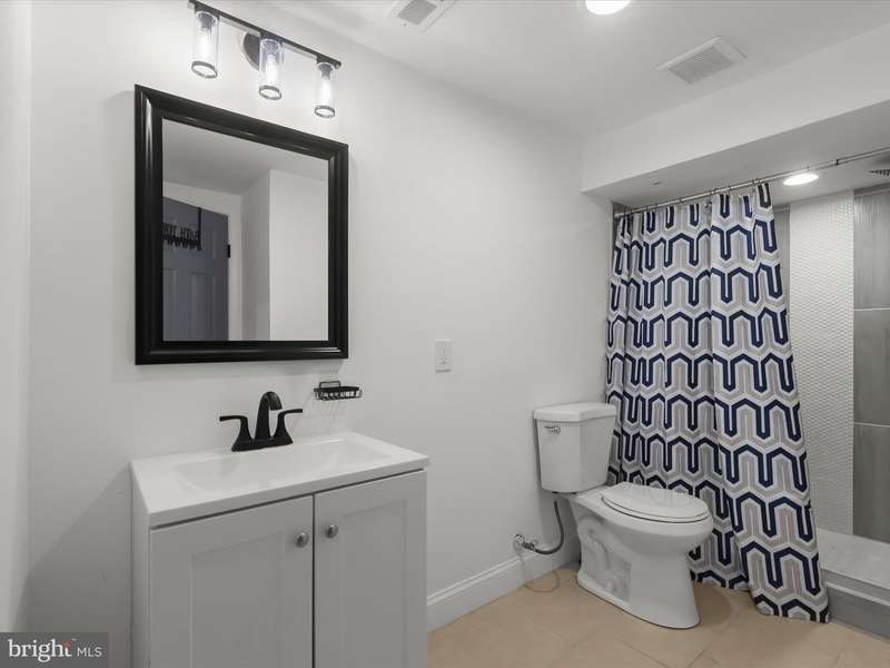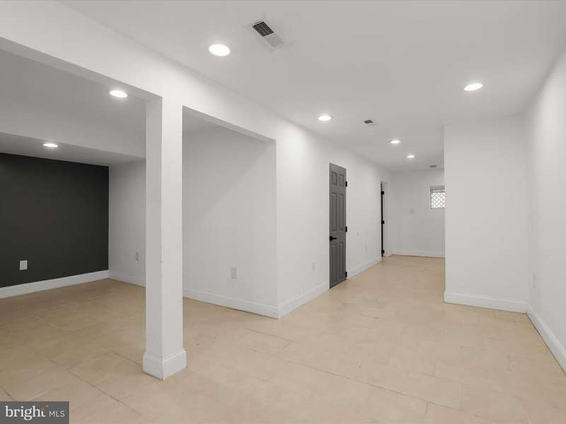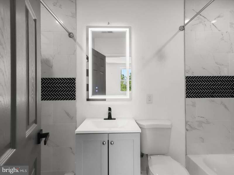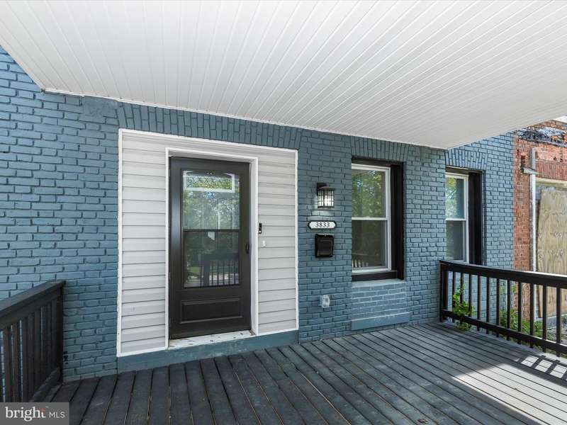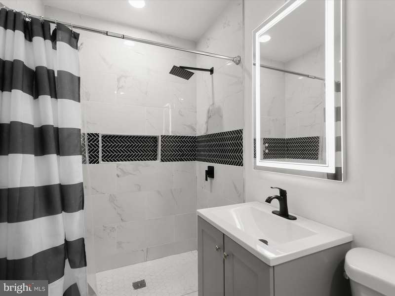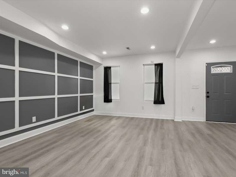 This beautifully renovated 4-bedroom, 3-bath rowhome blends modern style with everyday comfort. A covered front porch welcomes you into a thoughtfully updated interior featuring an open floor plan, luxury vinyl plank flooring, and a fresh neutral color palette. The main level offers a spacious living room with recessed lighting and a decorative grid-panel accent wall, flowing seamlessly into the dining area. From here, step out to a private rear courtyard-ideal for outdoor dining or relaxing in warmer months. The updated eat-in kitchen stands out with white cabinetry, stainless steel appliances, quartz countertops, and a classic subway tile backsplash. A center island with waterfall-edge countertop and seating adds both function and style. Upstairs, the primary suite includes a full bath with a tiled tub/shower combo and a separate walk-in shower. Two additional bedrooms, a second full bath, and a laundry hookup add convenience. The finished lower level offers a versatile recreation room, a fourth bedroom, and a third full bath-perfect for guests or extra living space. With easy access to public transportation, I-95, and I-695, this move-in ready home offers excellent value with its quality upgrades and ideal location. Note: Select interior photos have been virtually staged