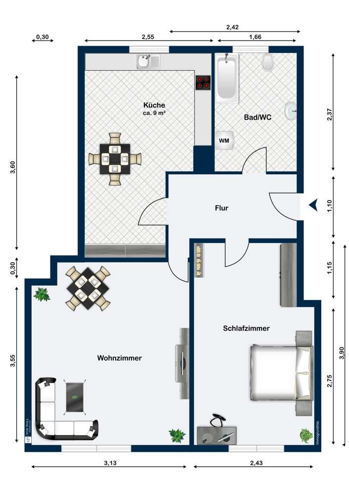 First occupancy after renovation: The apartment will be handed over freshly renovated and will be available from January 15, 2022. The 2-room apartment has a living room and 1 bedroom, a kitchen including a fitted kitchen (plus 25 € / month) and a bathroom with a bathtub. All rooms are accessible from the hallway. (Pictures in the unrefurbished condition!)