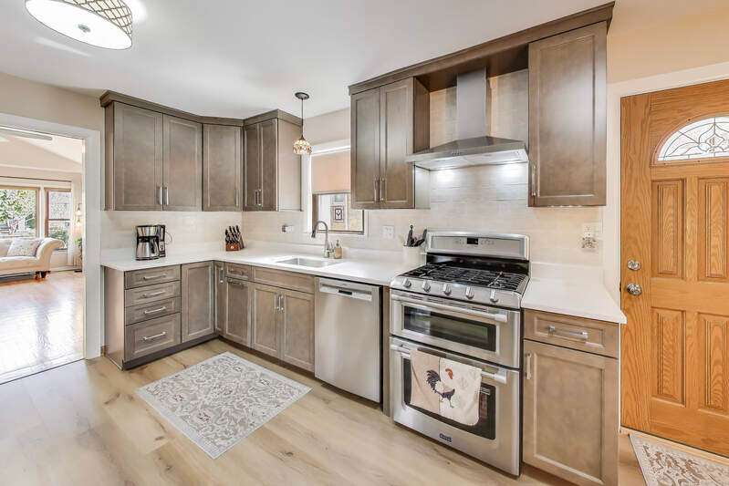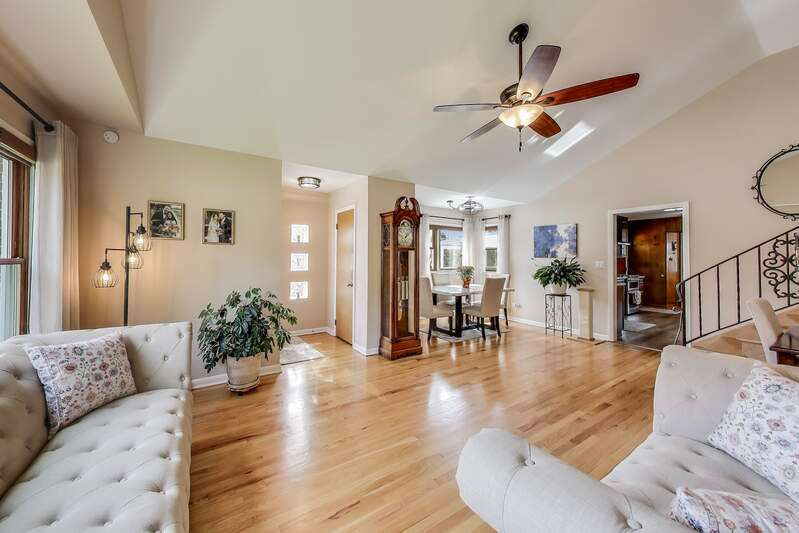 Welcome to this beautifully reimagined split-level home, over 2,100 sf and nestled in the heart of the highly sought-after Cumberland Village neighborhood-where style, comfort, and an unbeatable location come together effortlessly. Step inside to a truly stunning, bright, and open floor plan that seamlessly connects the spacious living room-with its soaring vaulted ceilings-to the dining area and show-stopping kitchen. Thoughtfully designed as the heart of the home, the newly renovated kitchen is both stylish and functional, perfect for everything from everyday meals to unforgettable gatherings. Enjoy brand new cabinetry, sleek quartz countertops, stainless steel appliances, elegant lighting, and tasteful hardware-all curated for modern living. Natural light pours into the main living spaces through oversized windows outfitted with custom blinds. Refinished hardwood floors flow beautifully throughout the main level, creating a warm, cohesive ambiance that instantly feels like home. Upstairs, refinished hardwood floors lead the way to a large primary bedroom and two additional bedrooms that share a full bathroom. The main level offers even more versatile living space with a cozy family room featuring the same flooring as the kitchen providing one continuous flow, a gas fireplace with stone surround, corner windows for added sunlight, and a second full bathroom. A generous utility room and large rec room with full bath rounds out the living space! Outside, the backyard is a private, fully fenced oasis-lush, serene, and ideal for year-round entertaining. The large patio provides plenty of room for dining and lounging under the stars. This home has been meticulously updated from top to bottom. A large concrete driveway leads to a detached 1.5-car garage and convenient carport, offering ample storage and everyday convenience. Located in a top-rated school district, and near parks, Metra and the charm that downtown Des Plaines has to offer. Welcome Home!