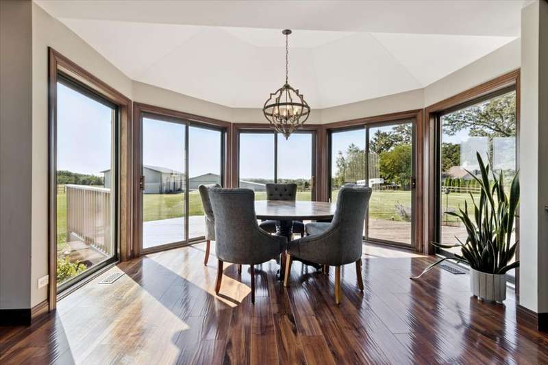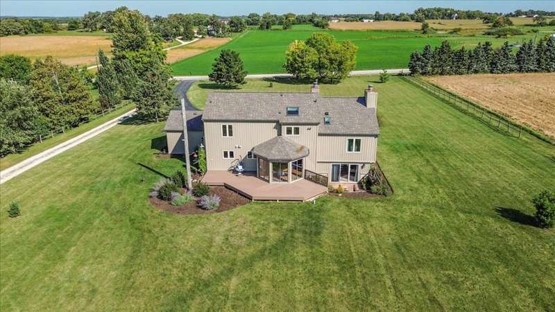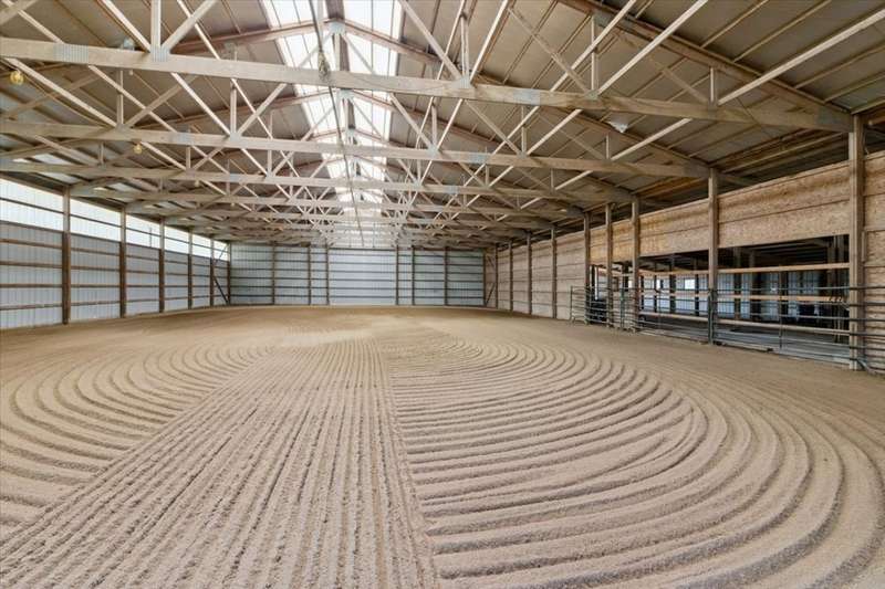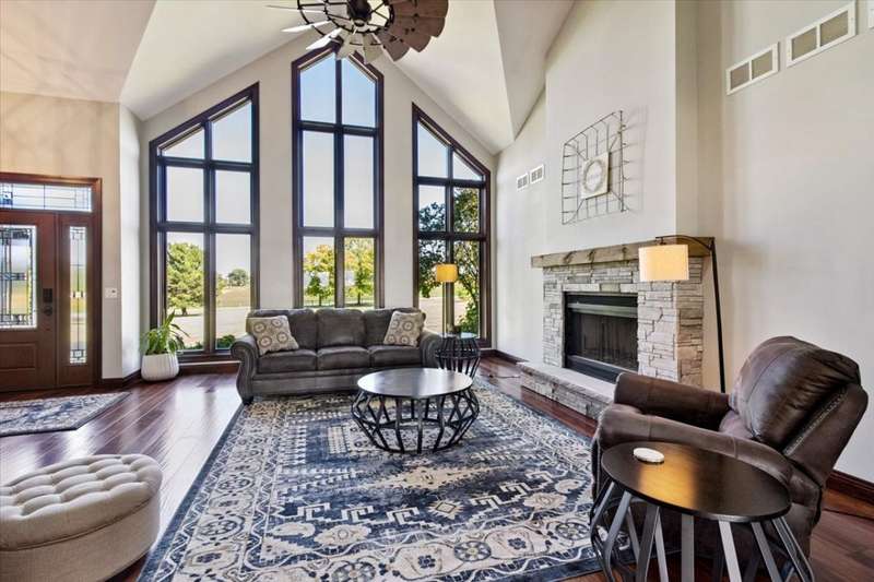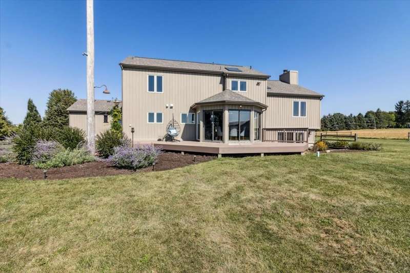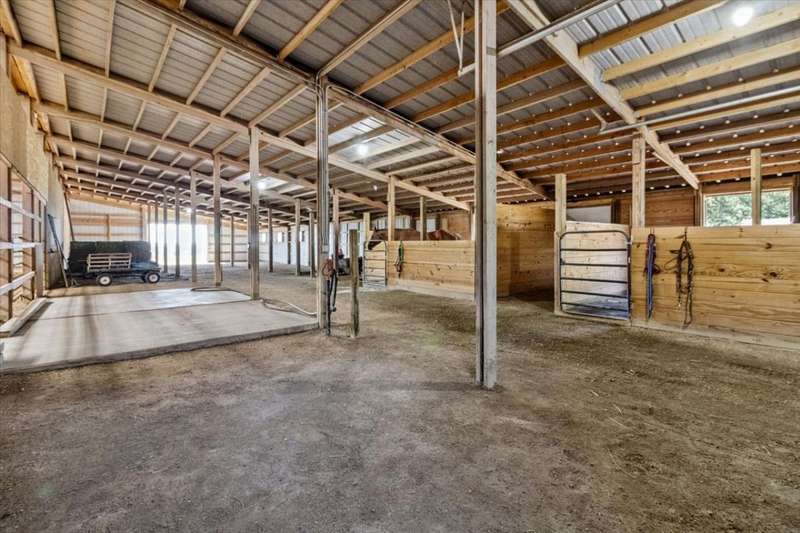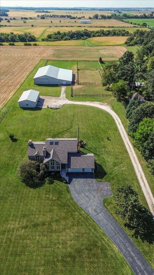 This extraordinary Airhart Contemporary home combines modern architecture with top-tier equestrian amenities on over 9 acres of rolling countryside. Designed with an open floor plan, the home showcases cathedral and vaulted ceilings, wood floors, and a dramatic living room with a wall of windows and striking fireplace, creating a bright, welcoming space that blends seamlessly with the outdoors. The newer upgraded kitchen remodel shines with stainless steel appliances including a double oven, stovetop with pot filler, and stainless vent hood. A large island doubles as a breakfast bar and additional storage, while abundant can lighting adds both function and style. The kitchen also features a gorgeous butler's pantry with beverage refrigerator, flowing into the atrium-style sunroom/dining room with tranquil views of the rolling property. Step outside to a large deck, ideal for entertaining while overlooking the pastures. The luxurious master suite includes a sitting area, french doors, spa-like bath with soaking tub, separate shower, double vanity, and walk-in closet. A first-floor laundry adds everyday convenience, while additional bedrooms are spacious and versatile. The lower level features a family room with new carpet, cozy fireplace, and sliding glass doors leading to the patio and deck, perfect for relaxation or entertaining. Oversized 3 car garage with Hot/Cold hydrant for washing cars and equipment. Equestrians will appreciate the thoughtfully designed grounds, including 3-4 oak-fenced pastures and a 96' x 100' horse barn with a 60' x 100' indoor riding arena (14' clearance). The barn is complete with 2 stalls, tack area, wash bay, water and electric, with expansion potential for 9 additional stalls. A separate 4-car garage with electric and water provides ample room for vehicles, equipment, or a workshop. Recent updates include roof, skylights, and gutters replaced in 2024; new 720 ft well in 2021; furnace & air conditioner 2011; hot water heater 2019 with gravity return line; partial barn roof 2018; Water Softner owned. Water treatment system rented, providing peace of mind for years to come. This is a rare opportunity to own a true Airhart masterpiece, blending modern country living with world-class equestrian facilities in one remarkable setting.
