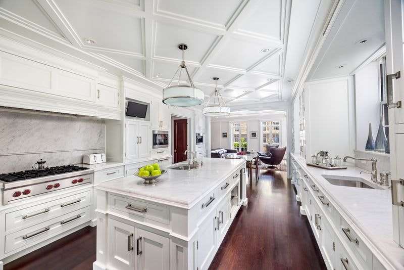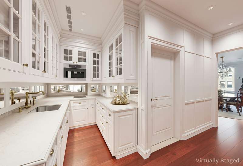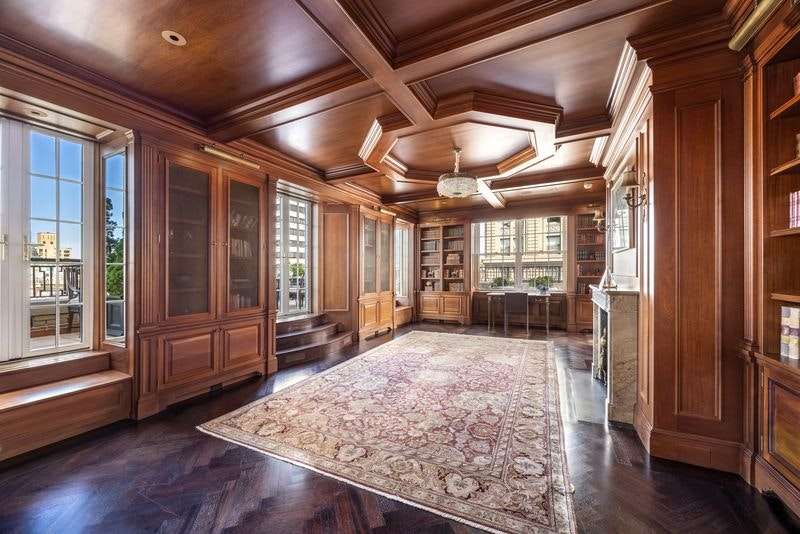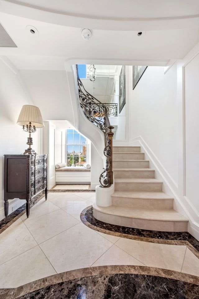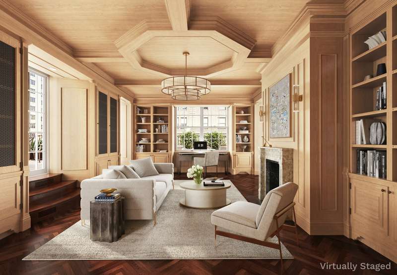 A private elevator landing opens into a dramatic ;circular marble gallery, anchored by a sweeping staircase with a finely wrought ;bronze balustrade. To one side, a handsome ;paneled mahogany library with ;a wood-burning marble fireplace and three French doors opens to a western ;terrace facing Central Park. ;Adjacent, a large and inviting corner family ;room has access to an additional landscaped terrace. At the heart of the home, ;the spectacular chef's kitchen is designed for both everyday living and grand ;entertaining. Outfitted with custom cabinetry, expansive Carrara marble ;surfaces, and top-of-the line appliances, it provides both elegance and ;functionality. ;A private office , powder room ;and internal ;elevators complete this level.