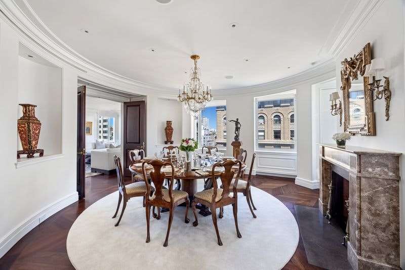 Ascending the marble staircase-or arriving by elevator ;to a private elevator vestibule-guests are welcomed into an expansive marble ;gallery ;leading to an impressive ;living room and an elegant ;circular dining room. Perfectly proportioned and filled with natural light ;streaming in through oversized picture windows, the living room enjoys triple ;exposures and striking city views. The dining room, distinguished by mahogany ;inlaid floors and a marble wood-burning fireplace, sets the stage for ;unforgettable gatherings. Supporting these grand entertaining spaces are a ;fully equipped butler's pantry, staff quarters or fifth guest suite with full ;bath, and an additional powder room.