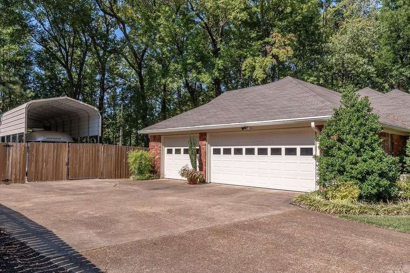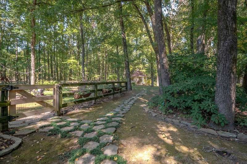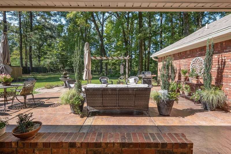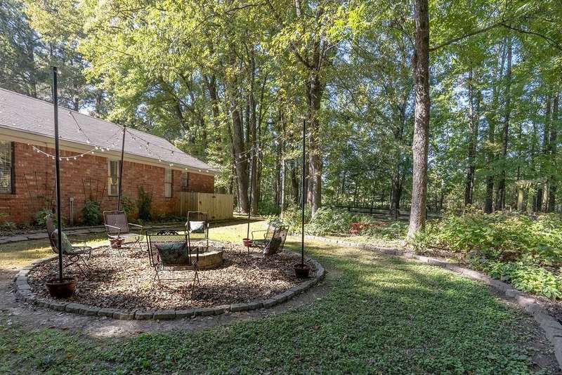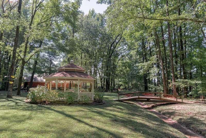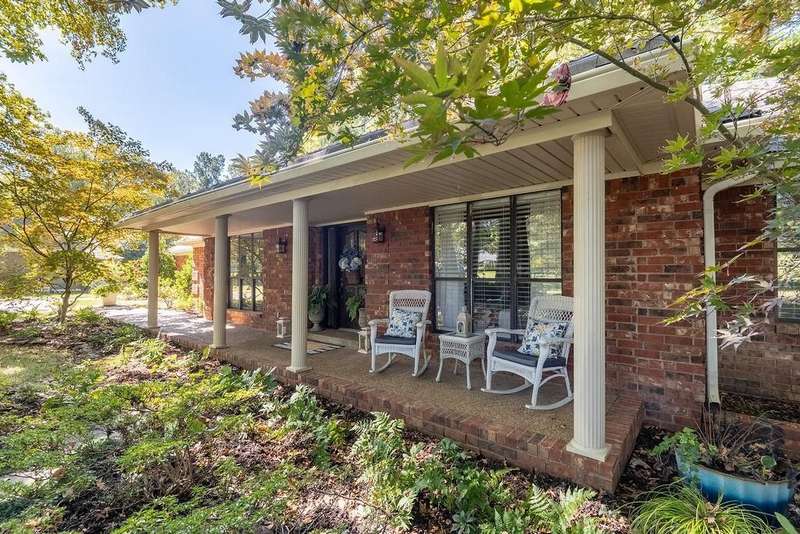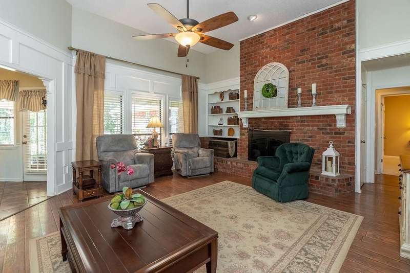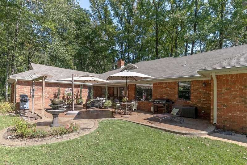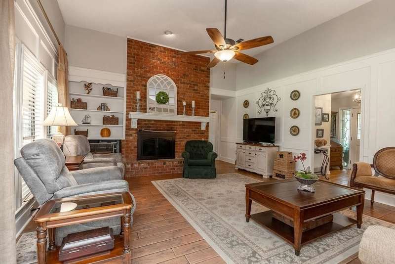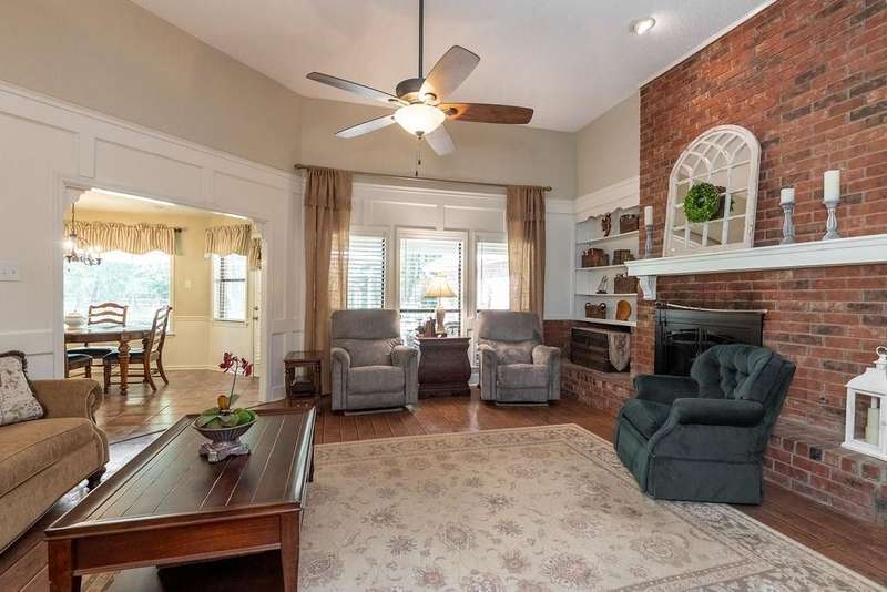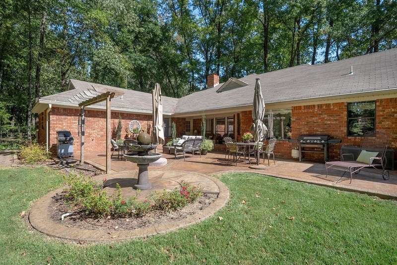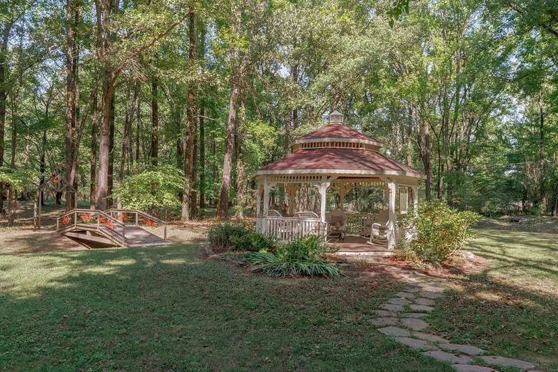 Serene bird-watching paradise on a beautiful 2.08-acre lot! This one-level, 4-bedroom brick home offers the perfect blend of comfort, function, and natural beauty. Outdoor living abounds with a 16' gazebo, a large stone firepit, a front yard swing, a covered front porch, and both covered and uncovered stamped concrete patios. Enjoy the soothing sound of the water fountain and the convenience of leafguard gutters, along with a covered concrete RV parking pad featuring 20-, 30-, and 50-amp power connections, and a spacious 3-car garage. Inside, you'll find a dedicated home office, separate dining and breakfast areas, an induction cooktop and convection self-cleaning oven, abundant cabinetry, a pantry, and an oversized laundry room. Elegant quartz kitchen countertops, granite bath vanities, a striking gas log fireplace, high ceilings, walk-in closets, attractive wood laminate flooring, new carpet, and thoughtful updates throughout make this home a peaceful and inviting retreat.