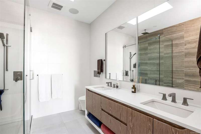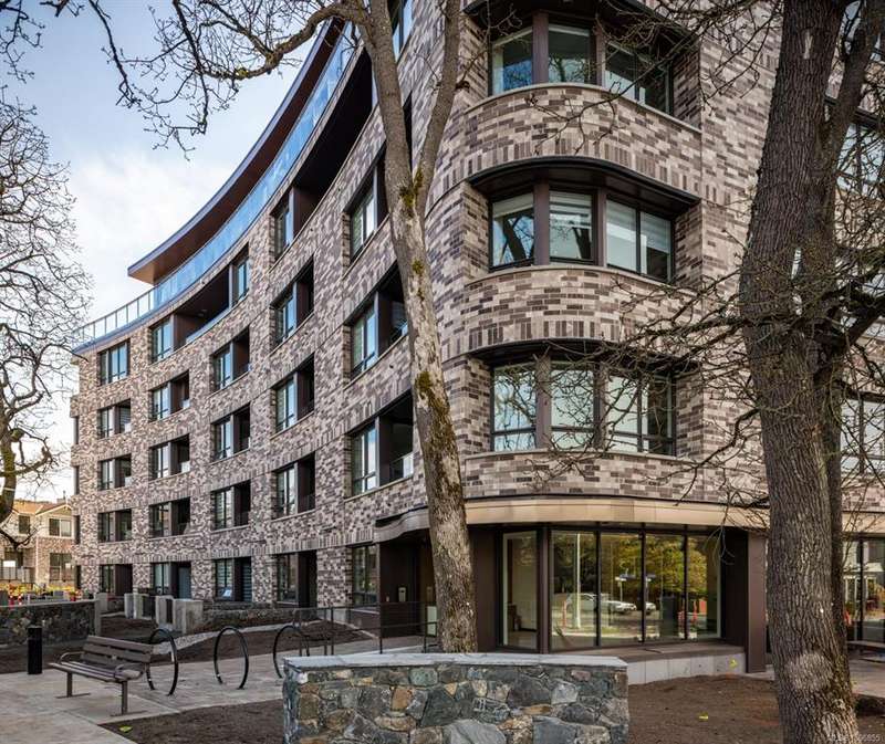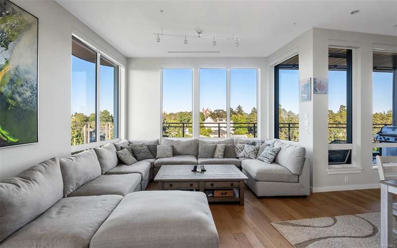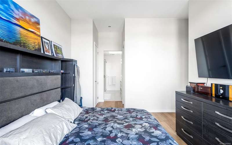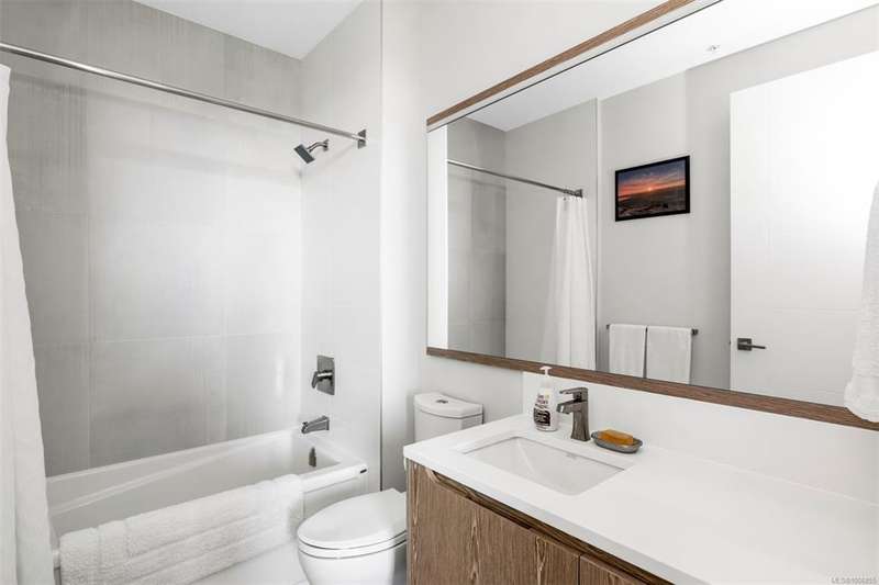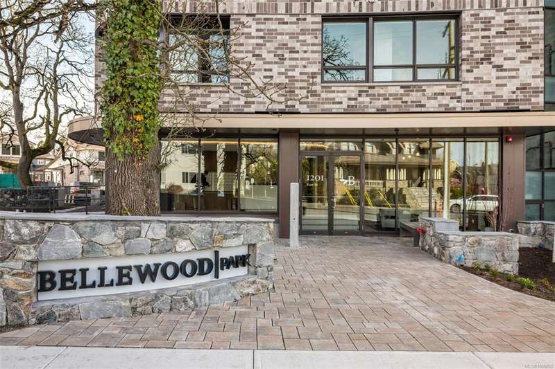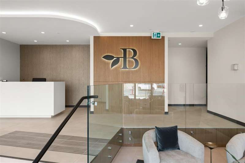 Welcome, YOUR new penthouse at Bellewood Park awaits! You'll enjoy views of the city and mountains from this exclusive 2 bedroom, 3 bathroom+ den home. The kitchen is loaded with top-of-the-line appliances: Wolf gas cooktop, double wall oven, double Blomberg refrigerator, and a Fisher & Paykel double-drawer dishwasher. For the wine enthusiast, a wine fridge is conveniently built-into you mini bar zone. Every detail in this penthouse has been meticulously curated: electric blinds, heated bathroom floors, providing warmth and comfort. The built-in outdoor patio heater allows you to enjoy the the beautiful views year-round, while the gas fireplace adds a cozy touch indoors. 10'8" ceilings and customized lighting throughout, the space feels open and inviting. Parking is a breeze with your Private 2-car garage and and additional 3rd parking with an EV charger, perfect for eco-conscious homeowners. All within minutes of downtown, Dallas Rd, Cook St village and more!