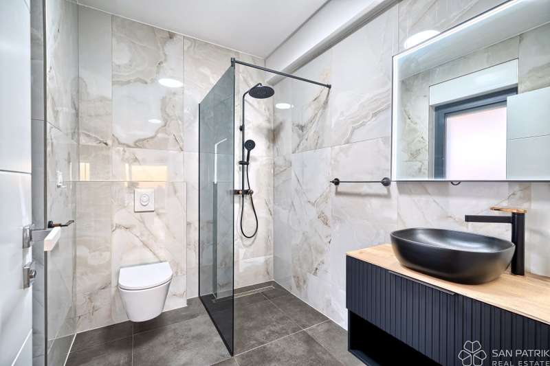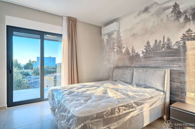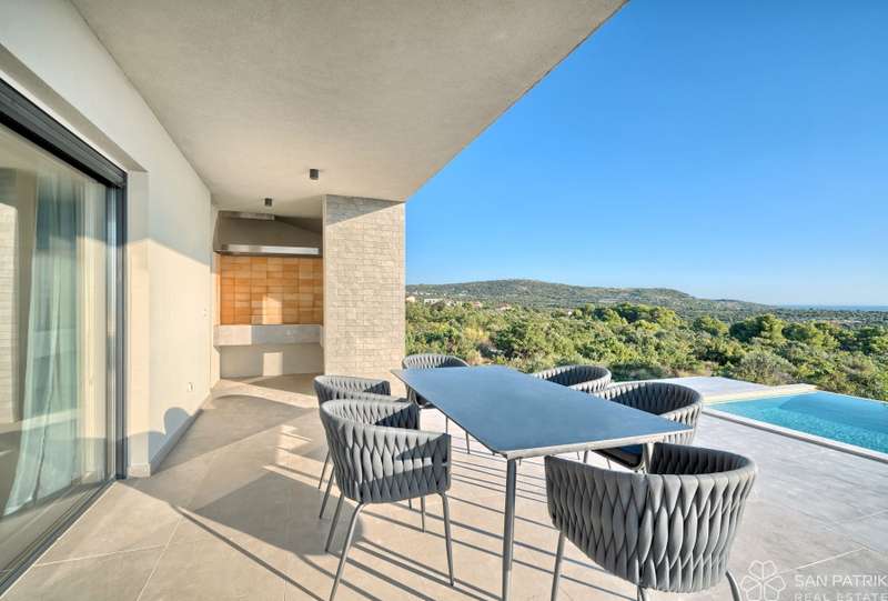 The upper floor consists of three luxurious bedrooms, each with its own bathroom and walk-in wardrobe, and access to private terraces offering panoramic views of the sea, nearby islands, the statue of Our Lady of Loreto, and the charming town of Primosten.
