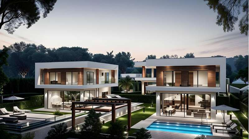 The villas have a separate kitchen, living room, two balconies, large terrace, two bathrooms, en-suite bathroom, and a detached garden.