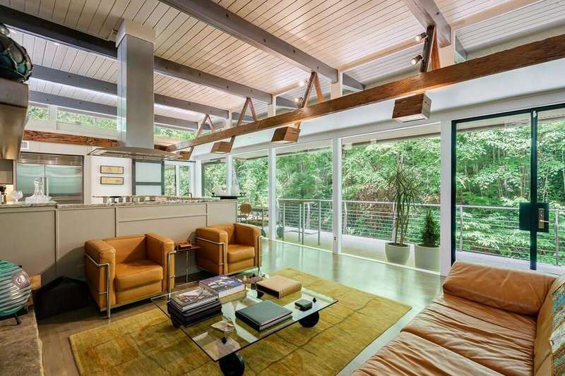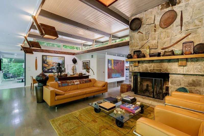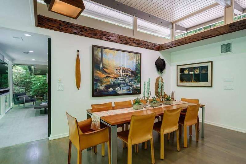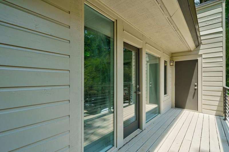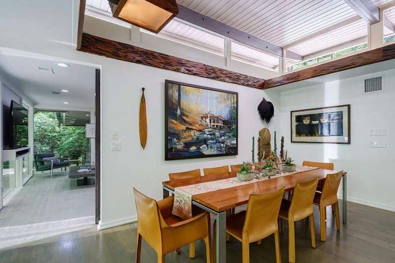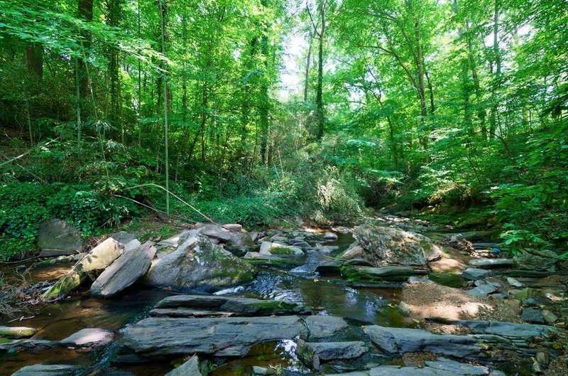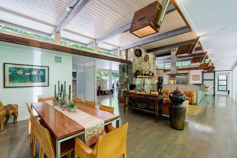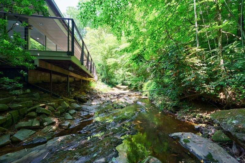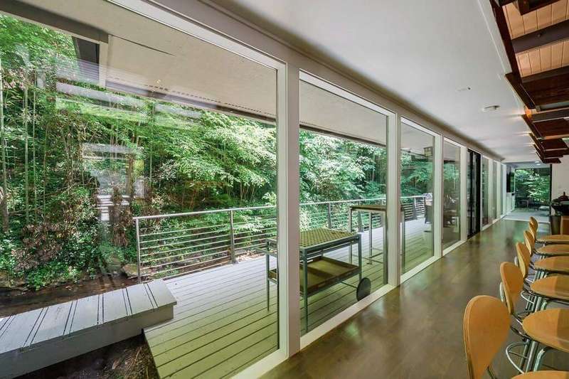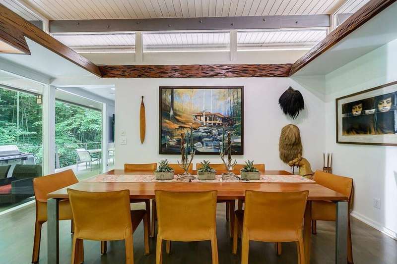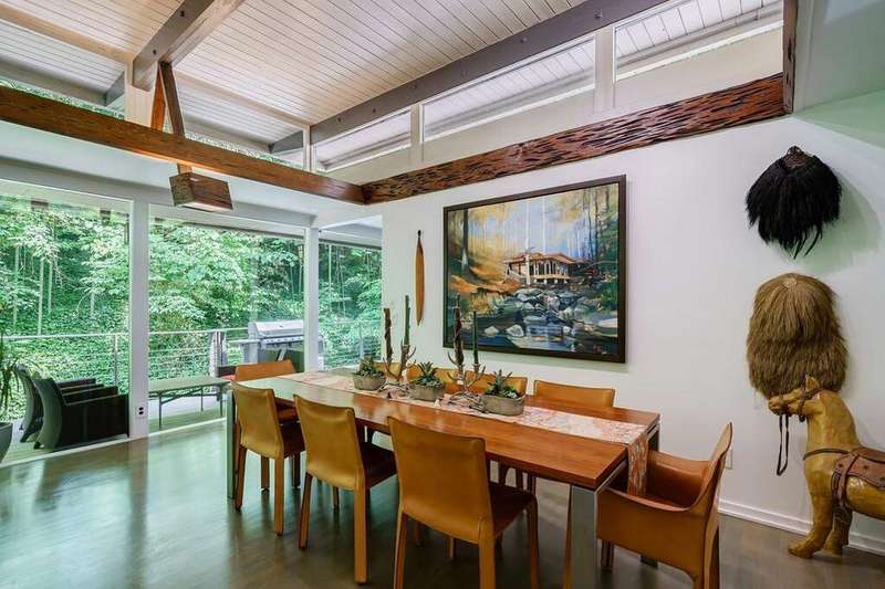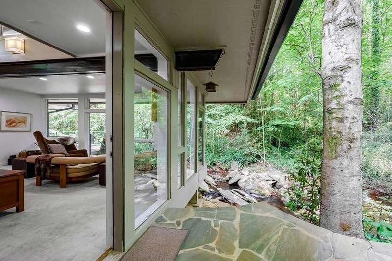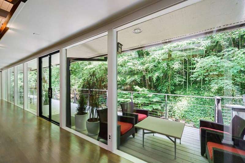 Tucked away on a tranquil and private 2.21 acre lot, this exceptional mid-century modern home offers a rare blend of timeless architecture and serene natural beauty-just minutes from the coveted Chastain Park. Designed to impress, the home features rich pecky cypress accents, dramatic floor-to-ceiling windows, and bold rustic stonework, creating a seamless connection between indoor and outdoor living. The updated kitchen is both stylish and functional, equipped with stainless steel appliances, granite countertops, and a breakfast bar perfect for casual dining. A cozy yet expansive great room centers around a striking stone fireplace and opens to a large deck-ideal for entertaining or unwinding. The dining area, with views of a peaceful creek, sets the tone for relaxed, elegant gatherings. The main residence includes four spacious bedrooms. The private primary suite is a true retreat, offering a spa-like bath with dual vanities, steam shower, and whirlpool tub. Tucked at the back of the home, it also features its own patio and sitting area. A secondary bedrooms are positioned on the opposite side of the primary suite for added privacy, while a separate den and office provide flexible living space. A detached guest house above the four-car garage offers a fifth bedroom and full bath-ideal for visitors, an art studio, or a quiet home office. A rare opportunity to own a distinctive and thoughtfully designed home in one of Atlanta's most desirable neighborhoods, offering unmatched privacy, architectural character, and convenience.