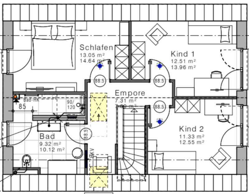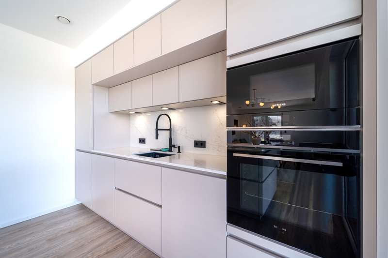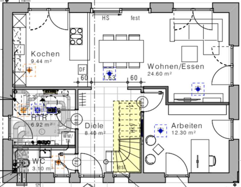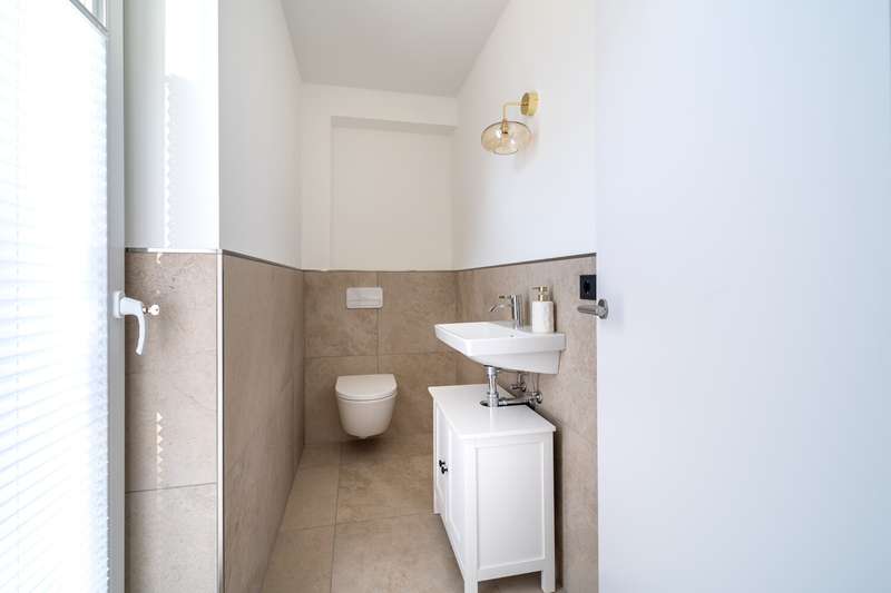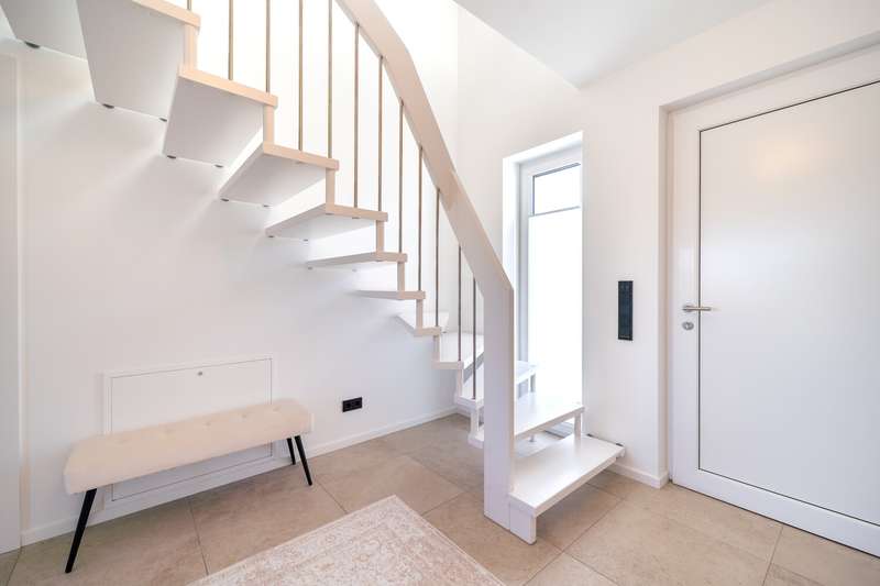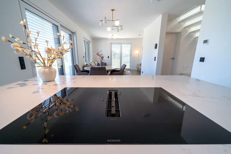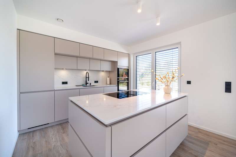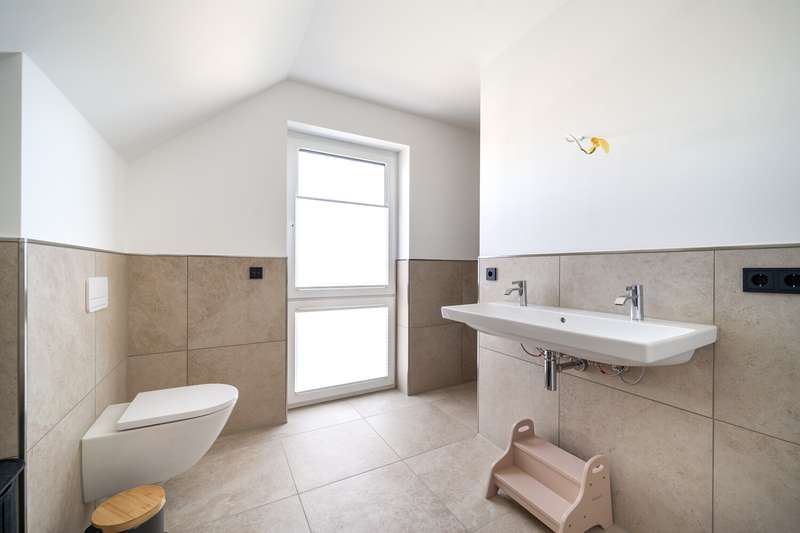 This as-new detached house, which was completed in March 2025, is now for sale. It is located in a quiet development area in Bielefeld-Vilsendorf in an attractive peripheral location, which means that it retains an unobstructed view of the countryside. On the first floor, to the left of the entrance area, is the guest WC and the utility room, which houses the district heating system and the controls for the PV system. It is also possible to connect an electricity storage unit here. There is also space for a washing machine and tumble dryer. There is an additional room on the right-hand side, which is ideal for use as a home office or additional bedroom. The wall to the living room is not load-bearing and can be removed to extend the living area if required. In front of the living and dining area, there is the option of installing a loft door between the hallway and the living area. This could be used to elegantly separate the entrance area from the living area. The spacious, open-plan living and dining area with adjoining modern kitchen and free-standing kitchen unit is flooded with light and creates a pleasant living atmosphere. From here, you can access the approx. 44 m² terrace with beautiful views of the greenery. The terrace has been laid with 3 cm thick ceramic tiles. On the top floor, which can be reached via the staircase in the entrance area, there are two children's rooms, the master bedroom and a modern bathroom with a floor-level shower. Above this is a loft that offers additional storage space. As a level 40 efficiency house, the building has modern technical features including a 4.86 kWp photovoltaic system, underfloor heating, a controlled ventilation system and a district heating supply. It was built by VIEBROCKHAUS and comes with a ten-year guarantee. The area around the house has already been paved and there are two to three parking spaces in a row. Various exterior works will be completed in the coming weeks.
