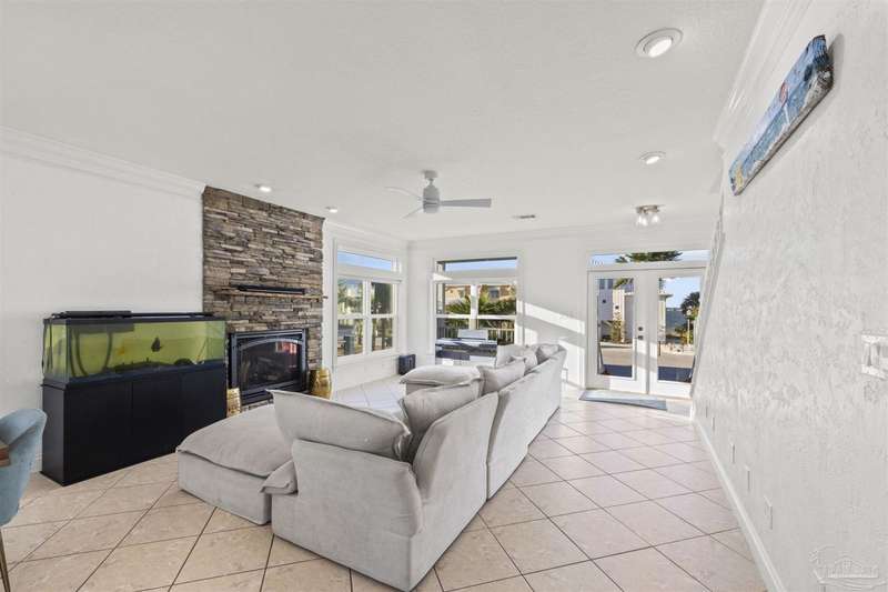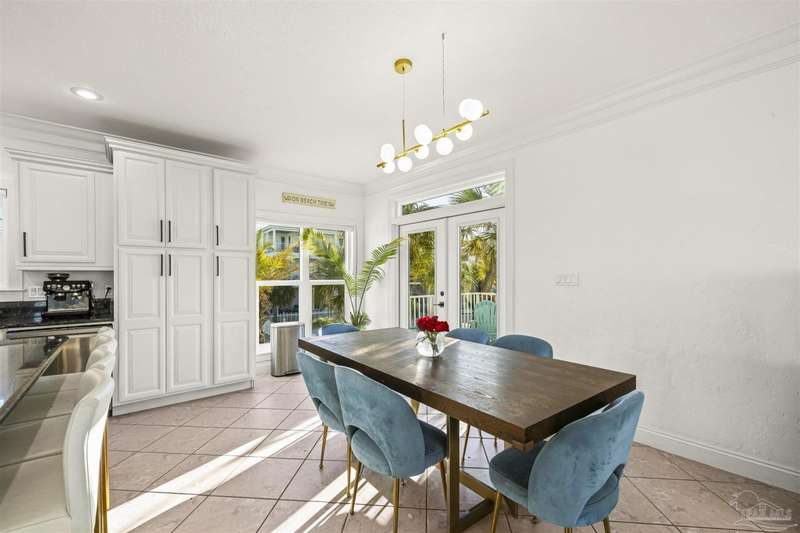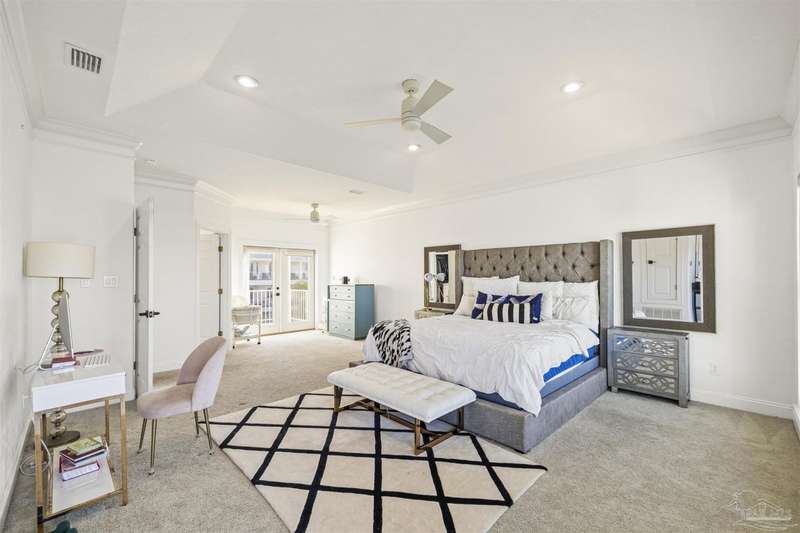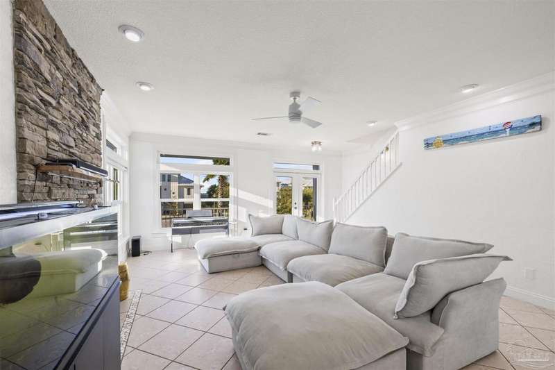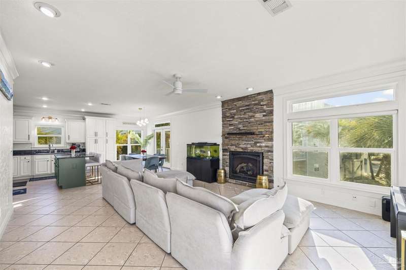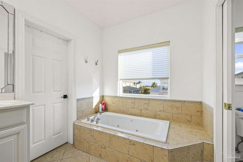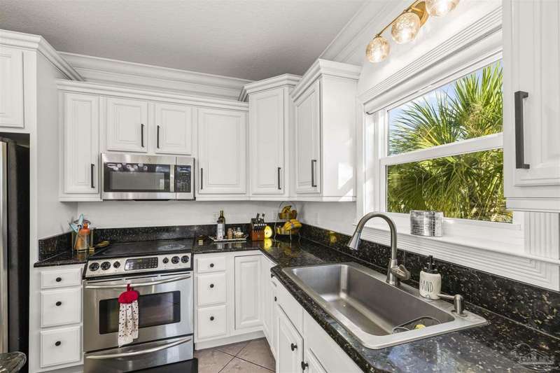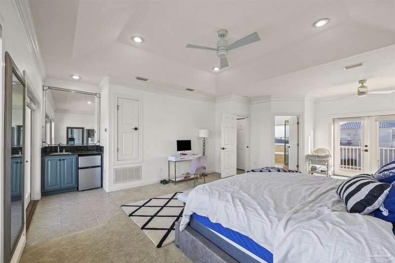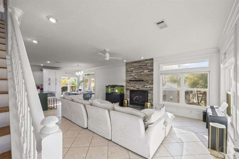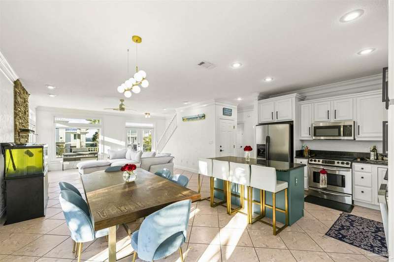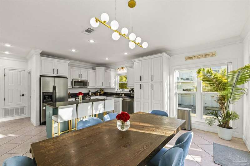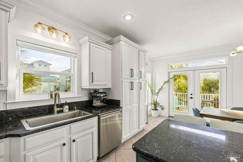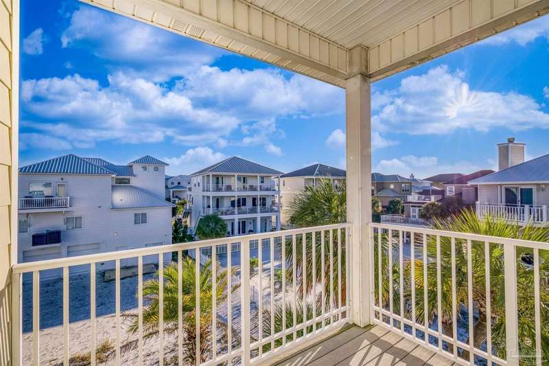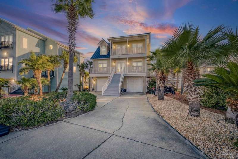 Beautifully updated and move-in ready, 22 Seashore Dr offers a rare opportunity to own a waterview retreat in the exclusive Seashore Village community of Pensacola Beach. Nestled on a quiet cul-de-sac just steps from the Gulf and Santa Rosa Sound, this 4-bedroom, 3-bathroom home blends coastal charm with thoughtful upgrades and panoramic water views. Built in 2002 and meticulously maintained, the home features hurricane-rated windows, a metal roof and a freshwater well for irrigation ensuring peace of mind and low-maintenance living. Step inside to an open-concept main level where the kitchen, dining, and living areas flow seamlessly, all oriented to capture stunning sound and Gulf views. The spacious master suite is a true sanctuary, complete with a private balcony, wet bar, and a spa-like bath with a jetted tub. The third-floor laundry room adds everyday convenience, while the oversized garage has plenty of room for a workshop, ample storage, and a bay large enough for boat and golf cart storage. Outdoor living is elevated with access to a private sound-side beach and dock, all exclusive to Seashore Village residents. Enjoy morning walks across the street to the unobstructed Gulf, or walk along the sound to nearby Portofino Island Resort amenities-optional membership includes five clay tennis courts, indoor and outdoor pools, a state-of-the-art gym, and on-site dining. With a no short-term rental policy, Seashore Village maintains a serene, residential atmosphere ideal for full-time living or a second home. Zoned for one of the nation's top-rated Blue Ribbon schools, this home offers both luxury and lifestyle in one of Pensacola Beach's most desirable enclaves.