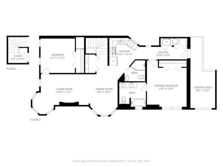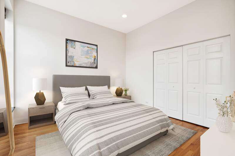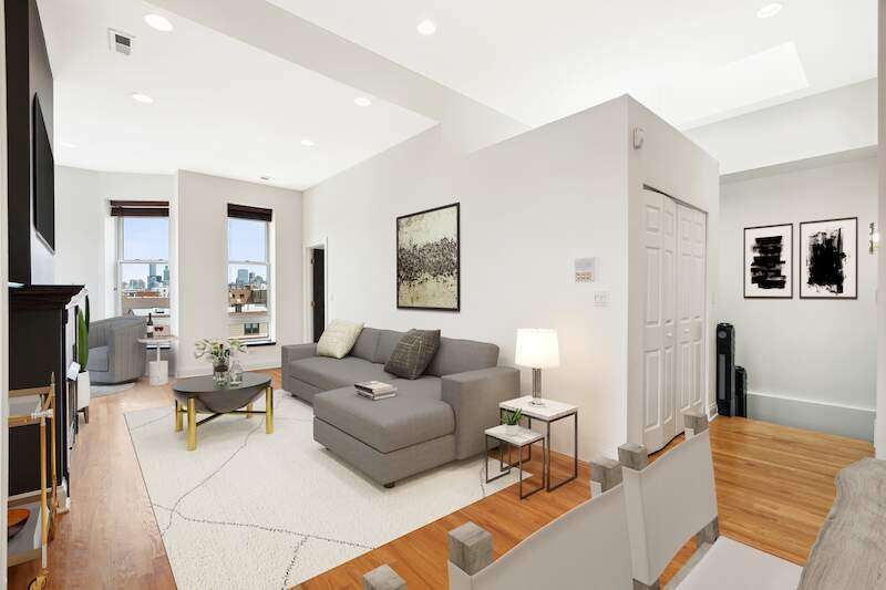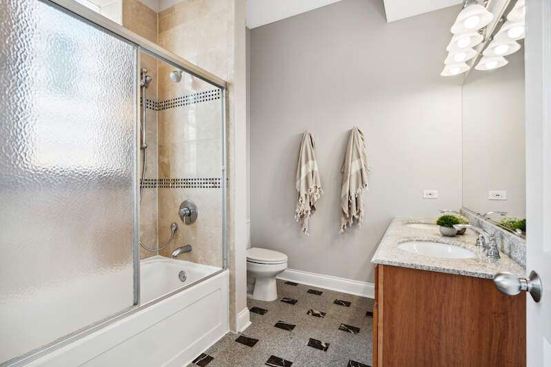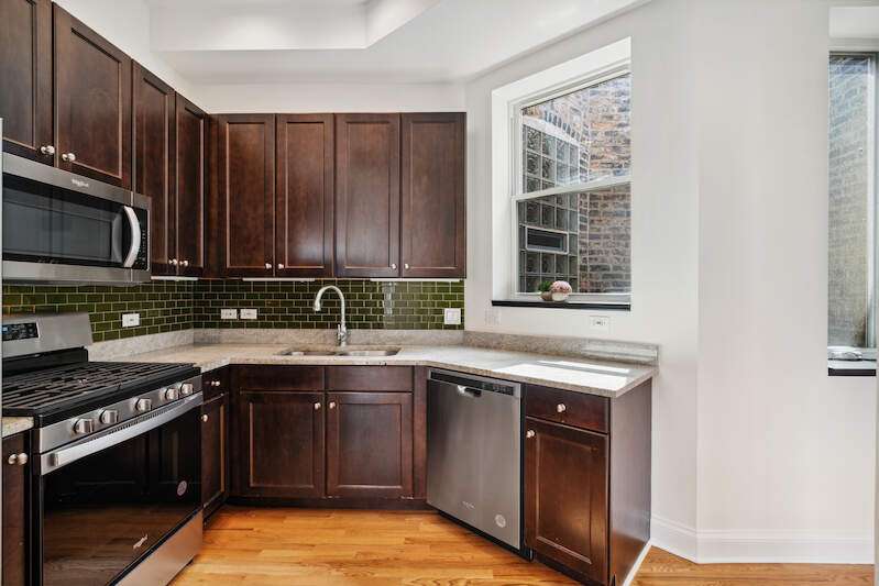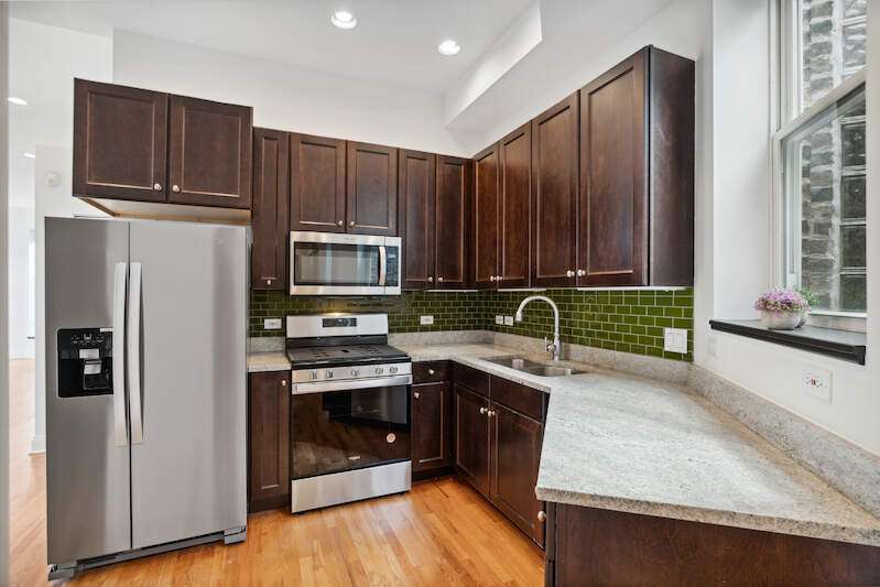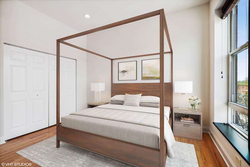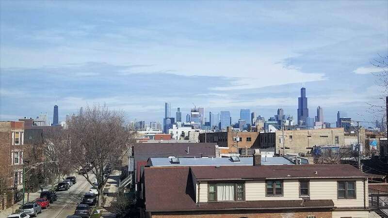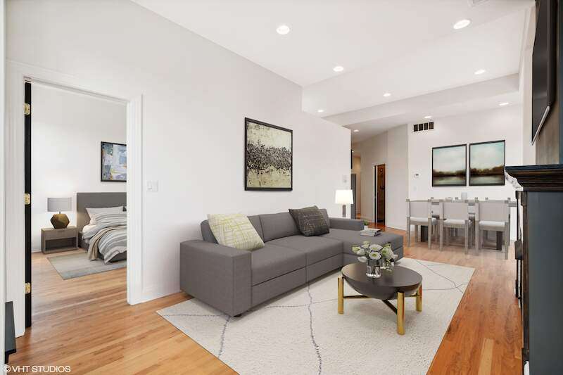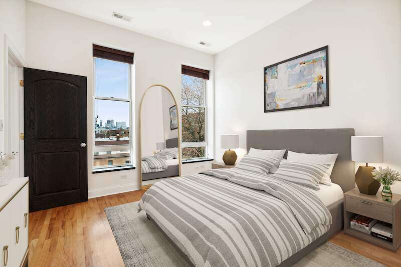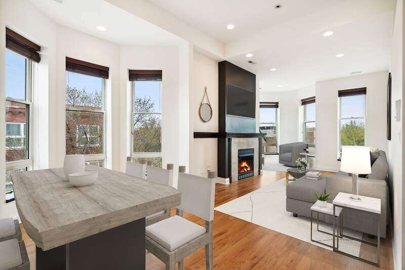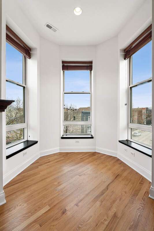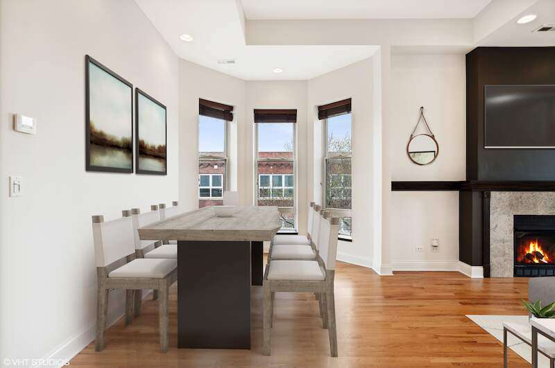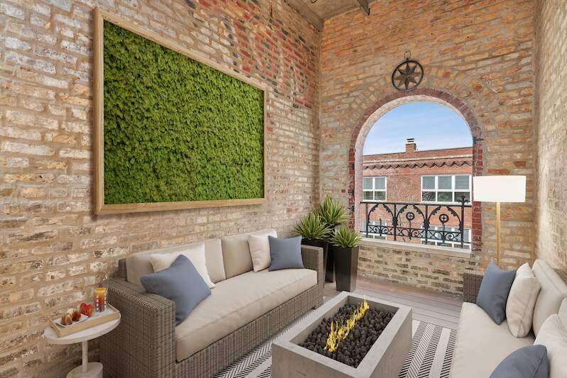 Magazine Worthy Penthouse condo in a stately 1879 building on the corner of Leavitt & Race boasts soaring, 11ft+ ceilings, skyline views & incredible light from tall windows on three sides! Enter this special home by ascending your personal (& original) staircase flooded with light from two large skylights overhead & arrive upon a wide open, 29 ft long living/ dining space anchored by a fireplace in the center & bookended by a turret with panoramic skyline views on one end & a large bay on the other. This dramatic space is magnified by the sunlight & views from 7 massive windows and the 10- 11 foot ceilings throughout. The kitchen is adjacent to the dining area & is comprised of espresso cabinets, granite counters, a beautiful green glass subway tile backsplash & a suite of newer stainless appliances. The primary bedroom enjoys tall windows, a large closet & is en suite with a marble bath featuring a double- bowl vanity, a tub/ shower combo & a large window. The guest bedroom at the opposite end of the home ensures maximum privacy for owner & guests alike. This bedroom has a large step-in closet & two windows with panoramic skyline views! The guest bath includes a marble- clad walk- in shower. A gallery hall leads past the primary suite to a large, covered deck with three brick walls punctuated by a massive arched opening with an antique iron railing that would not be out of place in Tuscany! This is an incredible space to entertain and relax right off your home. Price includes a convenient, assigned parking space via a curb cut (no need to drive down an alley) as well as shared storage in the basement. New furnace in 2022. New AC in 2021. New stainless appliance suite in May 2022. Steps to the Metra and all the dining, shopping and nightlife options on Chicago, Grand & Western!