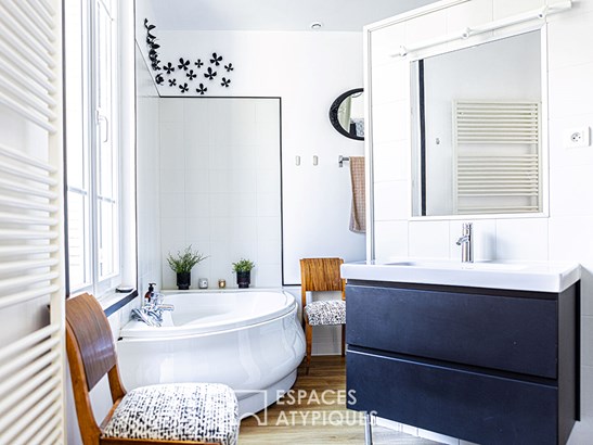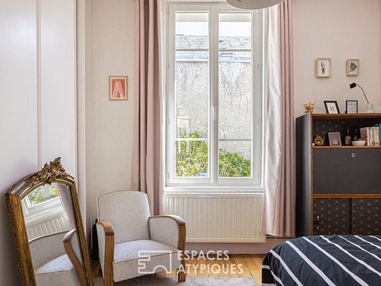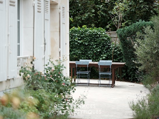 Outside, the large wooden terrace naturally extends the living rooms. The garden, surrounded by old walls, invites you to relax in a cozy and confidential atmosphere, rare in the heart of the city.