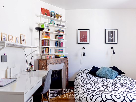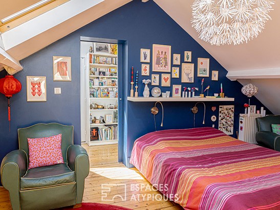 On the top floor, the master suite seduces with its tranquility and beautiful luminosity. It benefits from a bathroom, an office space and storage, offering a real cocoon under the roofs and suggests the possibility of reorganizing the space according to needs.