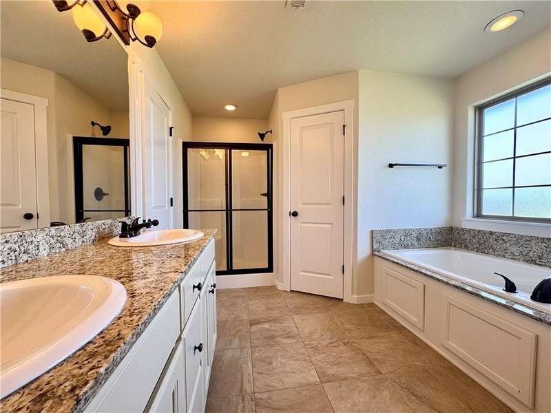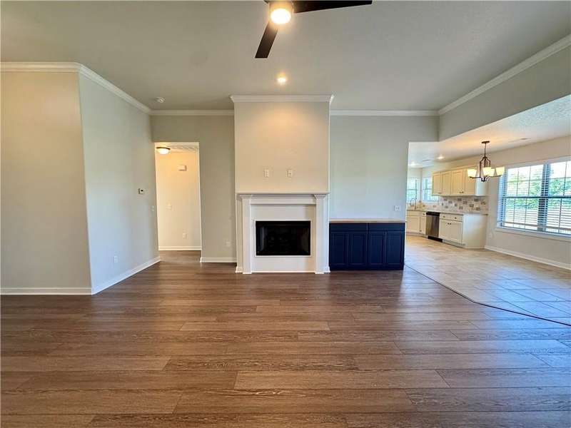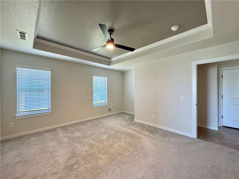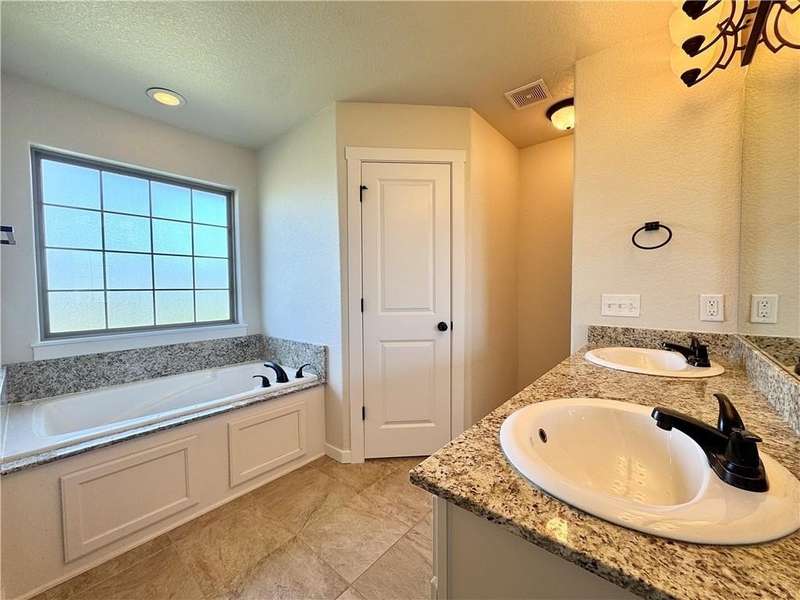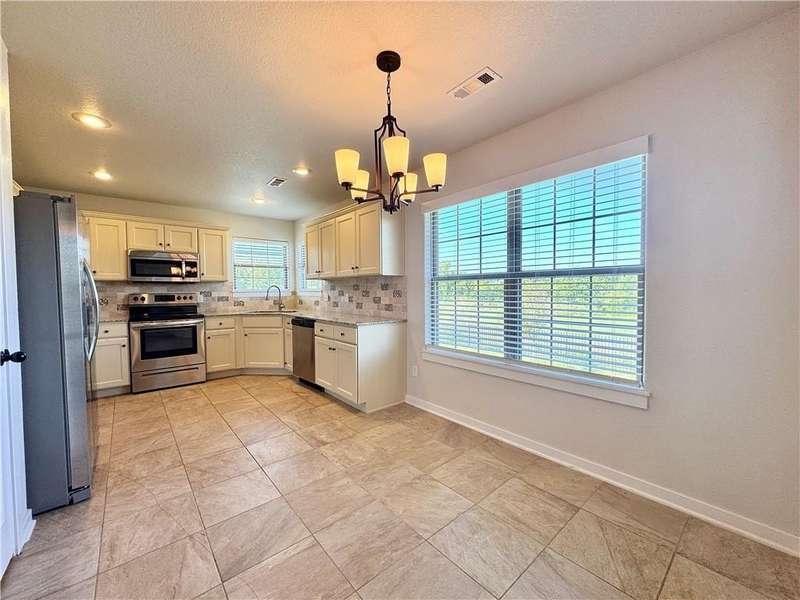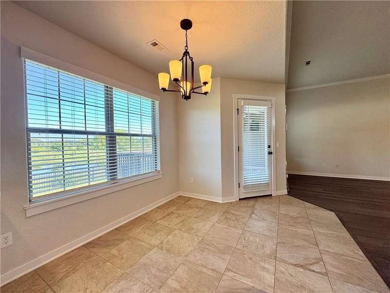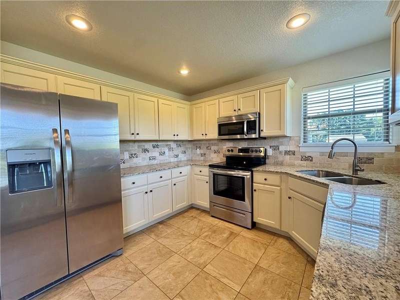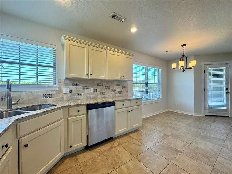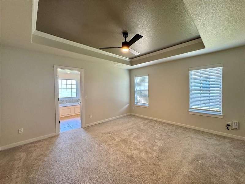Beautifully maintained home is perfectly located near schools and a park. Spacious living room features LVP flooring, cozy gas fireplace, crown molding, natural light, and an open floorplan. Chef’s kitchen offers granite countertops, stainless steel appliances, a new refrigerator, pantry, generous counter space, storage and a sunny eat-in area. Large primary suite boasts a tray ceiling, accent paint, crown molding, new carpet, and a spa-like bath with double sinks, jetted tub, walk-in shower, and two walk-in closets. Two oversized bedrooms add flexibility, while the utility room includes a washer, dryer, storage, and hanging space. Additional updates include a Ring security system, comfort-height toilets, fresh paint, and new LVP and carpet in 2024. Relax on the covered deck overlooking the private yard with serene pond views. Walk to C.L. "Charlie" and Willie George Park! Football field, tennis courts, baseball fields, soccer, splash pad, paved walking trails, pavilions and more! $2,500 allowance for damaged tile.