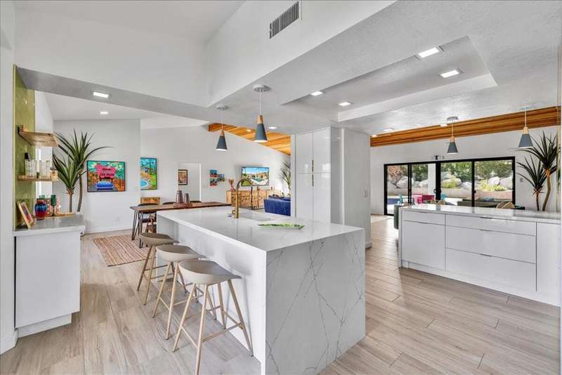 This South Palm Desert residence is truly turnkey--fully furnished, professionally decorated in 2023, and enhanced with extensive updates completed the same year. Every space reflects a modern, stylish design and a focus on comfort and livability.The main home features 3 bedrooms and 3 bathrooms with an open floor plan and vaulted ceilings. The newly renovated kitchen showcases quartz waterfall counters, a striking tile backsplash, breakfast bar, and dry bar. The expansive primary suite includes a generous walk-in closet, a spa-inspired bathroom, and direct access to the saltwater pool--perfect for morning swims or evening relaxation.A private attached guest house adds exceptional versatility, offering its own bedroom, bathroom, full kitchen, living/dining area, washer/dryer, and dual ductless mini-split A/C systems--ideal for hosting guests or as an income opportunity.Extensive updates completed in 2023 include all-new appliances, new window coverings, a high-efficiency A/C unit, new furnace, new water heater, and a five-camera security system. Outdoors, the professionally landscaped grounds are enhanced with upgraded sprinklers, a new misting system, and automated pool equipment. The backyard is a true retreat, highlighted by a sparkling saltwater pool and a hand-painted mural that adds a unique artistic touch.Located just minutes from El Paseo's premier shopping, dining, golf, and hiking, this South Palm Desert residence combines style, function, and location--delivering the ultimate desert lifestyle.