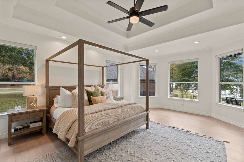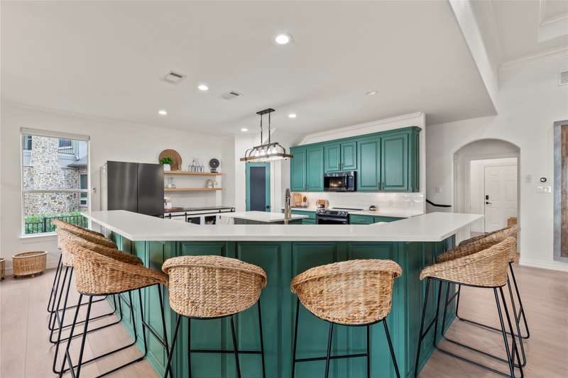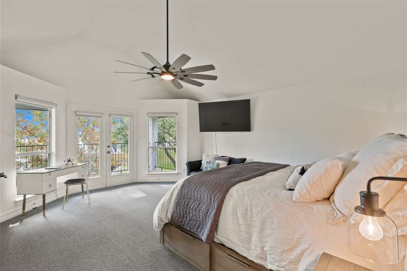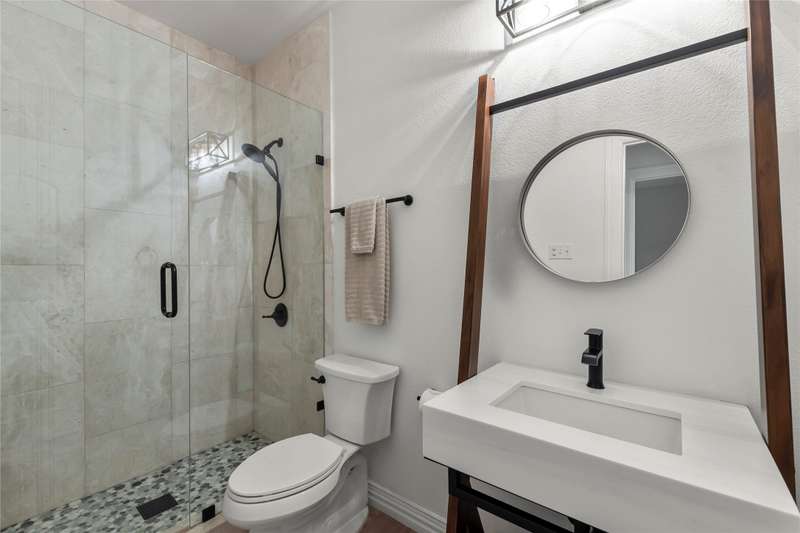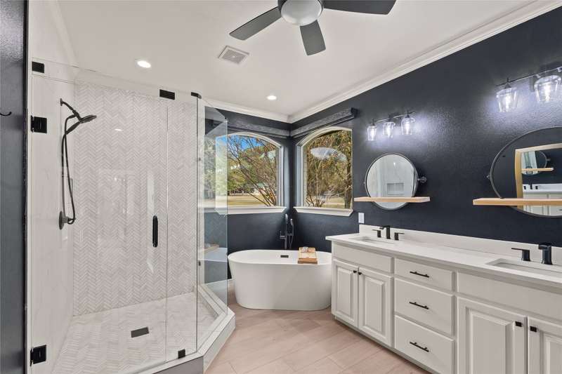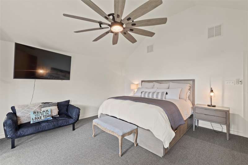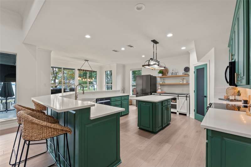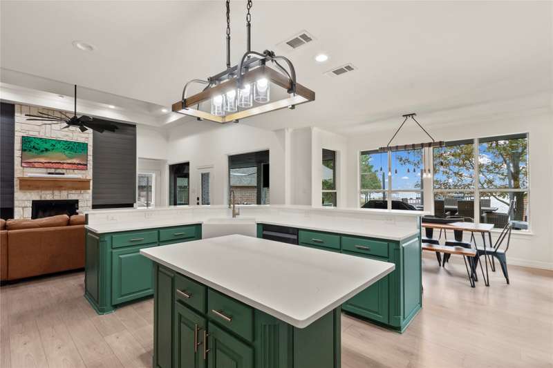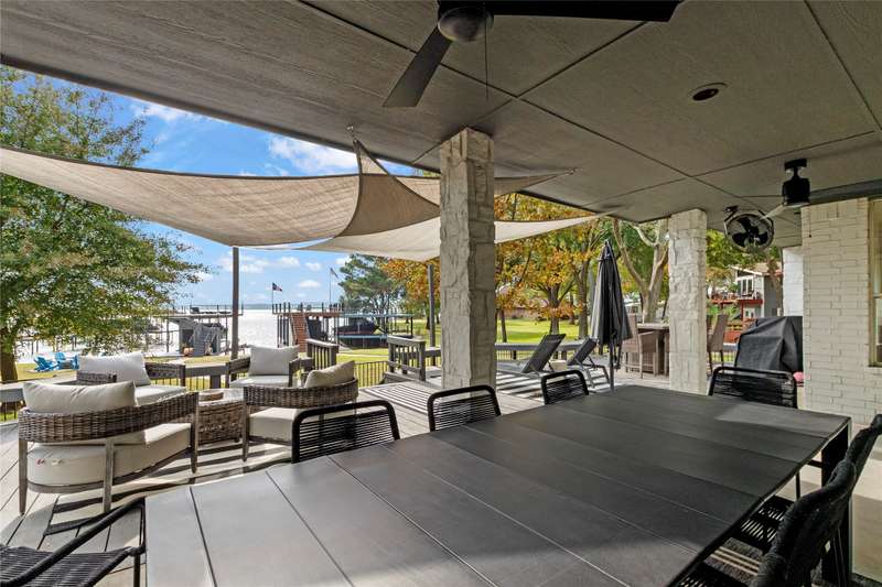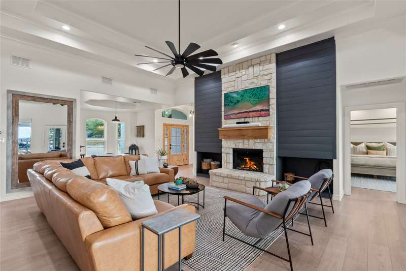 Stunningly renovated waterfront 2,920 sq ft home in Gun Barrel City on Cedar Creek Lake offering 4 bedrooms, 3 bathrooms, an oversized 2-car garage and open-water views. The spacious living room features large picture windows and a striking Austin-stone fireplace flowing into two dining spacesa dedicated dining room (perfect place for combination dining game table) and a breakfast area. Connected to both dining areas, the open kitchen includes newer black stainless appliances with a convection oven and flat cooktop, a walk-in pantry, island, and bar seating for. Tall ceilings, LVP flooring, decorative lighting, and a clean designer feel extend throughout. The waterside primary bedroom on the main floor features deck access, picture windows capturing open-water views, and electric blinds. The ensuite bath features a dual-sink vanity, walk-in shower with glass surround, soaking tub, and two walk-in closets. A second downstairs bedroom with full bath great for guests or full time living. Upstairs, an extra-large waterside bedroom includes a private waterside balcony, while another bedroom offers built-in bunks (two queens down, two twins up) and a walk-in closet. A full bath with a tub-shower combo serves both rooms. Outdoor living shines with a covered patio and extended deck with multiple seating areas, a hot tub, and a wrought-iron fenced yard that extends beyond the fence and includes a flagstone fire pit area. The boathouse features composite decking, modern railing, a party deck, lighting, and a cradle for a wake boat. Lake stairs allow easy water access, and a lake-pump sprinkler system. A large concrete driveway provides ample parking plus a two-car garage. Located in a desirable site-built community, the neighborhood includes a gated park with a boat launch, pavilion, and fishing pier, with easy access to Gun Barrel City shopping and dining. Short term rentals allowed with permit from Gun Barrel City. Furnishings and Watercraft available separately.