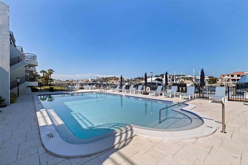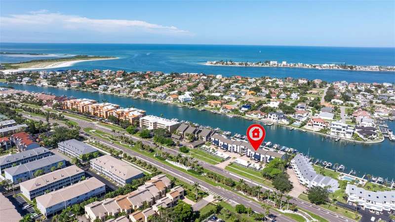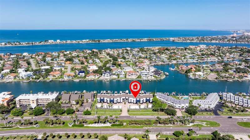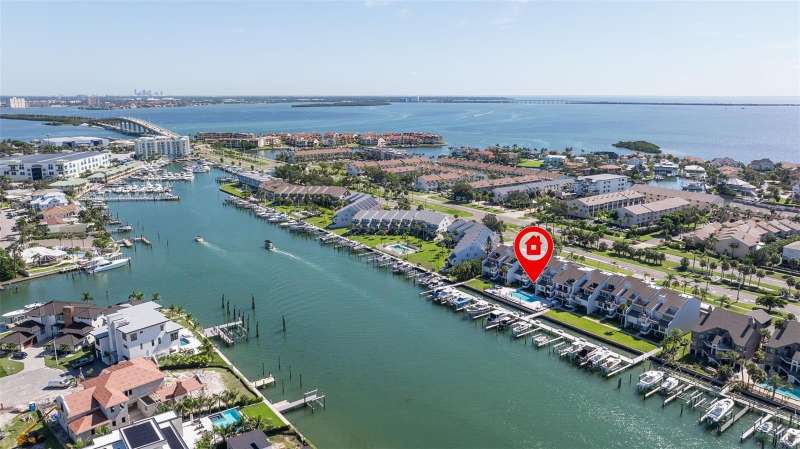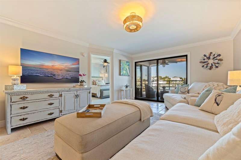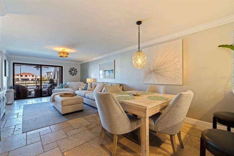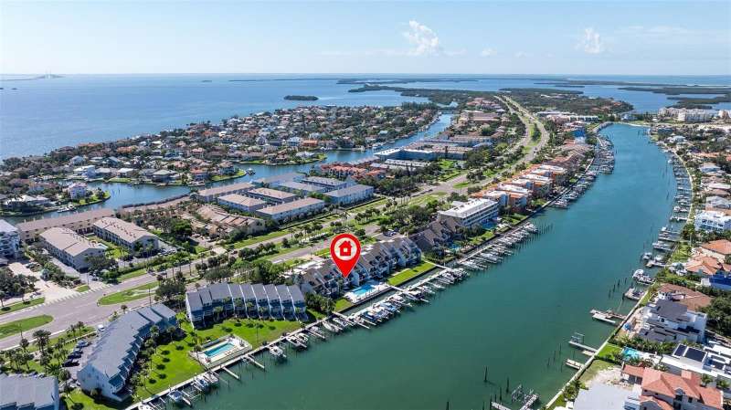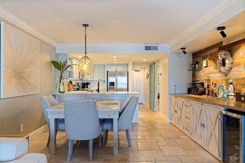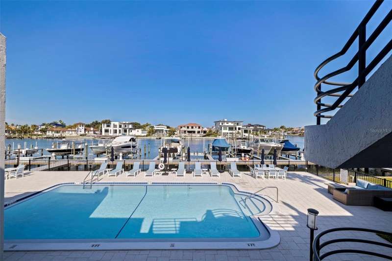 Coming home every evening to magical sunsets over Tierra Verde’s Grand Canal — this is the waterfront lifestyle you’ve been dreaming about. Spacious, open, and thoughtfully designed, this 2-bedroom, 2-bath condo offers effortless coastal living in a vibrant, welcoming community. The friendly entry with inviting porch greets you even before you step inside, showcasing the warmth of island life. As you enter, the elegant coastal-inspired kitchen on your right features soft blue cabinetry, quartz counters, and a breakfast bar with seating for casual dining. On the left, the dining area includes a custom built-in wood bar and beverage fridge — perfect for serving to the dining table next to and entertaining guests. The tiled living area flows naturally with space for your sofa and TV while overlooking the balcony and sparkling Grand Canal, with a private back door entry staircase down to the heated pool for added convenience. The primary suite is a true resort-style retreat with sweeping water views, custom lighting, an oversized walk-in closet, two separate vanities, and a fabulous spa-like walk-in shower. The guest bedroom, enjoys ample daylight, a spacious walk-in closet, and an updated bath. Full-size side-by-side washer and dryer plus additional large storage room downstairs with new water softener to complete the unit. Easy to maintain and lock-and-leave, it’s perfect for full-time living or as a second home. 2 assigned parking spots plus available guest parking spots in this waterfront, pet friendly, freshly painted and landscaped community. Featured amenities include a recently updated pool and fitness center. Enjoy waking or biking: designated bike and walk trail along Pinellas Bayway or downtown Tierra Verde, which offers several island restaurants. Scenic walk or ride across the bridge brings you to Isla del Sol Golf and Country Club. with close proximity to Fort De Soto Park and best local beaches, only 10 mins to Downtown St. Pete, and 40 mins to Tampa International Airport. Complete your lifestyle package with the deeded boat slip and 13,000 lb lift. Furniture is optional, and the boat can be included— simply make an offer.
