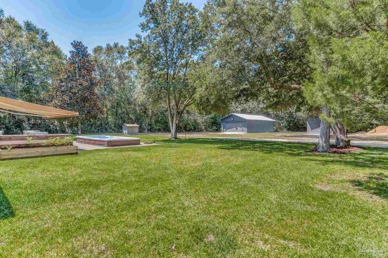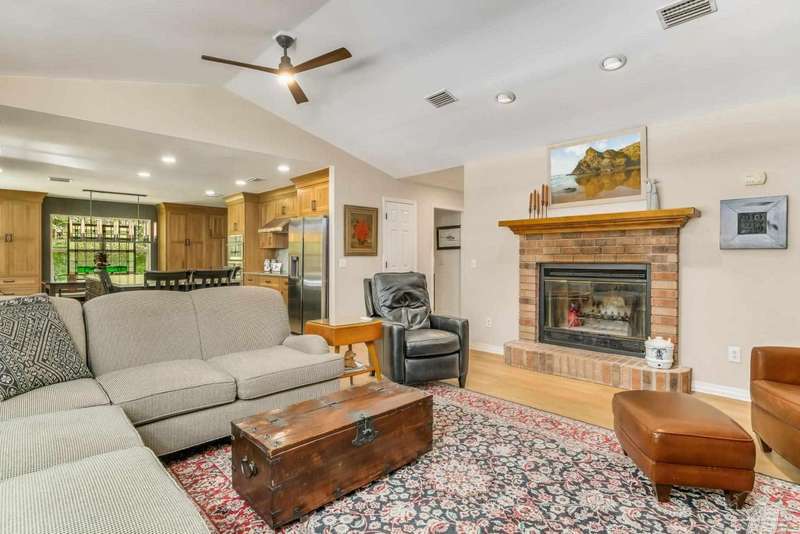 Well maintained and tastefully updated 3 bedroom 2 bath home situated on 4 acres! This brick home offers privacy with a large lot that is covered in mature landscaping that provides ample wildlife and space for outdoor activities. Inside, the home offers luxurious wood look flooring. The front den offers additional living or entertaining space. Making your way into the main living space provides vaulted ceilings, fireplace with brick hearth, modern lighting fixtures, and surround sound. The completely remodeled kitchen includes real wood cabinets, induction cooktop with stainless steel appliance package, double oven, recessed lighting, granite counter tops and spacious island with additional storage. The kitchen provides a multitude of seating options including breakfast bar and designated dining space. The home offers an office space or separate bedroom with 2 closets, and additional guest bedrooms. The spacious primary suite offers views of the expansive backyard, walk-in closet, fully tiled shower with glass surround and double vanity. Out back, the home offers a spacious open patio with retractable awning to provide great shade. The inground jacuzzi style pool offers relaxation. The backyard provides a well for the irrigation, a large oversized 2-car garage with workshop along with a completely enclosed RV garage with power and a junction box that could support 30amp. Additional features include full solar system with battery power backup installed in 2022, full home gutters, roof in 2019, HVAC in 2014 and so much more!