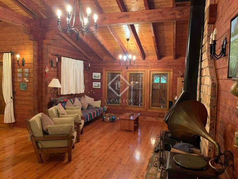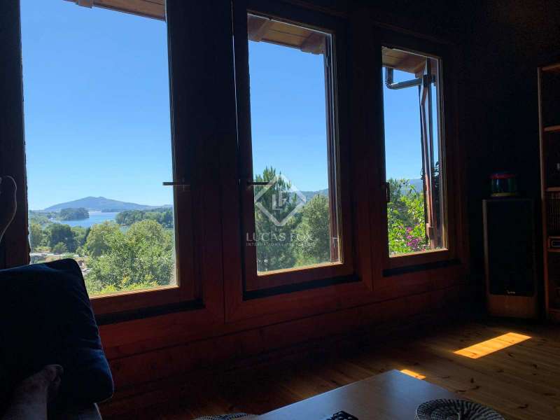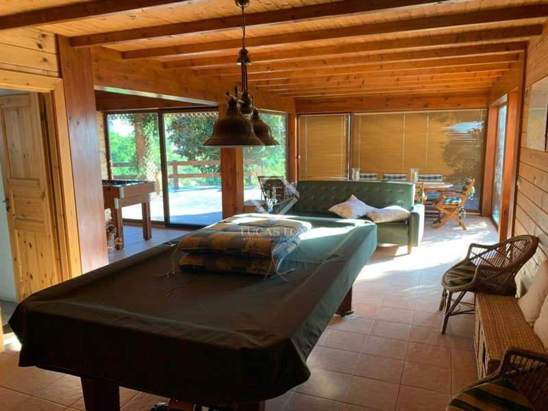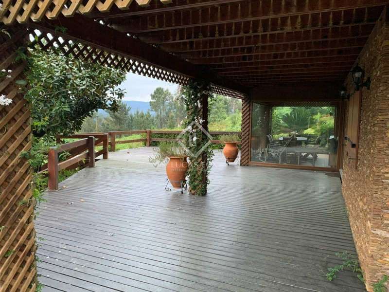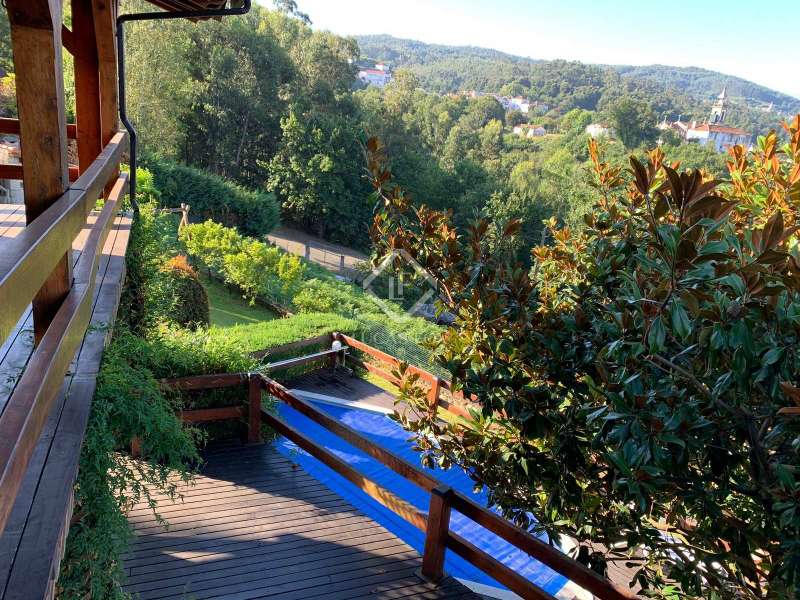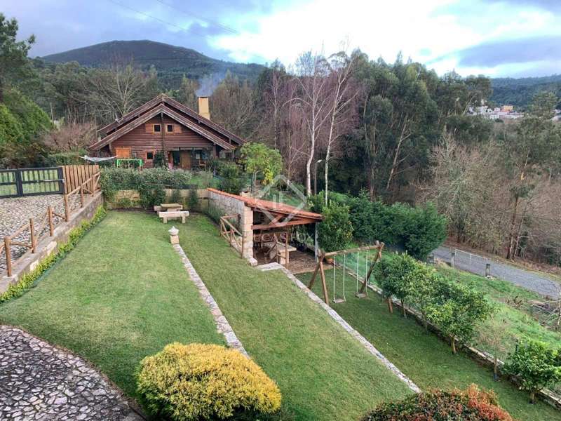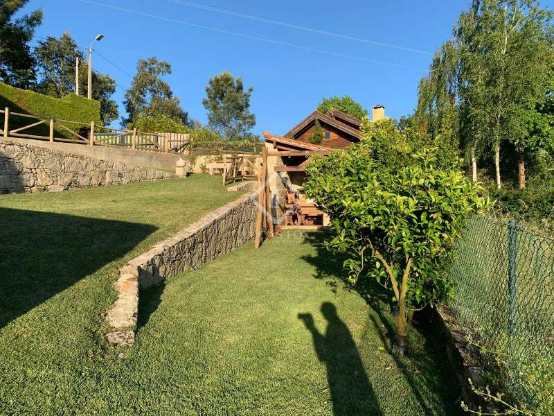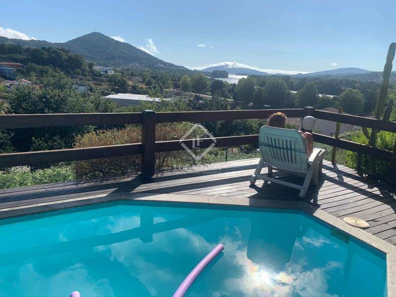Tropical wooden chalet inside and out, with two floors. Floor 0 built in masonry covered with natural stone and wood, where the garage is located, a large 120m² outdoor deck for sun exposure and access to the pool deck, bedroom, complete bathroom, bar and lounge. 1st floor, entirely made of wood, there is a large open space with a furnished kitchen, island counter, dining room and living room with fireplace. Air conditioning heating and cooling equipment. On this floor there are three bedrooms, all with built-in closets and a full bathroom. Access to a large and spacious balcony to enjoy the views over the River Minho, Spain and the mountains. Going down to floor 0, outside we find the gardens with various trees, pine trees, fruit trees, and a grassy area, covered barbecue area, complete with barbecue and wood oven, storage, sink, granite stone table for 8 people . The swimming pool located in the property's garden includes a deck with a natural solarium. Outside the 1st floor, there is a large parking lot with granite flooring and some outbuildings for storage and a gas boiler. The property is completely fenced, cedars in front of the path and natural grass throughout the area. Small ornate artificial lake. Irrigation system with automatic controller for 10 zones with internet connection for remote control via App. Lighting throughout the outdoor area. Electric gates at the entrance to the property and in the garage. Natural terraces of the land, anchored with natural stone.