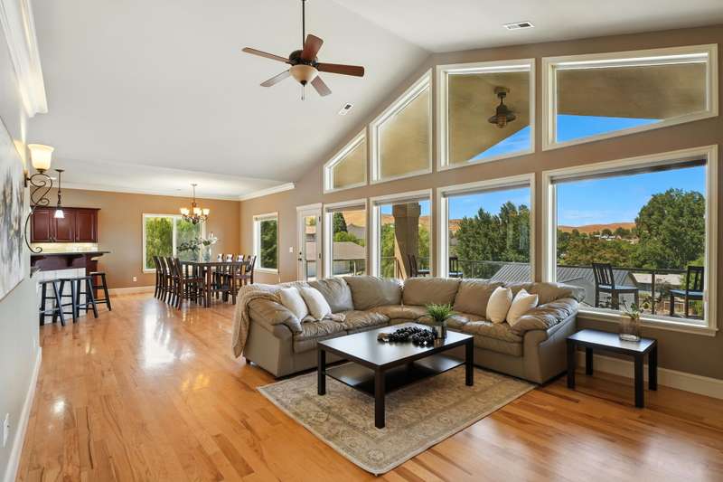 MLS# 285882 Welcome to 1306 Desert Cove, Prosser. This custom-built masterpiece offers stunning, panoramic views of the mountains, city lights, and lower valley. Nestled in an exclusive area, this home is the perfect balance of elegance, comfort, and functionality. From its energy-efficient design to its breathtaking vistas, this property is truly one-of-a-kind. As you approach, you'll notice the side-load garage, which adds to the curb appeal. Step inside to the main level, where open-concept living effortlessly connects the kitchen, dining, and living areas, creating a seamless flow that is perfect for both relaxing and entertaining. Walls of windows frame the picturesque views, allowing natural light to flood the space and bring the outdoors in. Whether you're enjoying a glass of wine from the famous Valley wineries or simply taking in the views, the expansive covered deck off the living area or the covered patio off the family room below provides the ideal setting for gatherings. The gourmet kitchen boasts granite countertops, ample cabinetry, and appliances, all of which stay with the home. The dining area can accommodate a large, oversized table for all your entertaining needs. The living room features soaring vaulted ceilings and a door that opens to the covered deck. Down the hall, you'll find the primary suite, a serene retreat complete with a spacious walk-in closet and a full bath that includes a jetted tub, a separate shower, and a double vanity sink. A secondary bedroom and a 3/4 bath are also conveniently located on this level, along with the laundry room that features a folding counter, and door that leads to the garage. The side-load garage is spacious and offers built-in storage. Downstairs, you'll find a Mother-in-Law quarters or multi-generational living space, complete with a full kitchen, dining room, and open-concept living room. A door leads to the covered patio, perfect for outdoor entertaining. Two secondary bedrooms are situated off the living room, with a full bath conveniently located in the hallway. Additionally, a flex room offers endless possibilities with an additional washer/dryer hook up! Outside, the backyard provides a peaceful retreat to enjoy the expansive views of Prosser, with Mt. Rainier standing tall in the distance on clear days. This home offers much more than just a place to live, it provides an unparalleled lifestyle of luxury, comfort, and natural beauty.
