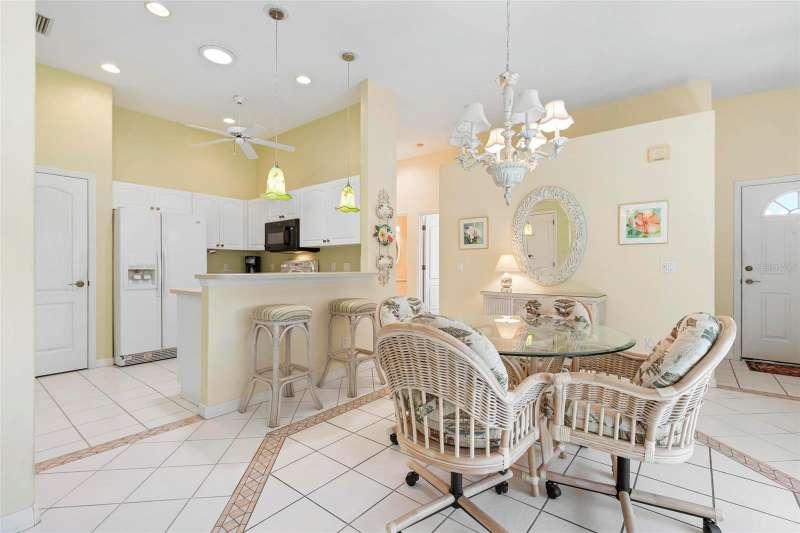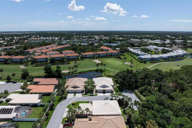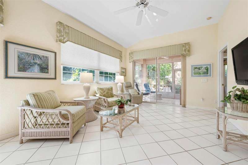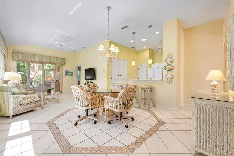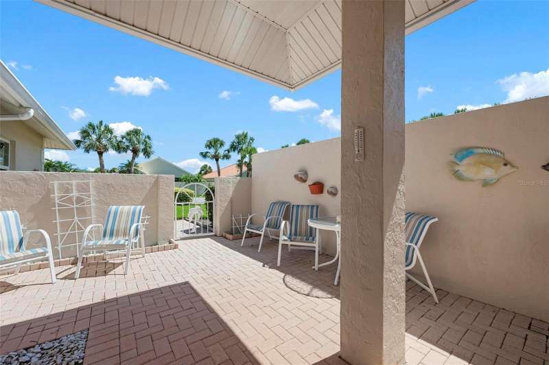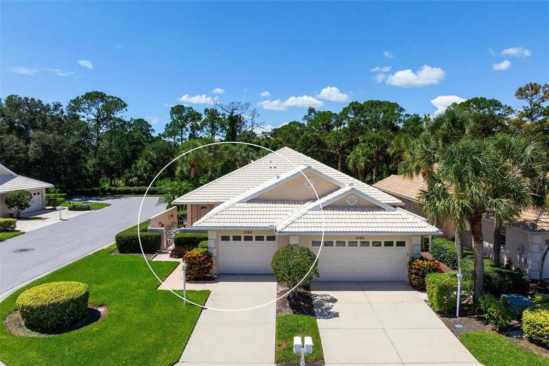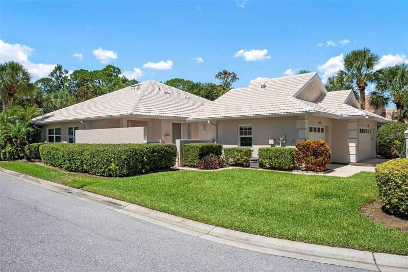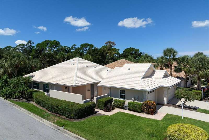 Check out this rarely available end unit in the Club Villas of Berkshire with a brand new roof! Imagine stepping into the quaint patio area welcoming you with its charm and cozy feel before you reach your two-bedroom two bathroom maintenance free villa. The vaulted ceilings create a spacious airy feeling. The kitchen, with a breakfast bar, tubular light and abundant storage anchor this home and opens to the dining and living rooms. Both spaces have an abundance of natural light! The split floor plan provides privacy for all. The main bedroom is located in the back of the unit with an en-suite with another tubular light, large walk in closet and beautiful bay window. The other bedroom located up front, has sliders with direct access the patio area. The private lanai out back offers views of lush landscaping and a park, and is the perfect place to relax. Equipped with vinyl sliders it can be used year-round! This unit also has a one car garage with built in storage. AC 2020, Impact windows, Roof 2025, gas generator, 2024 exterior paint. Enjoy this quiet gated neighborhood with community pool and a private road with sidewalks. Or make use of pool, tennis, pickleball and club house at Waterford's main facility. Location is everything with quick access to I75, SMH, shopping, dining and beautiful beaches.