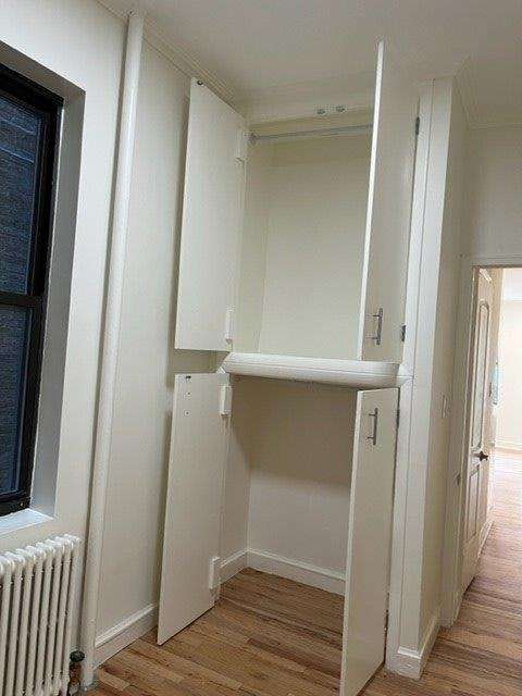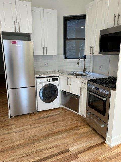 The apartment features beautiful hardwood floors, exposed brick wall, decorative fireplace, high ceilings with recessed lighting, beautiful kitchen with white granite counter tops, lots brand new cabinets, high end stainless steel appliances including dual washer/dryer, dishwasher and microwave. The living space is quite large with an open kitchen. Quiet bedroom in the rear of the unit.. The apartment faces north and does get excellent light. The newly renovated bathroom is beautifully tiled.