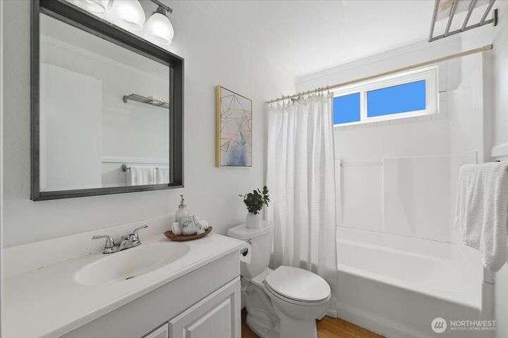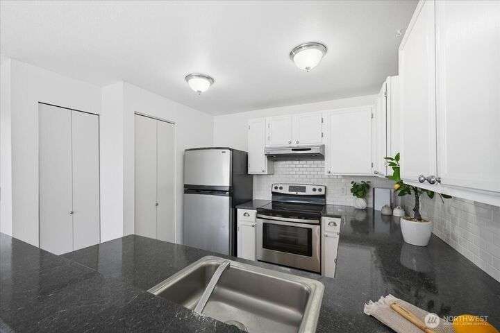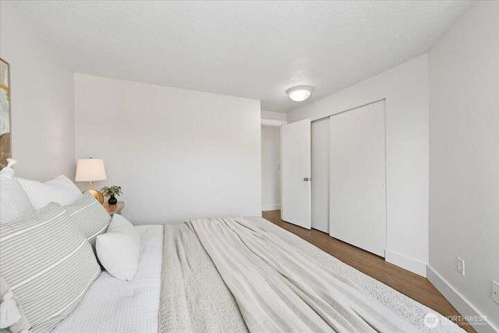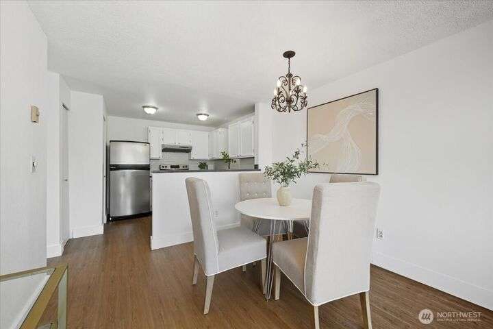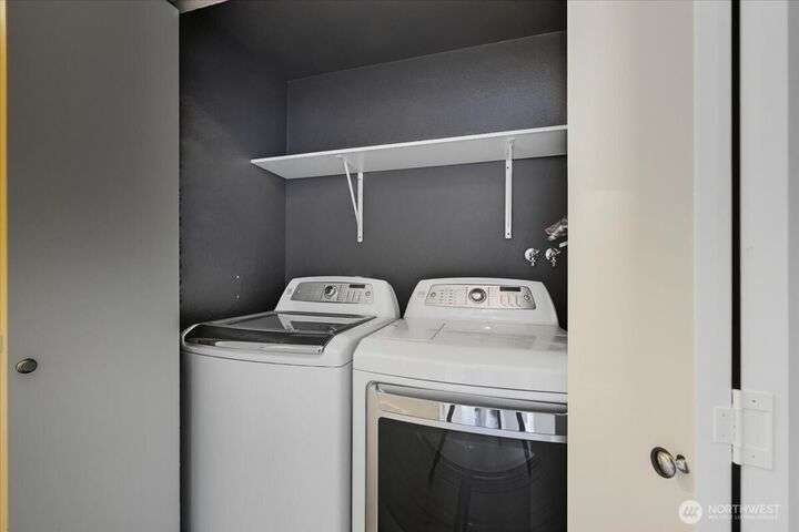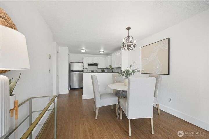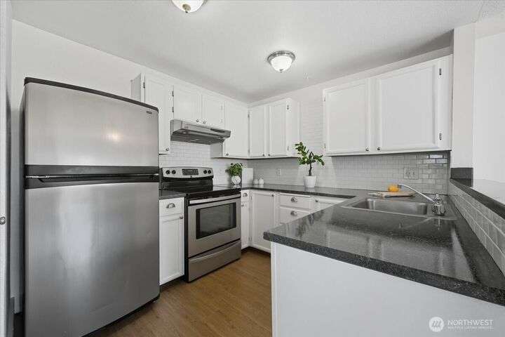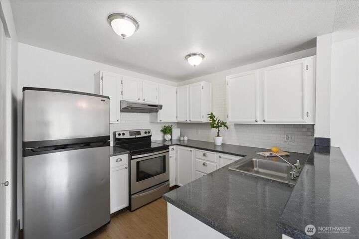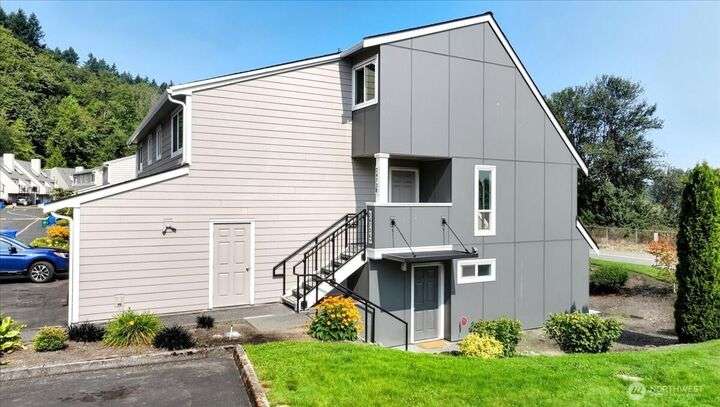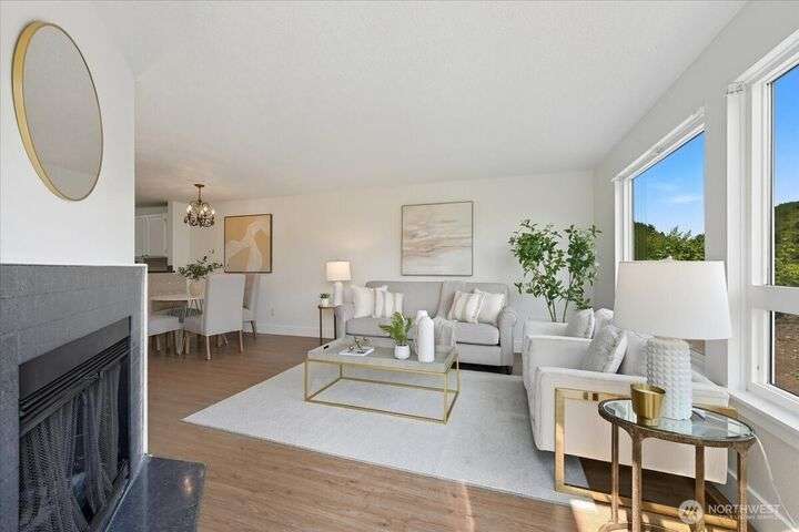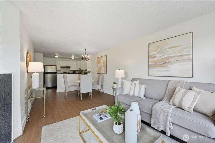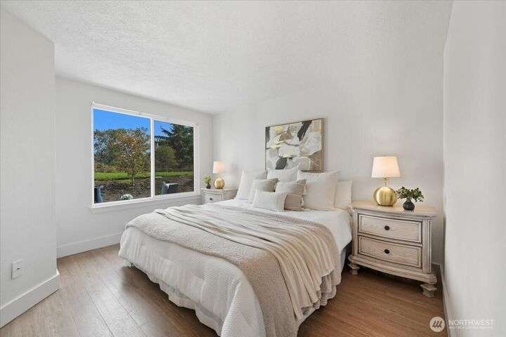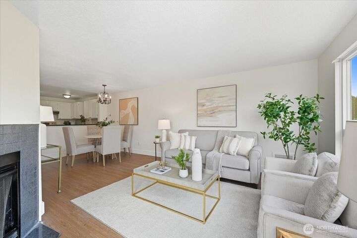Welcome to Westridge Townhomes! Stylish ground-level condo with private garden patio and garage. Open layout with stainless steel appliances, pantry, and breakfast bar. Bright living room with fresh paint, luxury vinyl plank floors, cozy wood fireplace, and sliding door to a landscaped patio. In-unit washer/dryer. Prime location near I-5, WA-167, shopping, parks, and golf. Community fully renovated in 2020 with new roof, siding, windows, patios, porches, garage doors, railings, paint, and lighting. Two parking spots, no rental cap. Two pets allowed.