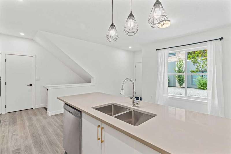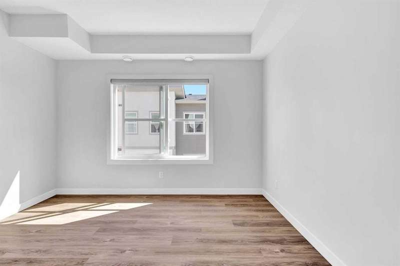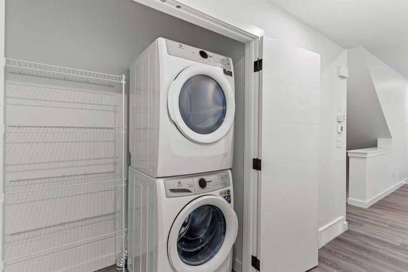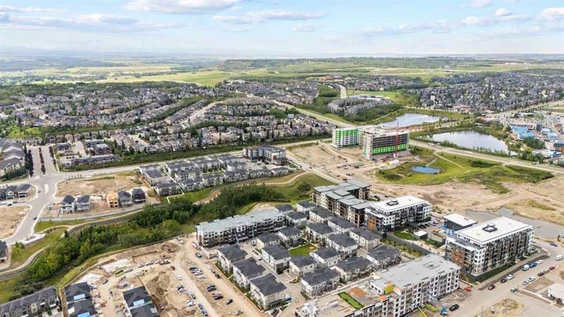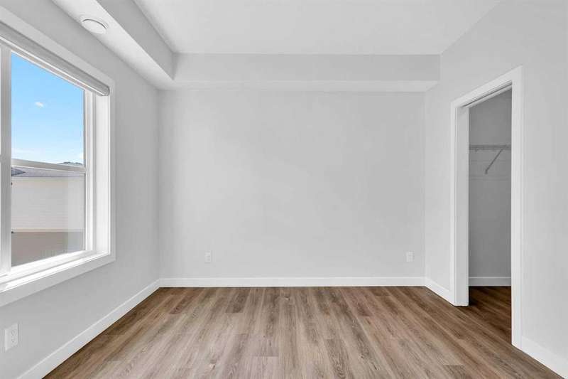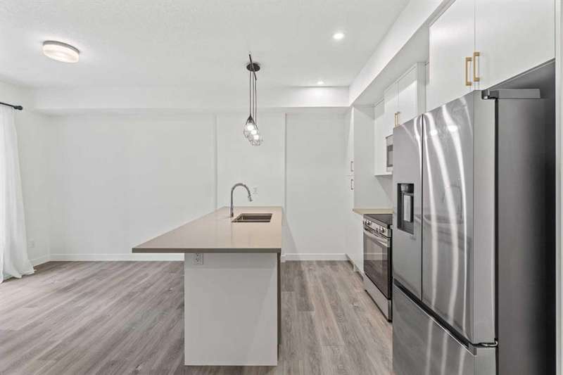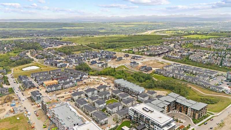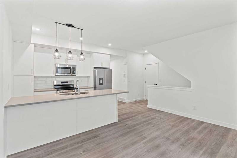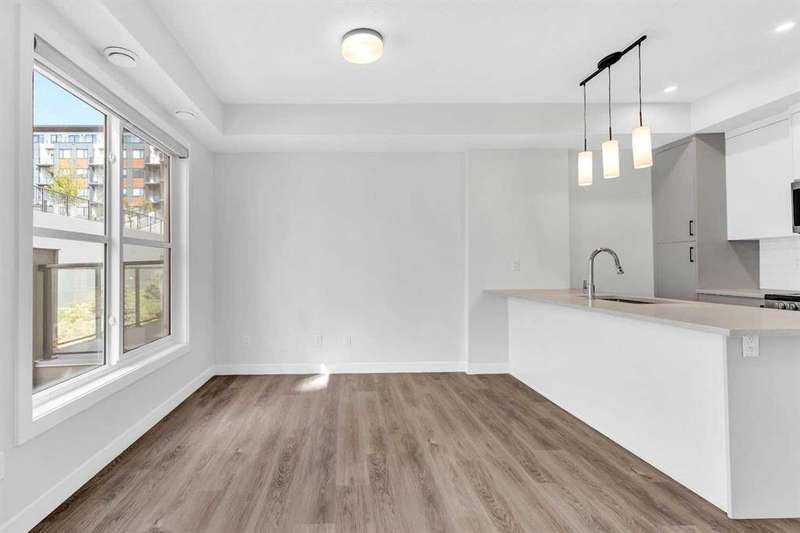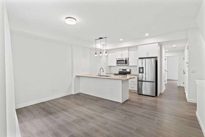 This modern designed 2 beds, 2 baths, and attached tandem garage, stacked townhouse unit on the MAIN FLOOR with spacious PATIO! The open-concept bungalow-style main floor features 9' ceilings, double pane glazing windows, and luxury vinyl plank flooring throughout the kitchen, living, dining area, bathroom, & entire bedroom. You will see a huge storage space, a utility room with a high-efficiency furnace, & a water tank on the lower level. The European-inspired kitchen features Quartz countertops, a Microwave Hood fan, High-quality cabinets, Soft-close doors, Drawers, Backsplashes, Stainless-steel appliances, and the front load washer & dryer. The newly completed Elkwood Townhouse offers affordable luxury & convenient living, close to Aspen Landing Shopping. Bordered by a natural environmental reserve & walking trails that connect throughout the community, it is a perfect location for active living & relaxation. Built by Slokker Homes, a quality builder since 1935, these homes offer the best value in Aspen and Springbank Hill.