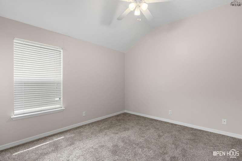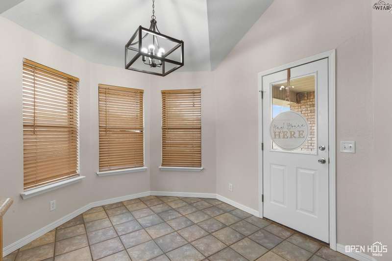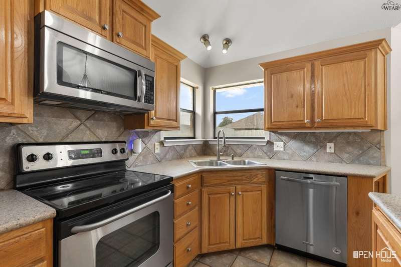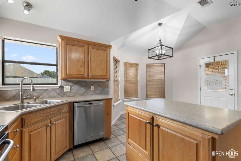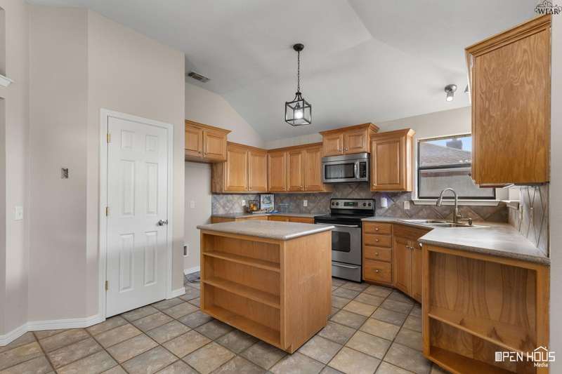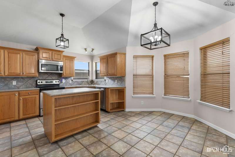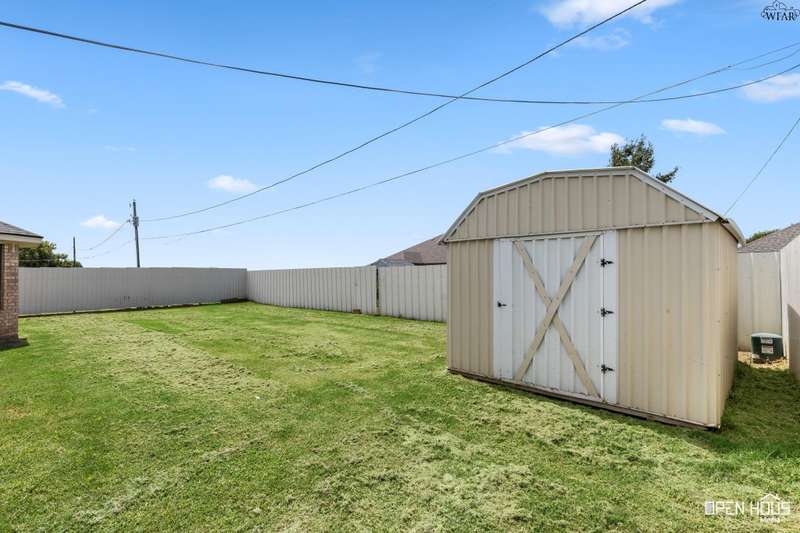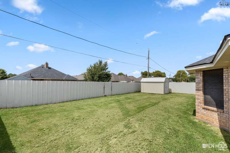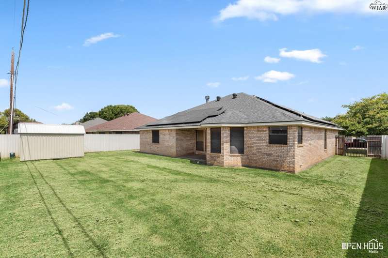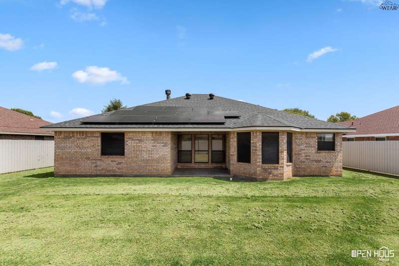 Light and bright, neat and clean! Open concept with energy efficient solar panels to convey. Living area features a wall of windows to the back yard, wood-burning fireplace with built-in shelving on each side. Kitchen corner sink window has a pantry and center island that moves to fit your needs. Isolated primary suite with garden tub, double vanity and 2 walk-in closets. Metal fence. Just minutes from Burkburnett HS and SAFB. Recent carpet, paint, ready for your family to enjoy! Please continue to show!