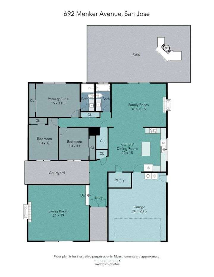 Spacious and beautifully updated home that features gleaming hardwood floors, tile appointments and high ceilings. Ideal for both elegant entertaining and relaxing with friends, the home begins with a bright, formal living room and then continues to an expansive great room, which includes a dining area, granite appointed kitchen with island and an inviting family room. Kitchen features gas range, abundant cabinets plus a large pantry. A secluded courtyard off the dining area is ideal for morning coffee. 3 bedrooms and 2 baths, including a primary suite. Private backyard with patio, barbecue area. numerous fruit trees. Solar (owned). newer roof plus air conditioning. Campbell school district (buyer to verify) Close to downtown Willow Glen or Pruneyard with easy access to commute routes.