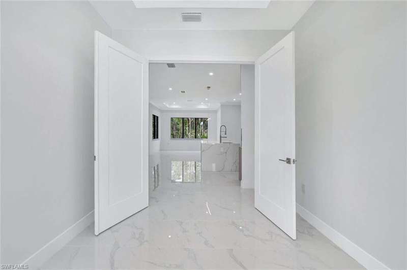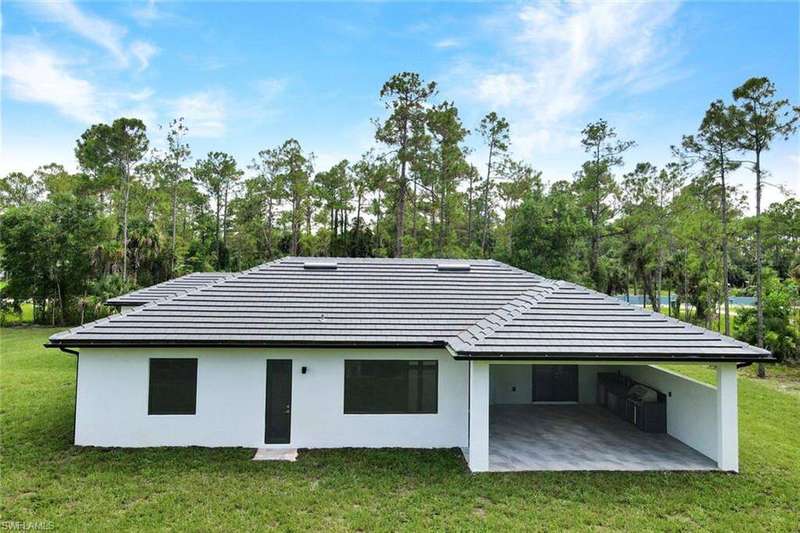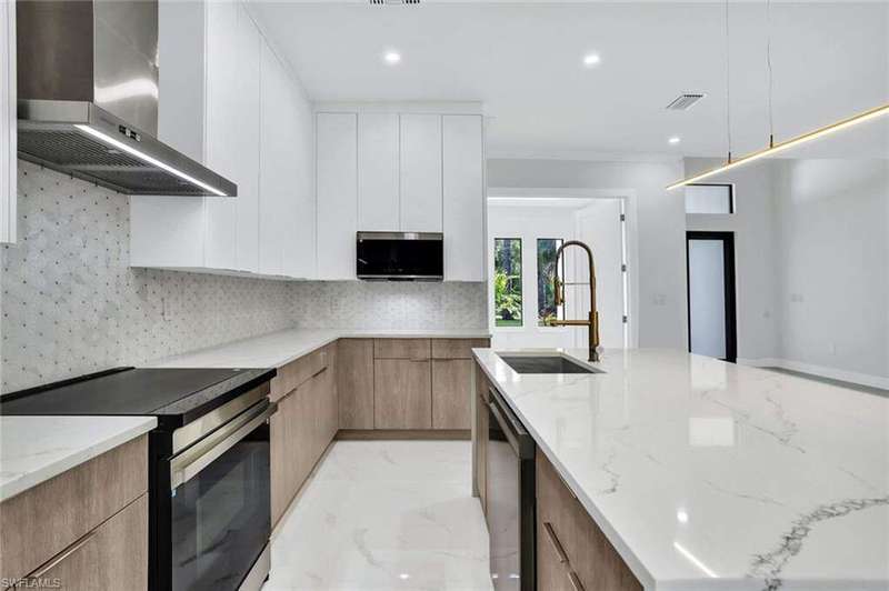 This property is 100% uplands and sits in an exceptionally prime location just off Wilson Boulevard. Surrounded by other beautiful homes, it offers the perfect setting to build your dream residence in one of the most desirable areas of Golden Gate Estates. Inside, the home showcases a stunning modern kitchen with sleek white upper cabinets and warm wood-tone lowers, creating a sophisticated two-tone design. Expansive quartz countertops with waterfall edges and a full-height designer backsplash add a touch of luxury, while the oversized island with a contemporary gold pull-down faucet blends style and function. High-end stainless steel appliances, recessed lighting, and a minimalist pendant fixture complete this bright, open space-perfect for everyday living and entertaining. The master bathroom is equally impressive, featuring floor-to-ceiling tile, a luxurious free-standing tub, and dual showers, creating a spa-like retreat within your own home. The home also boasts a huge outdoor lanai with a fully equipped outdoor kitchen, ideal for gatherings and enjoying the Florida lifestyle year-round. A thoughtfully designed residence that balances modern elegance with timeless comfort in an exceptional location.