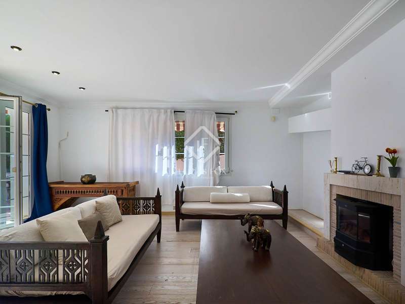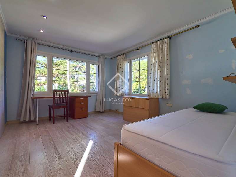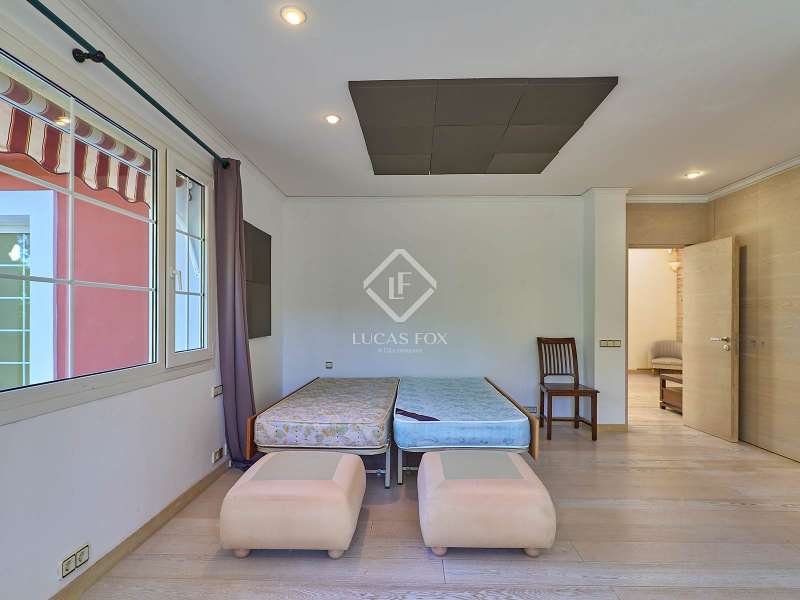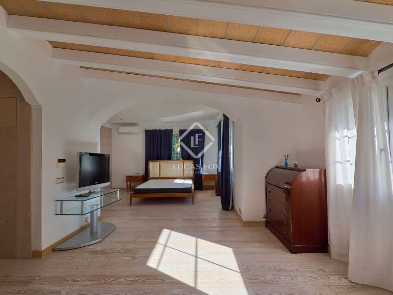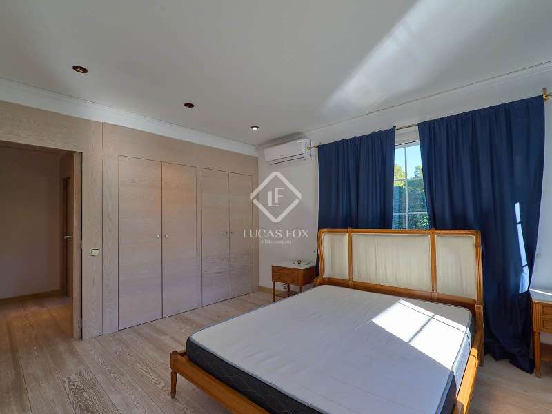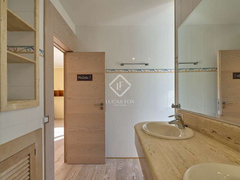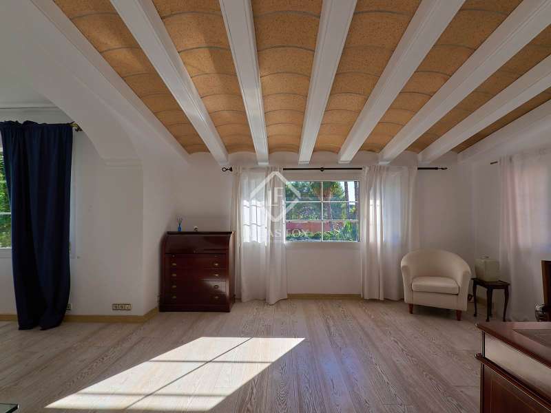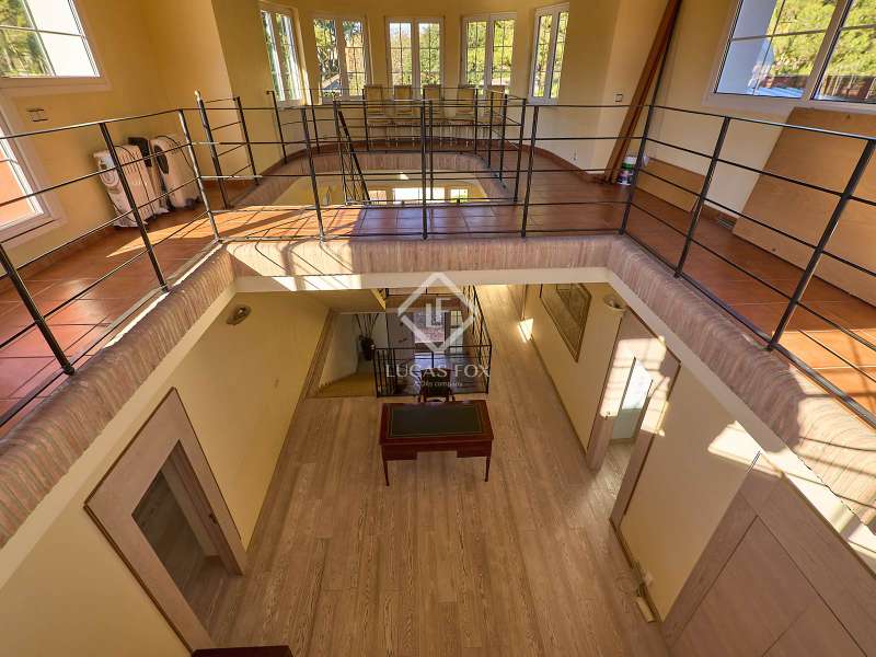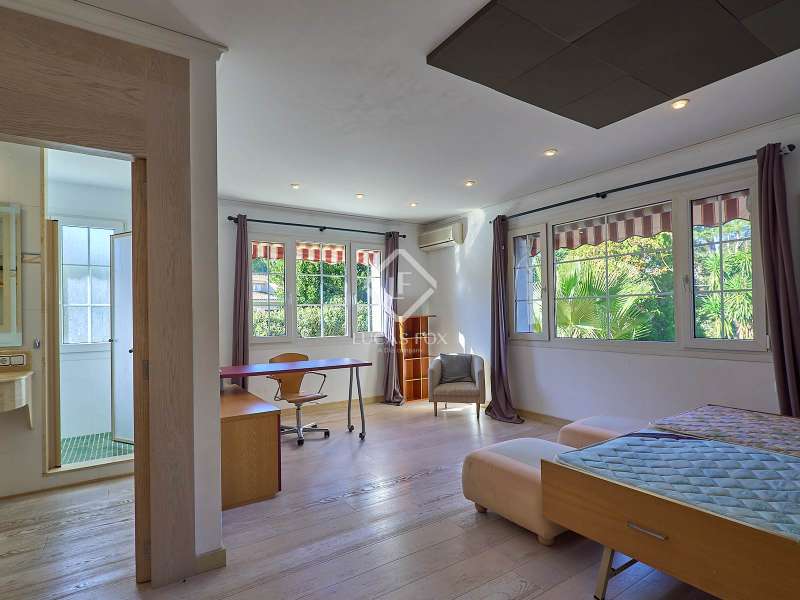 This majestic house offers a large entrance hall which is flooded with natural light thanks to the glazed viewpoint at the top of the house. After the hall is the spacious living area with 3 rooms and a fireplace, giving access to the terrace and pool. Both the terrace and the pool are south east facing, so enjoy sun most of the day. The kitchen also has access to the terrace through the laundry area and is located behind the living room. This is a very large kitchen with 2 pantries and space for a dining table. On the main floor we also find a guest area tucked away with 2 bedrooms, a bathroom and a living room or study. The rest of the sleeping area is located on the top floor that offers 4 bedrooms. The master bedroom is located above the pool and has a dressing room, living room, double bathroom with shower and a closet area. 2 of the bedrooms are connected through a double bathroom with a shower and both have a study area and fitted wardrobes. The third bedroom is a separate suite with bathroom and fitted wardrobes. The third floor is a basement that is at street level in some areas. It consists of a cellar, a very large room that can be a gym or a large lounge, a bathroom with a shower, a toilet and an entertainment room and / or games room.