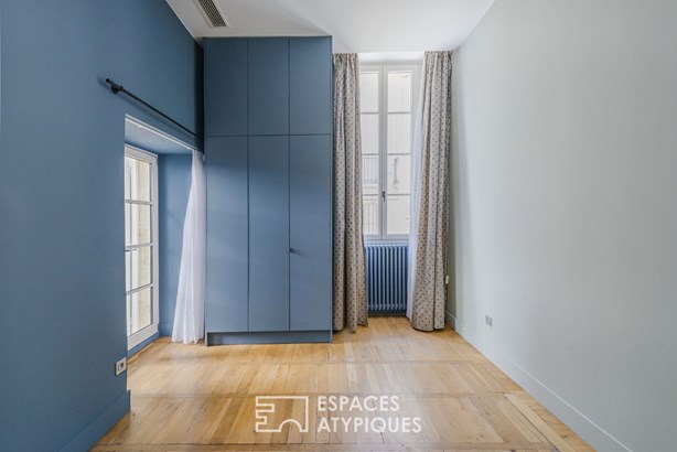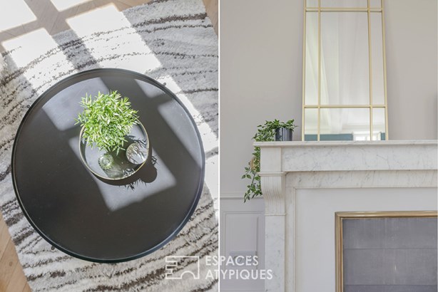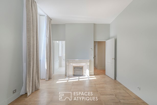 The 60m2 living room, benefiting from exceptional light with its double exposure and its view of the intimate courtyard, offers a beautiful functional marble fireplace, herringbone parquet flooring and a beautiful high ceiling.