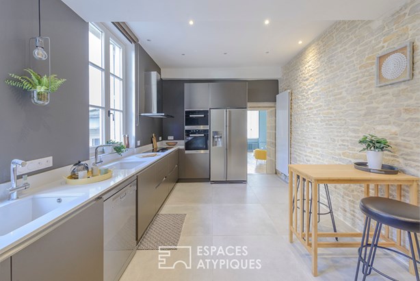 The modern, equipped kitchen is a real dining room, warm with its exposed stone wall.