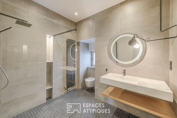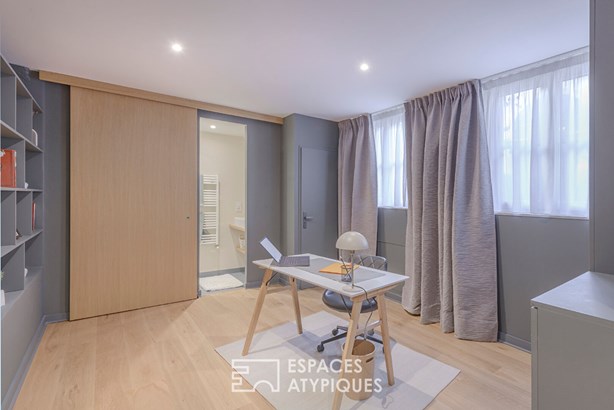 On the second level, a third suite with shower room offers its own independent entrance, suggesting a professional activity (guest room or office).