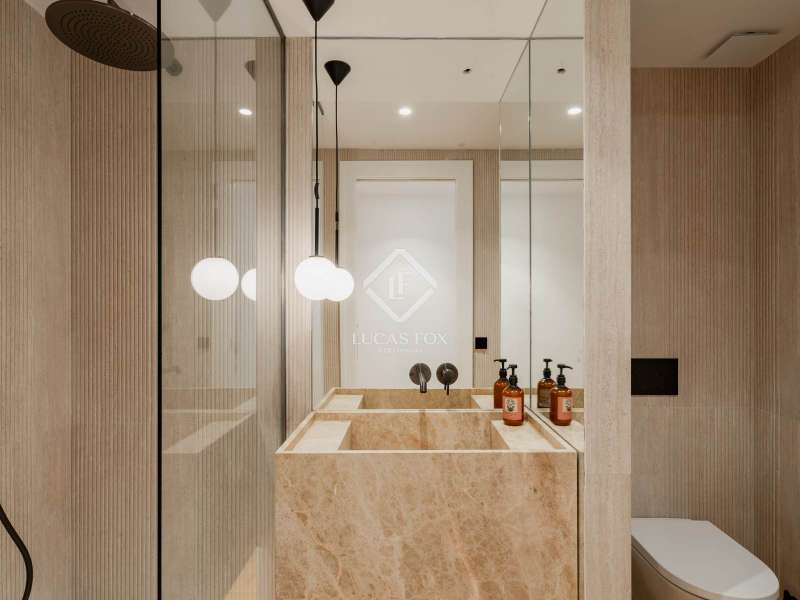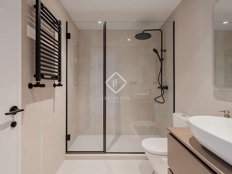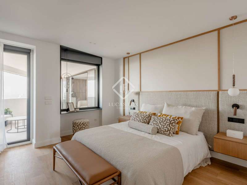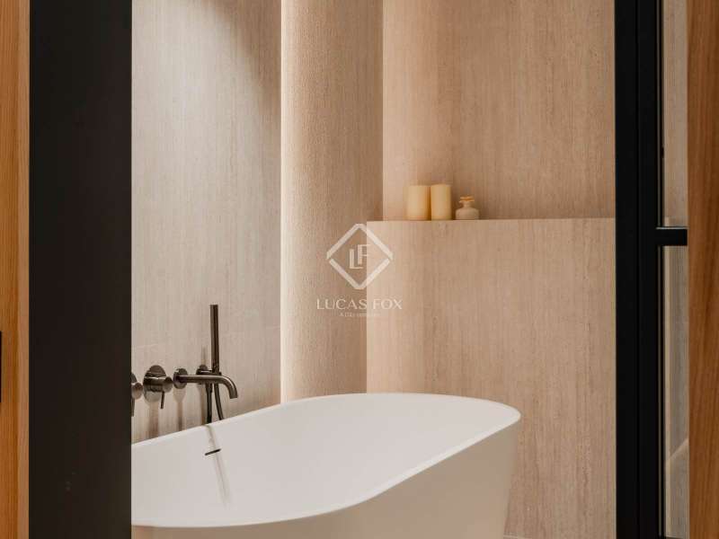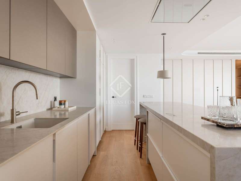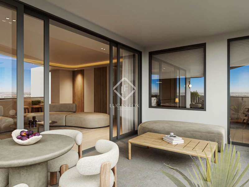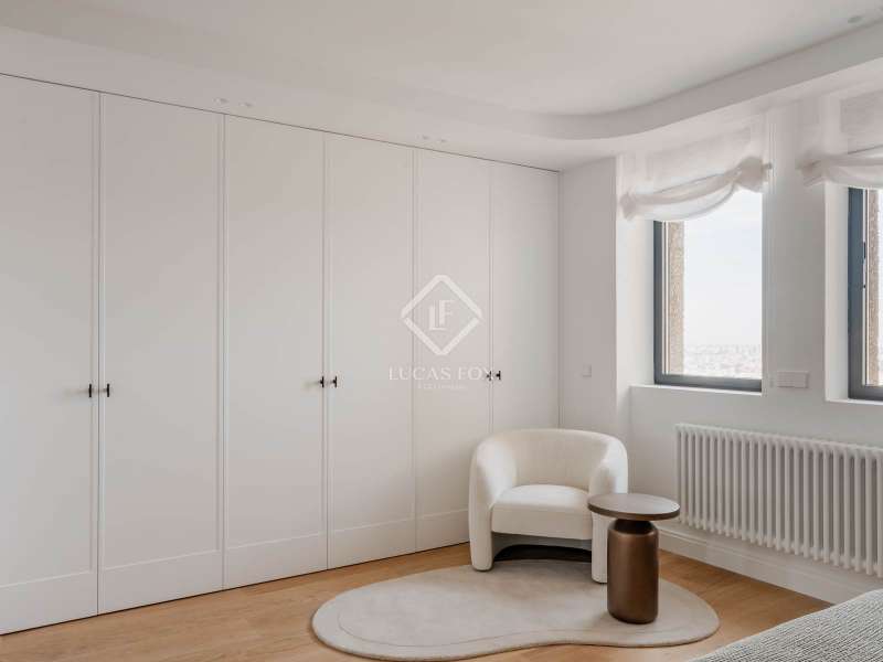 Lucas Fox presents this exclusive 283 m² penthouse on the 27th floor of the Torre de Valencia, the highest currently available for pre-sale in Madrid. The property is located on O'Donnell Street and offers unique panoramic views of El Retiro Park. It offers a comprehensive renovation project with delivery scheduled for September 2025. During the renovation, the original terrace was restored and transformed into a spectacular social space with landscaping, integrated vegetation, and custom furniture. The living area is organized as a large open space connecting the living room, dining room , and kitchen with a central island, equipped with high-end appliances and a separate laundry area . The private area features three bedrooms with private bathrooms and custom-made wardrobes, as well as a guest toilet. The main bedroom features a walk-in closet and a uniquely designed bathroom with a freestanding bathtub and natural stone pieces. The entire interior design, including furniture and decor, was designed exclusively for the property. The renovation features fine materials and a contemporary style that respects the tower's iconic spirit. Highlights include natural wood floors, CorVision aluminum frames, architectural lighting, and built-in faucets by Porcelanosa. The property includes a parking space, a storage room , and 24-hour doorman service. A one of a kind penthouse in the Madrid skyline, with unique light, height, and personality overlooking the Retiro Park.