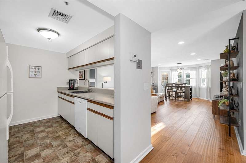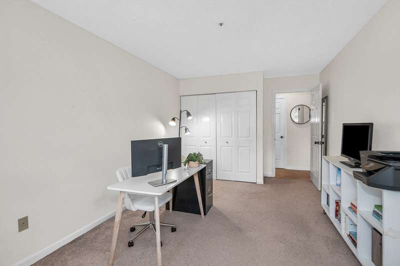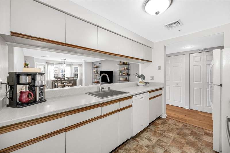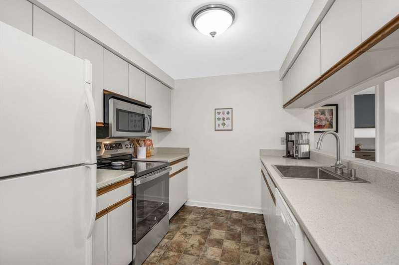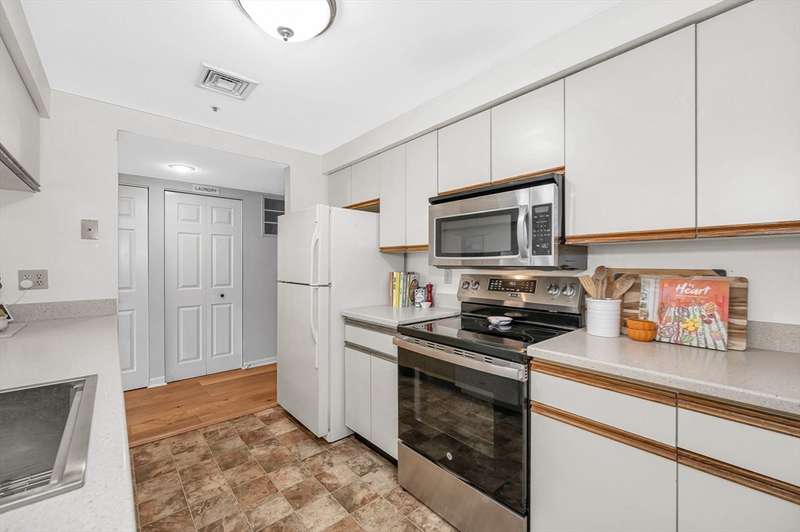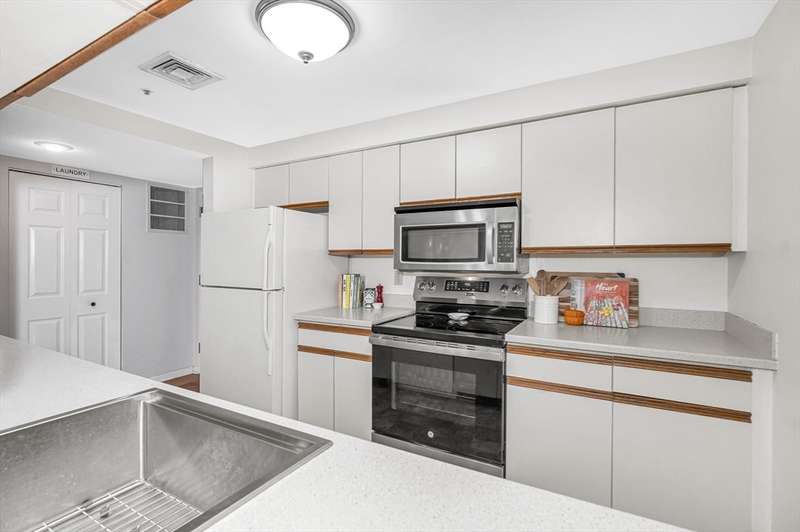 Newly Renovated SUTTON POND! This Stunning, Bright & Peaceful condo is tucked away from the hustle and bustle of it all, yet steps away from so many great restaurants, shopping & walking trails. Two Bedrooms (or One Bedroom and a Home Office as it is currently being used), Kitchen w/ new stove (2025) New Hot Water Heater (2025) New closet system in guest bedroom (2025) New Windows and Slider (2022-2024), Main Bathroom remodeled 2023) and a spacious Living Room/Dining Area with gorgeous, engineered Hardwood floors (2021). This sunny garden style condo, with its own in-unit washer/dryer has a prime location in the complex and in the building itself. In the building it is a corner unit offering more light, close to multiple entryways, mailroom and elevator! Easy drive up to the door, unload your packages & park in your assigned space. Comfort and Convenience at its BEST!