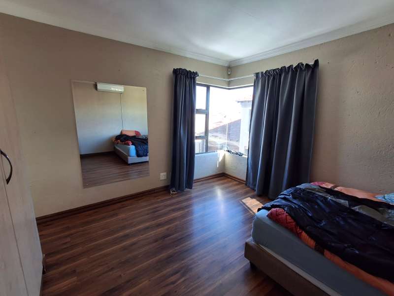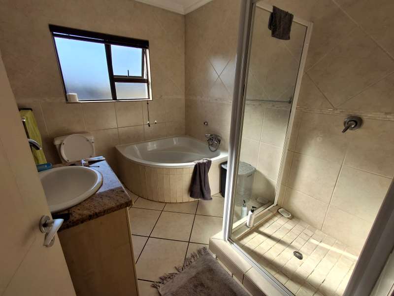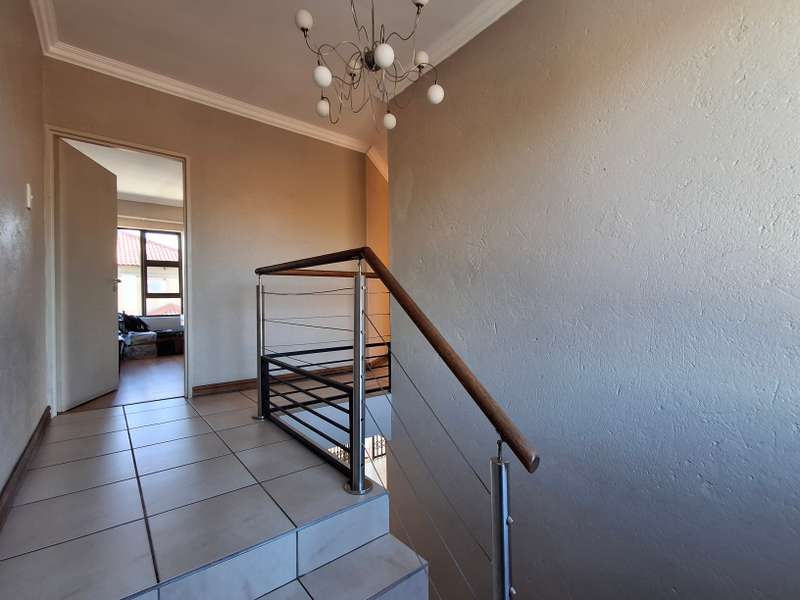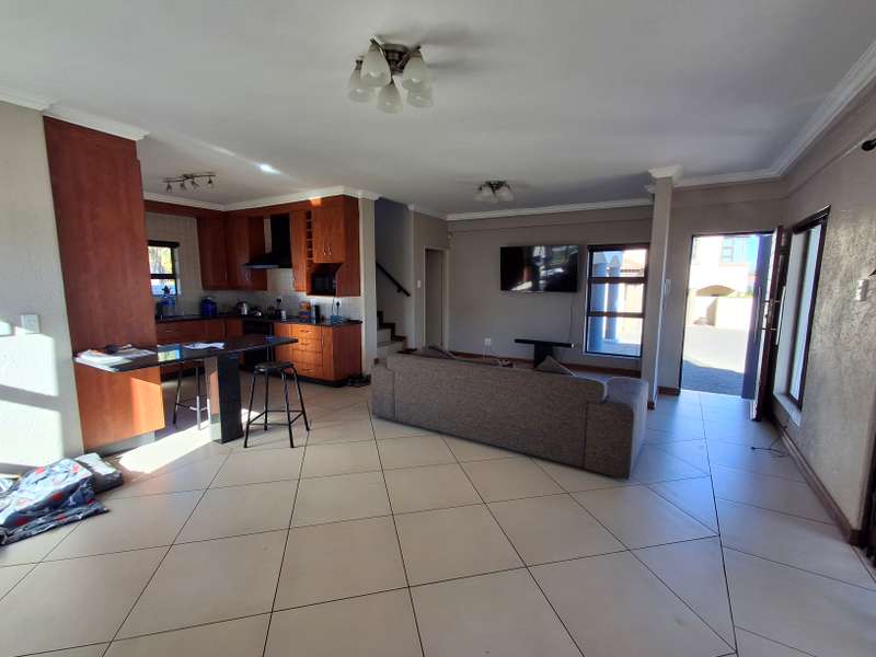 Modern and stylish double-story home located in a secure and sought-after complex. This well-maintained property offers three spacious bedrooms, all situated upstairs, featuring laminated flooring and built-in cupboards. The main bedroom includes a private en-suite bathroom, while the other two bedrooms share a neat and modern guest bathroom. Downstairs, the open-plan layout seamlessly connects the contemporary kitchen to the lounge and dining area. A guest toilet adds convenience for visitors. The lounge opens through a sliding door to a covered patio, complete with a built-in braai—perfect for entertaining. Additional features include a double garage with a wooden door, a spacious private yard ideal for children and pets, and a JoJo tank for water storage. The complex is child-friendly and offers a secure environment with easy access to main roads, schools, shopping centres, and other amenities. An excellent investment in an upmarket, centrally located area.