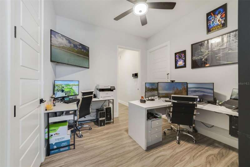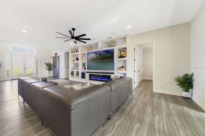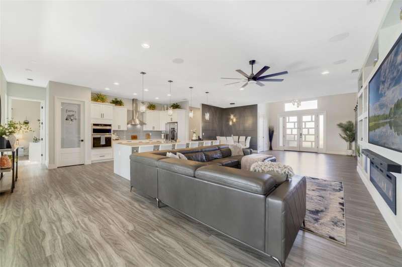 Welcome to modern living in the sought-after gated community of Water Ridge in Auburndale, where every home is CUSTOM CRAFTED and every view is a postcard! This 2023 BUILT single story **4 bedroom // 3 full bath // 2 offices + theater room** showstopper sits on a large .27 ACRE LOT with gorgeous WATER VIEWS and is packed with modern UPGRADES, smart tech, and access to RESORT STYLE AMENITIES. Step inside and fall in love with the bright OPEN FLOOR PLAN, high ceilings, and LUXURY VINYL PLANK flooring throughout. In addition to four generous bedrooms, this home also delivers two dedicated office spaces, a TOP-OF-THE-LINE THEATER ROOM with upgraded equipment (all installed in 2023), and three full baths – perfectly designed for everyday comfort and elevated entertaining. At the heart of the home, the home chef’s dream kitchen stuns with a massive 13’ QUARTZ ISLAND with a WATERFALL EDGE, built-in wall oven, stylish solid wood cabinetry topped with crown molding, an abundance of drawer and cabinet storage, and sleek pending lighting. The SAMSUNG FAMILY HUB REFRIGERATOR is a functional showpiece and the TP-Link Deco Whole House Mesh System (5 nodes) keeps everything connected. The living room impresses with a BUILT-IN MEDIA WALL featuring 100" TV with Surround Sound System (included with sale), a dramatic 72” ELECTRIC FIREPLACE (2024), and a modern fan, all anchored by a wall of sliding glass doors that open to the COVERED LANAI and FULLY FENCED backyard beyond. The SPLIT BEDROOM layout provides privacy, while your PRIMARY SUITE delivers fresh, modern vibes with luxurious finishes and a spacious en-suite retreat. Residents should know, Water Ridge isn’t just a neighborhood – it is a lifestyle! You will enjoy access to 3 LAKES, 5 GATED ENTRANCES, 3 BOAT DOCKS, boat trailer storage, and 3 POOLS (two leisure, one lap). The clubhouse, fitness center, men’s and women’s saunas, sports courts, and pickleball and tennis facilities make every day feel like a vacation. Plus, with onsite HOA management, the community is as well maintained as it is beautiful. **BONUS: ASK US ABOUT THE ASSUMABLE 4.875% MORTGAGE!** Whether you are seeking privacy, luxury, or an active lakefront lifestyle, Water Ridge offers it all just minutes from major highways and central to everything in Polk County. Call today to schedule a tour!