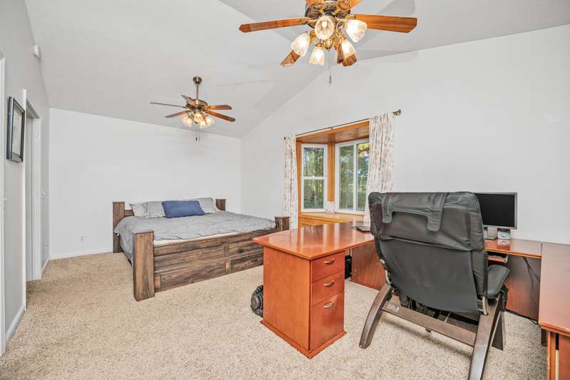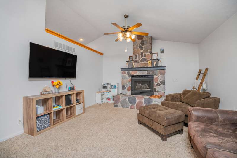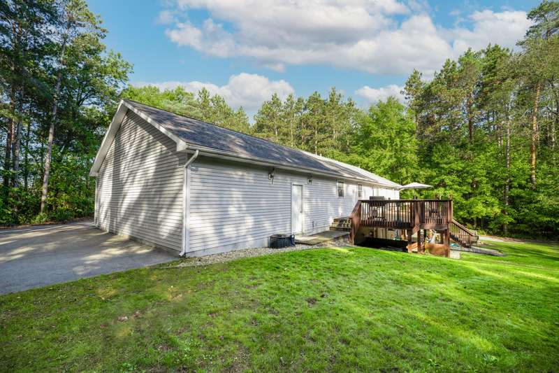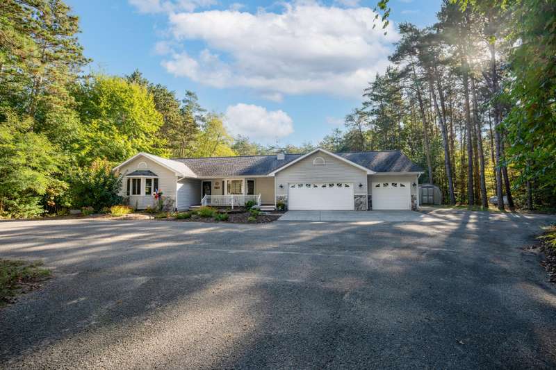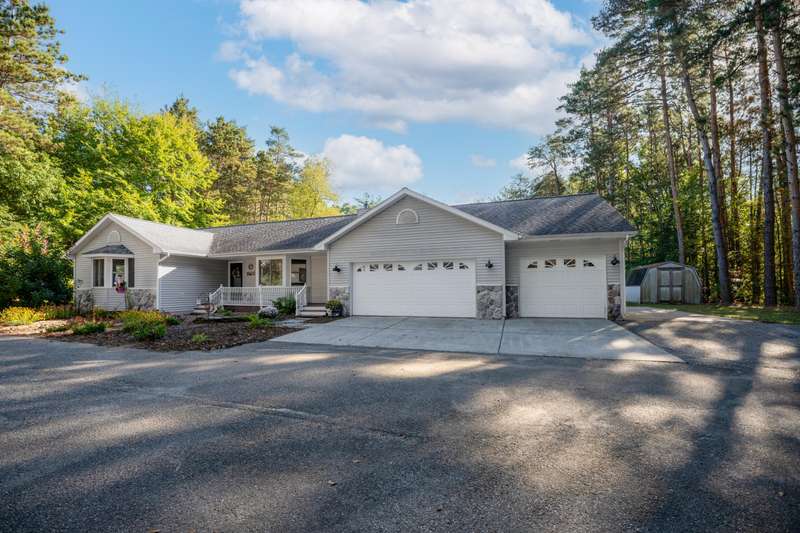 What a beautiful setting to greet you each time you arrive home. Every season brings picture perfect moments. Enjoy the large yard surrounded by woods for all sorts of activities and tranquility. This 4BR, 3 full Bath ranch style home provides spacious living with its vaulted ceilings and open floor plan. The Living room has a bay window overlooking that gorgeous front yard as well as a gas fireplace. This flows nicely to the Dining area with sliders to the deck that follows along the length of the home. The Kitchen connects to an ideal mud area with custom built bench including cubby spots for shoes, then into a large walk-in pantry. The 3 car garage has an extended area behind the 3rd stall to its workshop area. The primary suite is generously sized to allow for office space if desired. It includes a bay window, walk-in closet, and large bathroom with whirlpool tub and walk-in shower. A second bedroom and full bath rounds out the main floor. The walk-out level features an equally spacious family/recreation room. Want to have a movie night? You can, because of the way this room is situated, it can easily be converted to serve that purpose. There are two more bedrooms, one with a walk-in closet; a full bath; two sets of ample storage rooms; and a large laundry room with built in ironing board. Out front there is a circle driveway and lots of parking. Nearby you can visit Deer Tracks Junction; Lone Tree Stables; Grattan Raceway; Campgrounds; Parks; Golf courses; and so many other places. What a great opportunity that you won't want to miss out on.