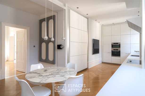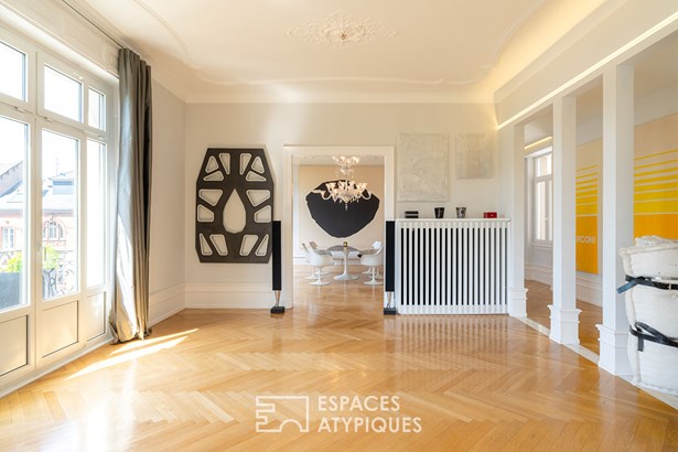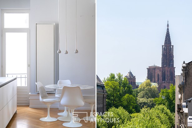 The entrance opens onto a long corridor that already hints at the atmosphere of the place. Solid parquet flooring, high ceilings, noble materials, mouldings and wood panelling - the vocabulary is that of last century's bourgeois lifestyle, underlined by immaculate tones and particularly elegant lighting effects. The vast double living room is bathed in light thanks to its many windows and six balconies offering uninterrupted views of the Cathedral and the verdant Parc du Contades. The dining room is an extension of this, inviting you to share moments of conviviality. The Bulthaup dining kitchen boasts clean lines and top-of-the-range finishes in perfect harmony with the spirit of the place.